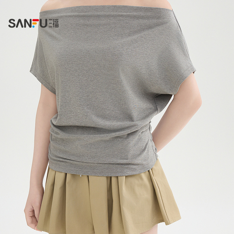 【2026夏季新款】三福一字肩短袖T恤,纯色设计显气质,荡领收腰版型修饰身材,舒适透气适合日常穿搭。淘金币可用,性价比高!