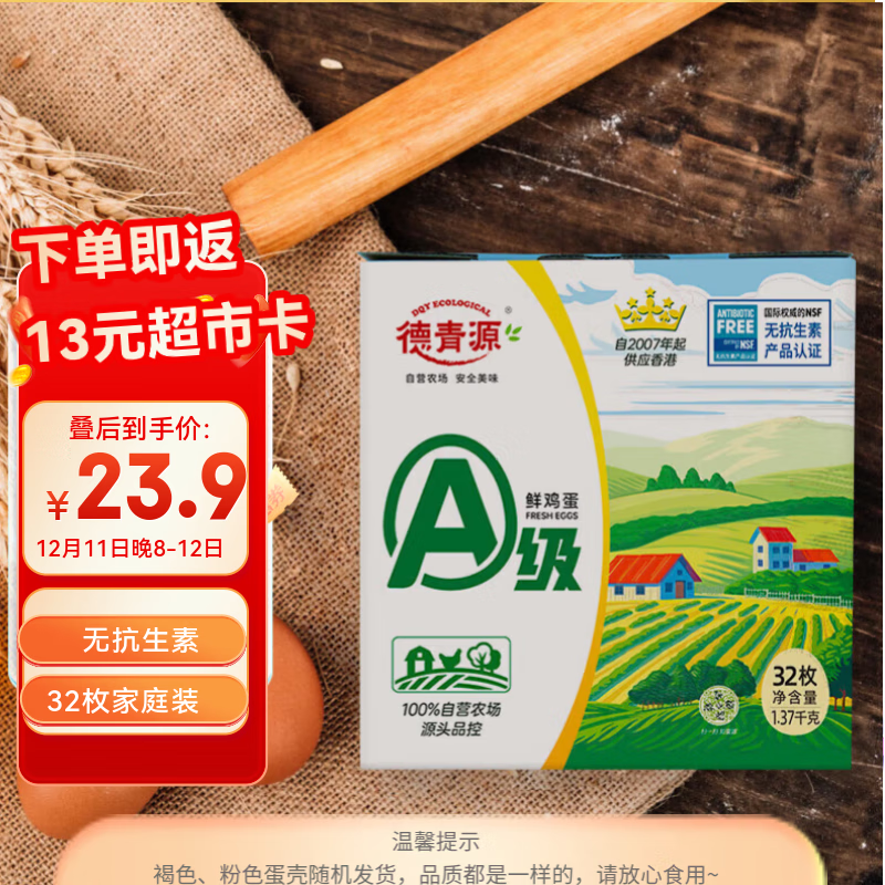 德青源A级鲜鸡蛋32枚2.74斤起无抗生素 谷物喂养 营养早餐家庭礼盒