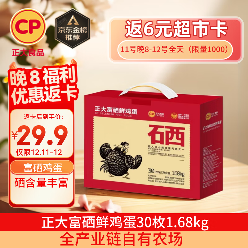 CP 正大 富硒鲜鸡蛋 30枚 3.36斤 无抗生素 优质蛋白 礼盒装