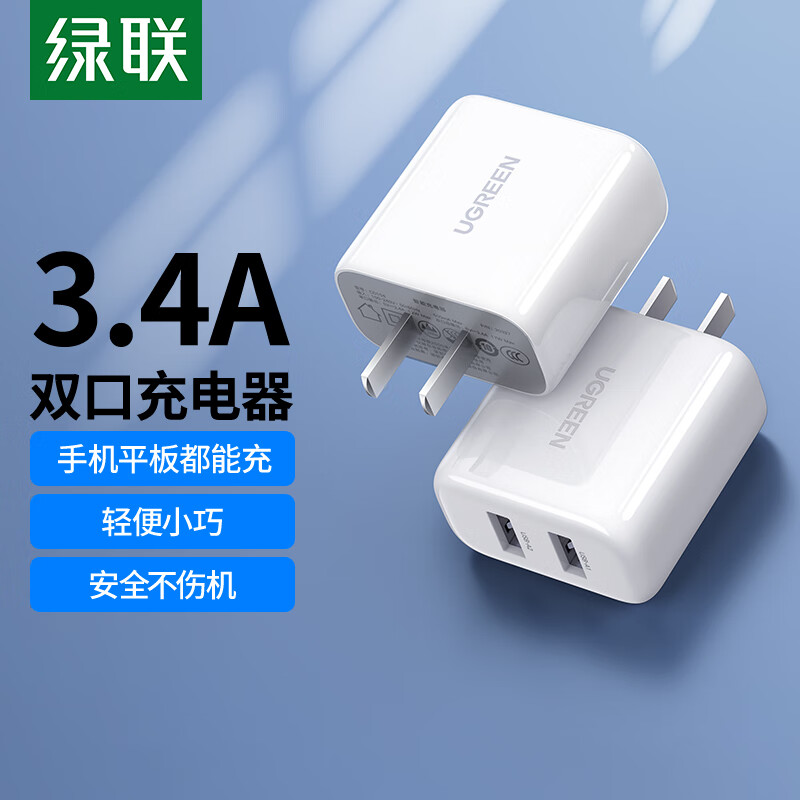 绿联充电头器双口USB插座头5V2A/1A多口充电头直插充电器 适用苹果17/16华为小米手机iPad平板手表 【17W】双口USB充电头-白色
