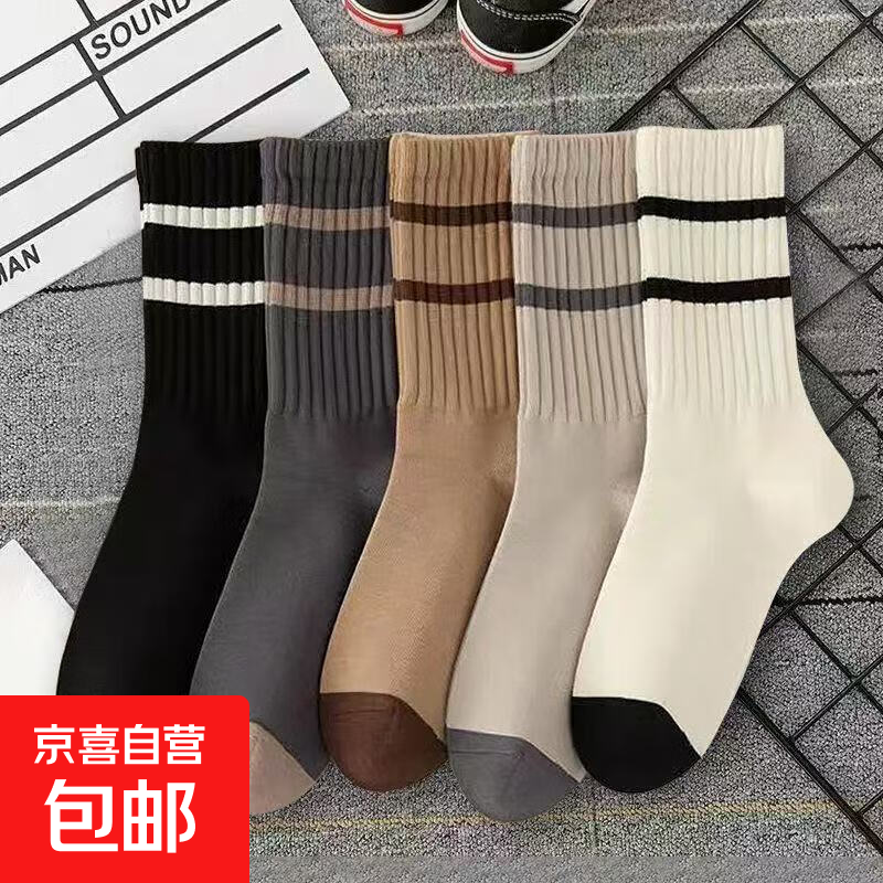 中筒袜拼色女士堆堆袜条纹高筒袜纯色长筒袜日系堆堆袜子女 随机发三双共3双 日系双杠 均码