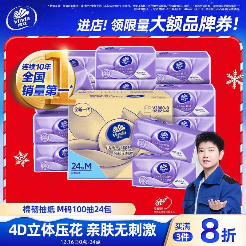 维达(Vinda)抽纸【孙颖莎推荐】棉韧3层100抽*24包M码 餐巾纸纸抽 纸巾 整箱