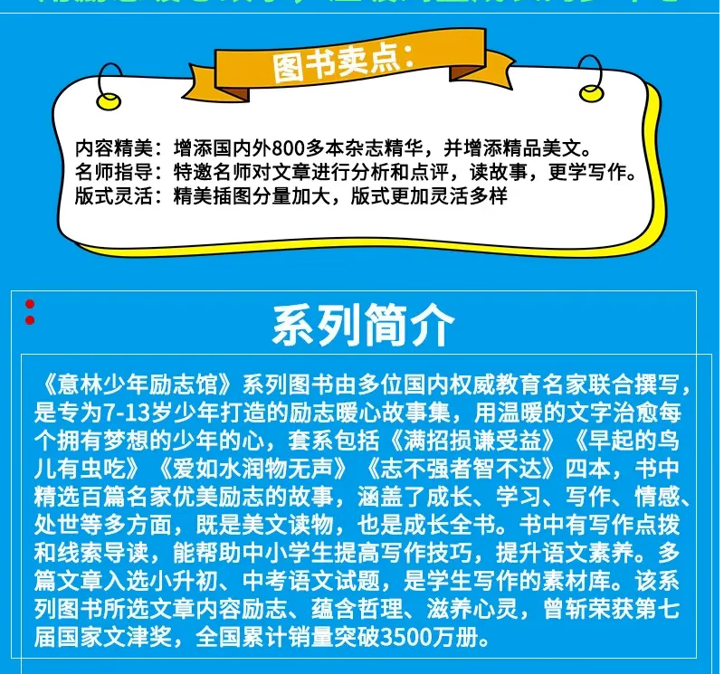 意林少年励志馆鸣志系列(白金馆)挑选出精华文章集结出版,实现名师点评等五大升级,完成了阅读到写作的完美过渡。 本书精选有关成长、立志等塑造孩子坚韧品格方面的多篇佳作,为孩子成长导航助力。 意林少年励志
