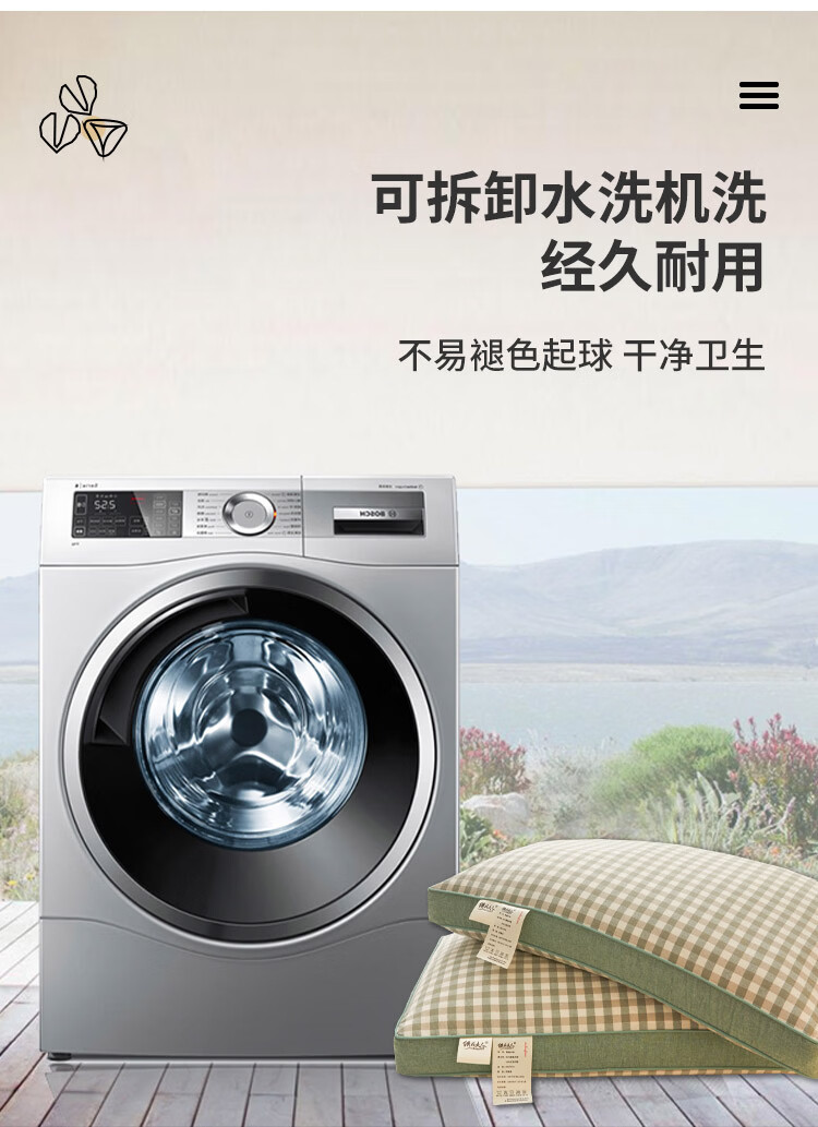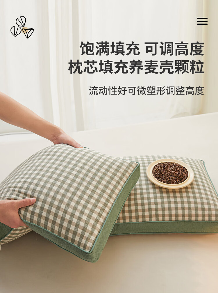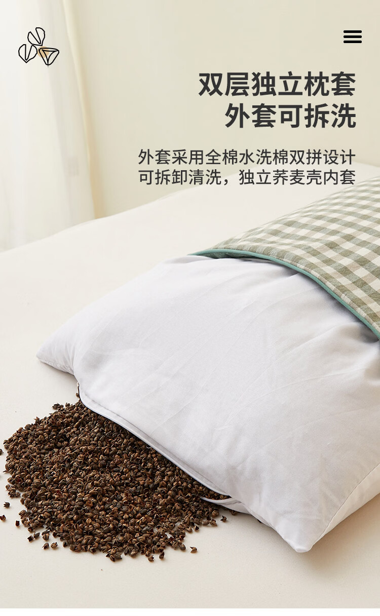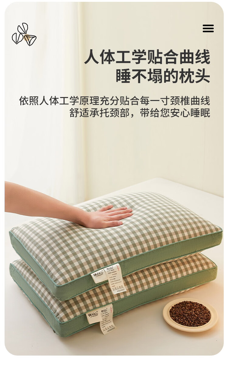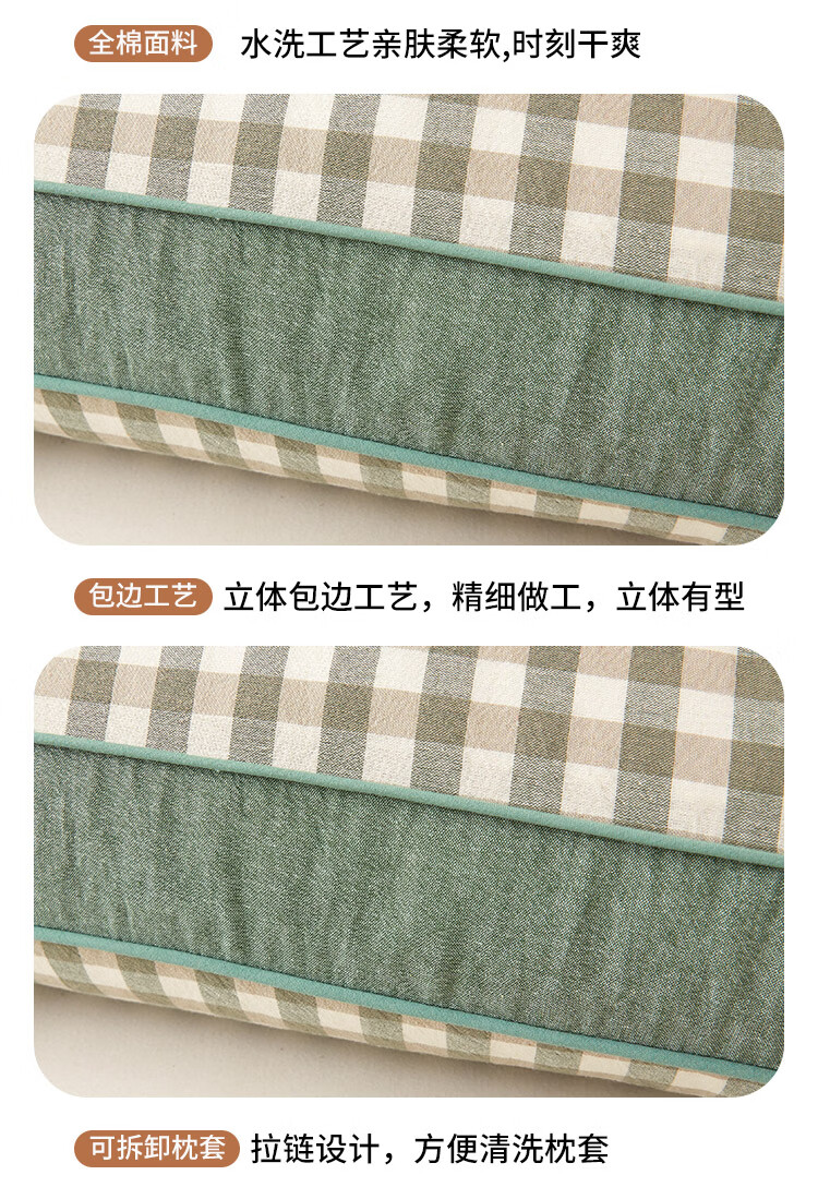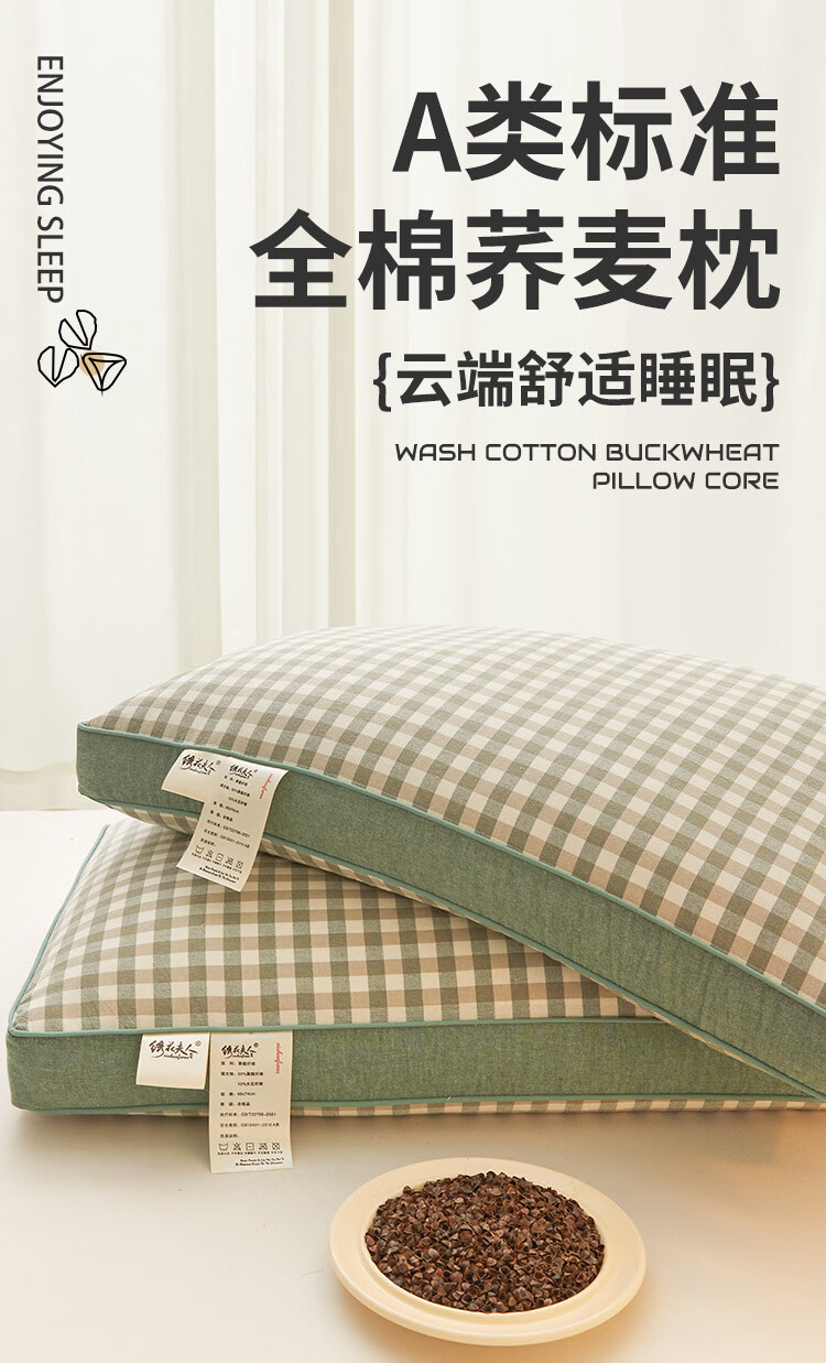 南极人(Nanjiren)可拆洗全棉荞麦枕头护颈枕睡眠颈椎病睡觉专用枕芯一对枕头成人 全棉荞麦枕-绿小格【28*48cm 单只装】