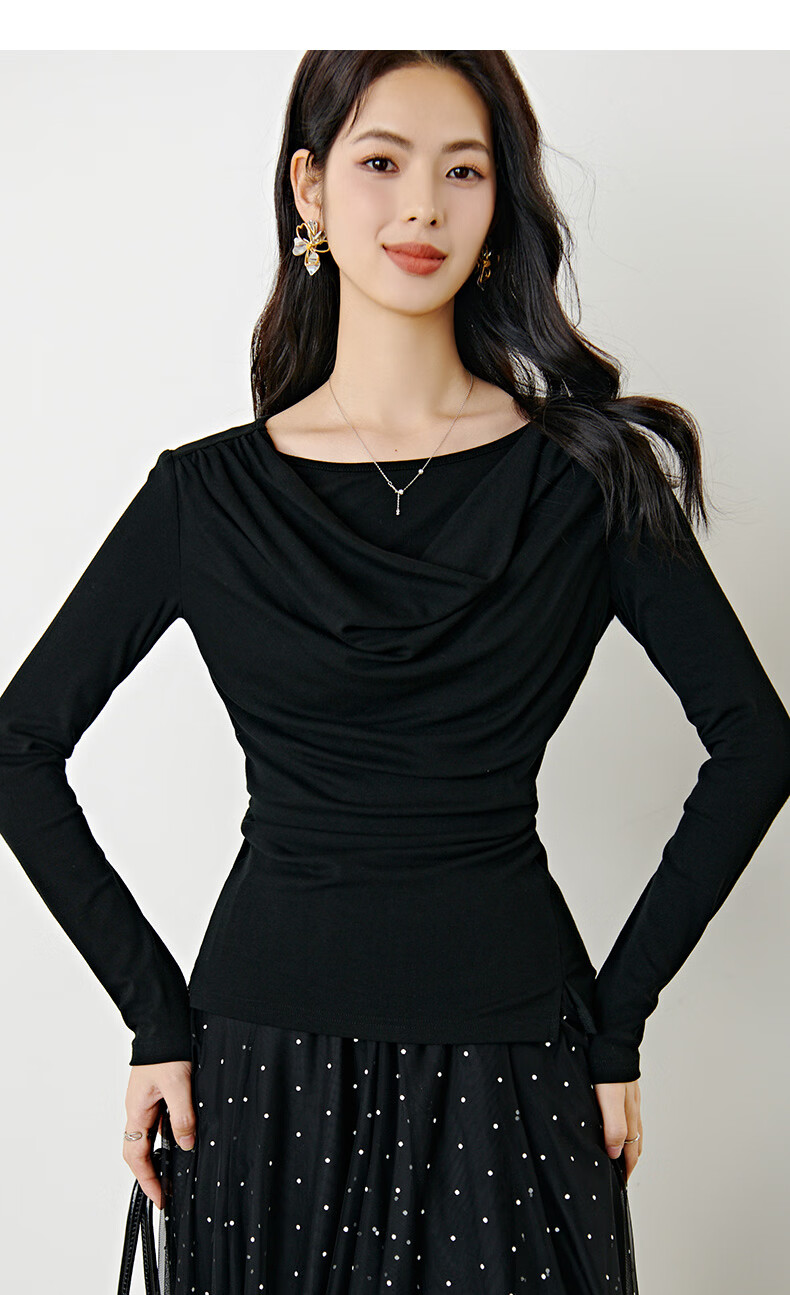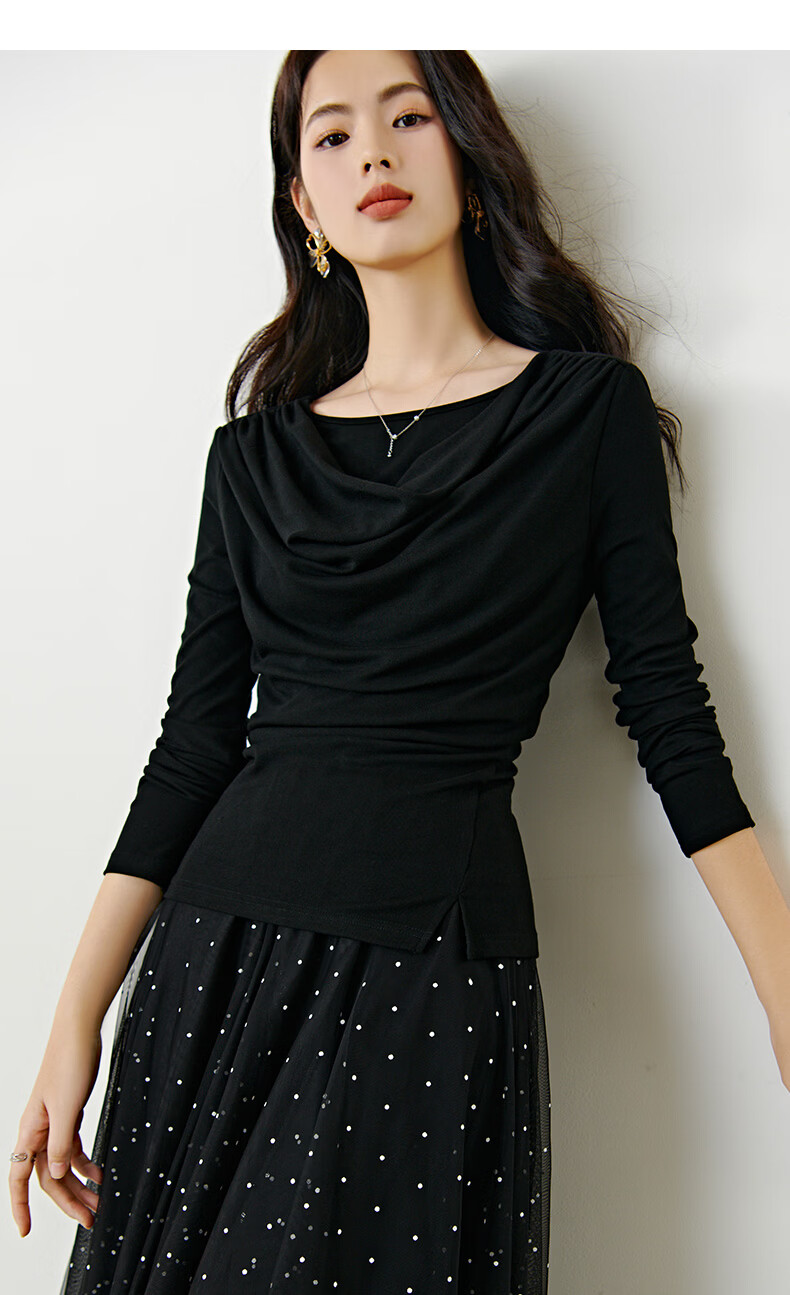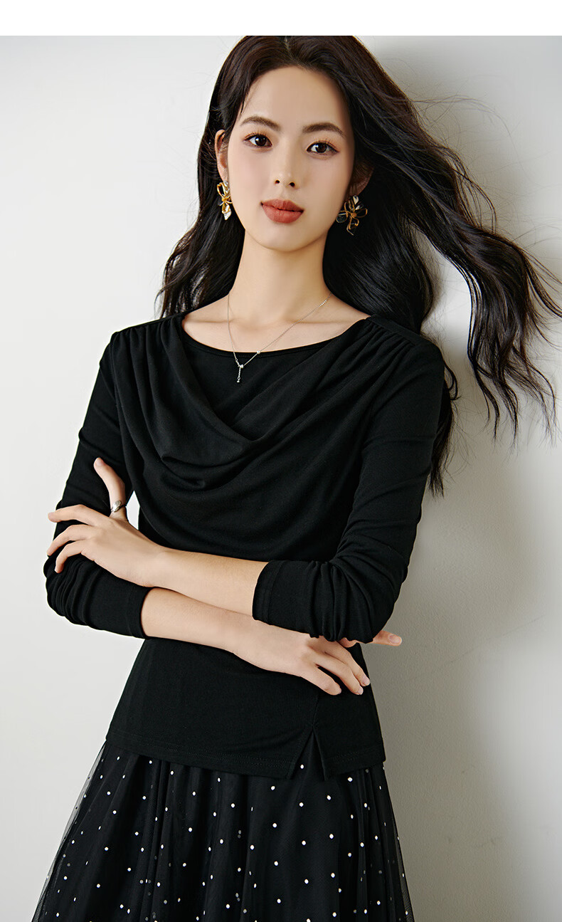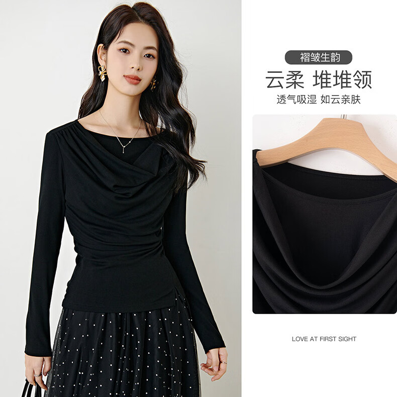 晚白【新品】2026年春款时尚堆堆领上衣亲肤柔软修身舒适T恤衫女 黑色 S