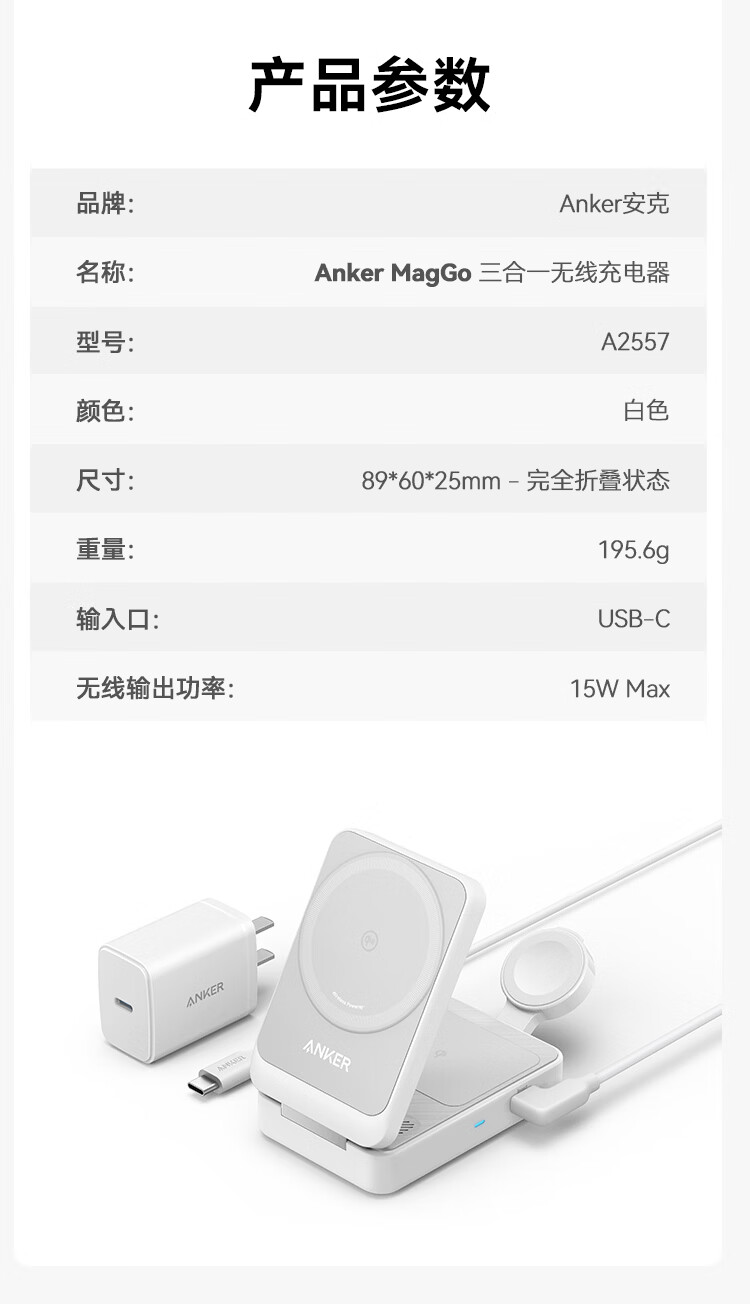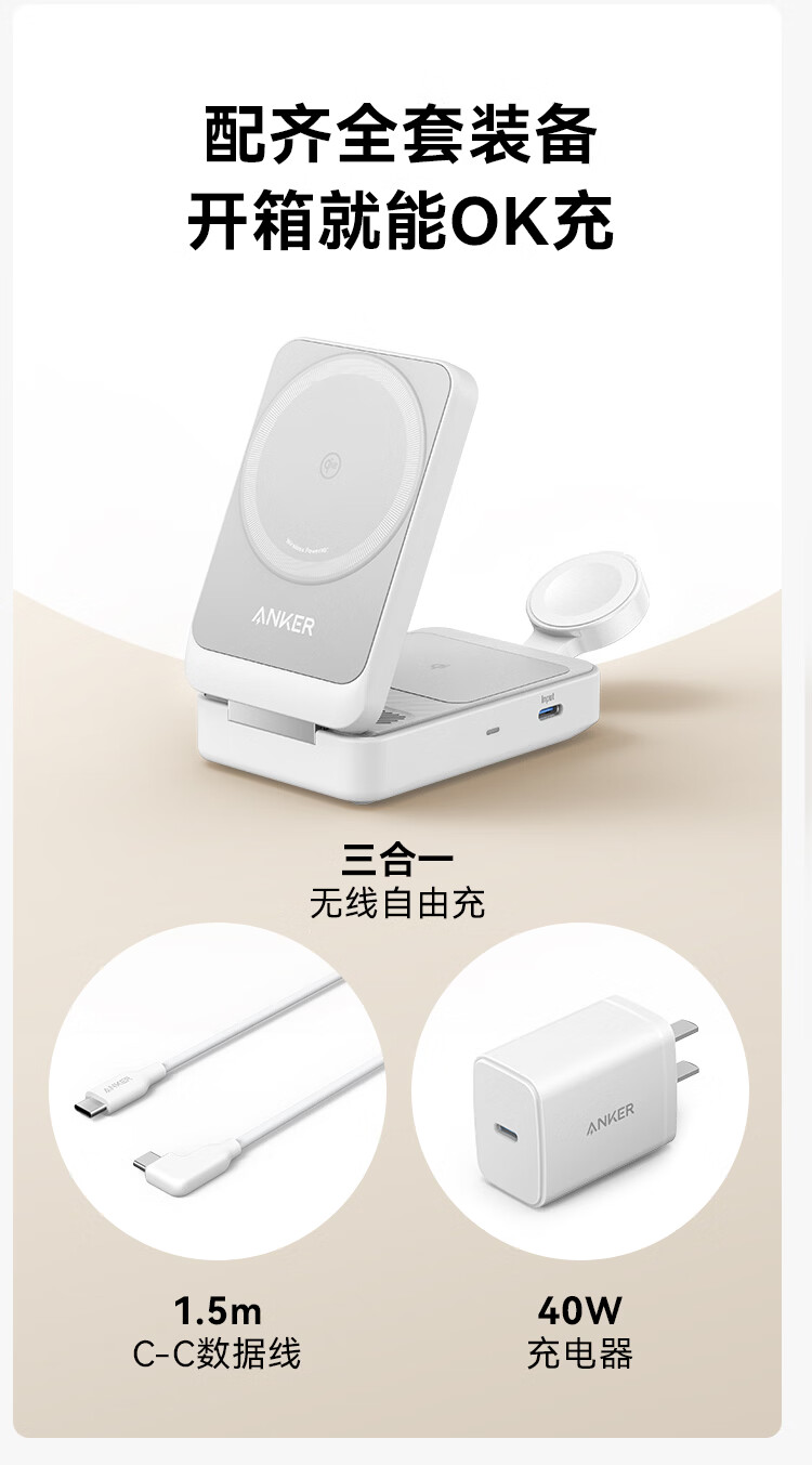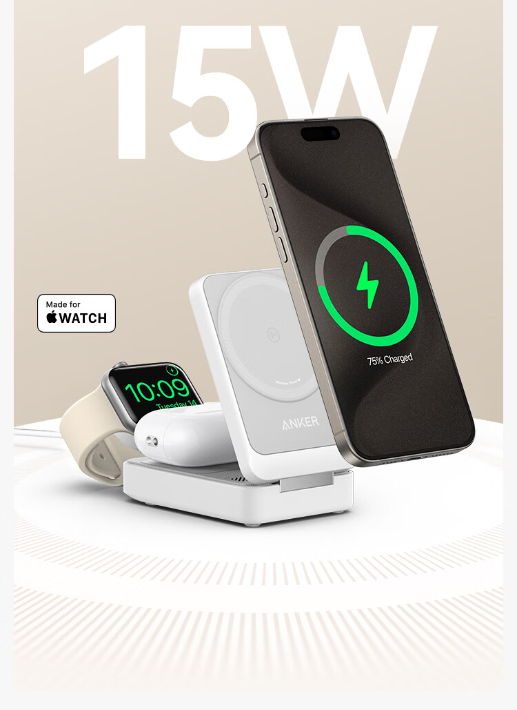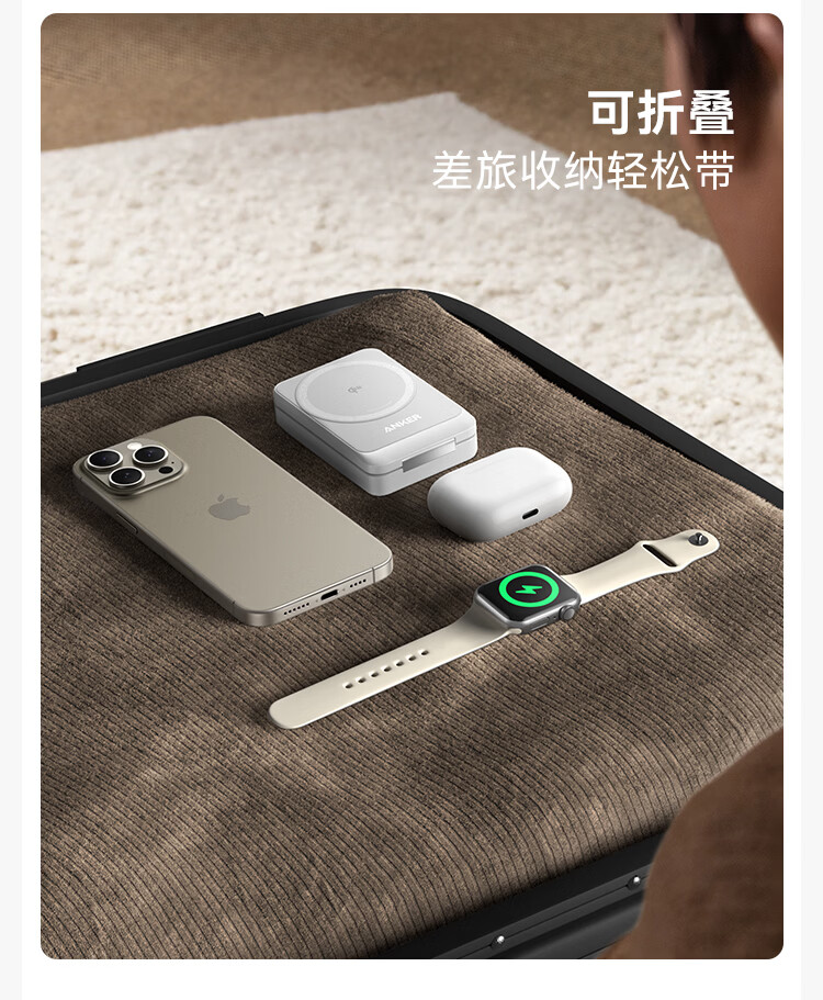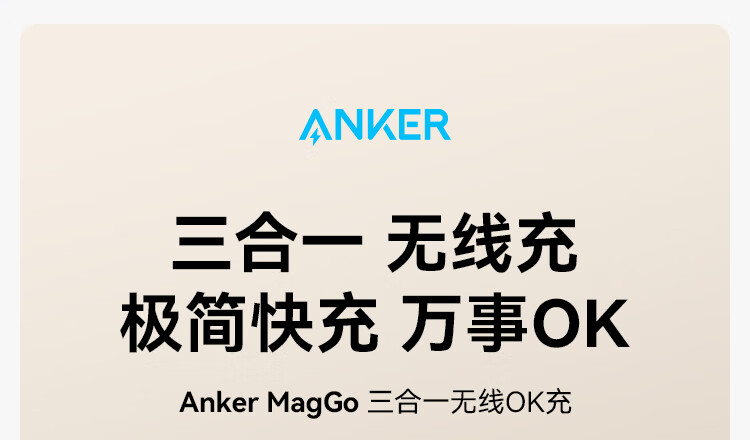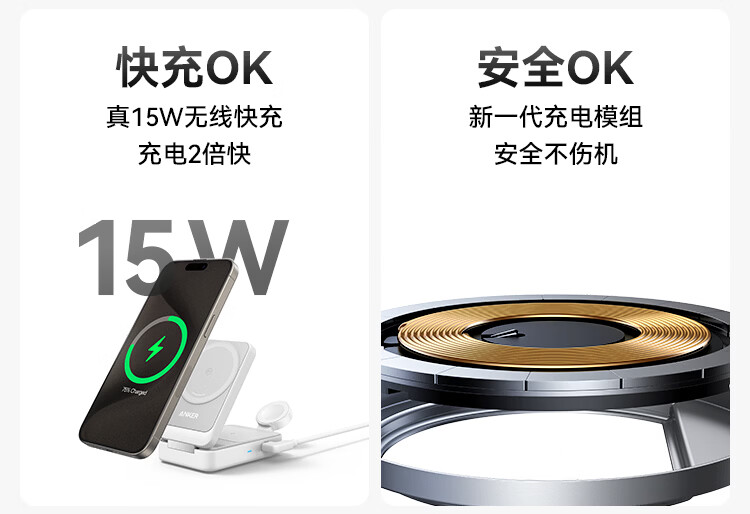 ANKER安克MagGo15W磁吸三合一无线充电器可折叠苹果手机快充同时充iPhone17Apple WatchAirPods耳机手表 【黑色】三合一|15W无线快充|可折叠