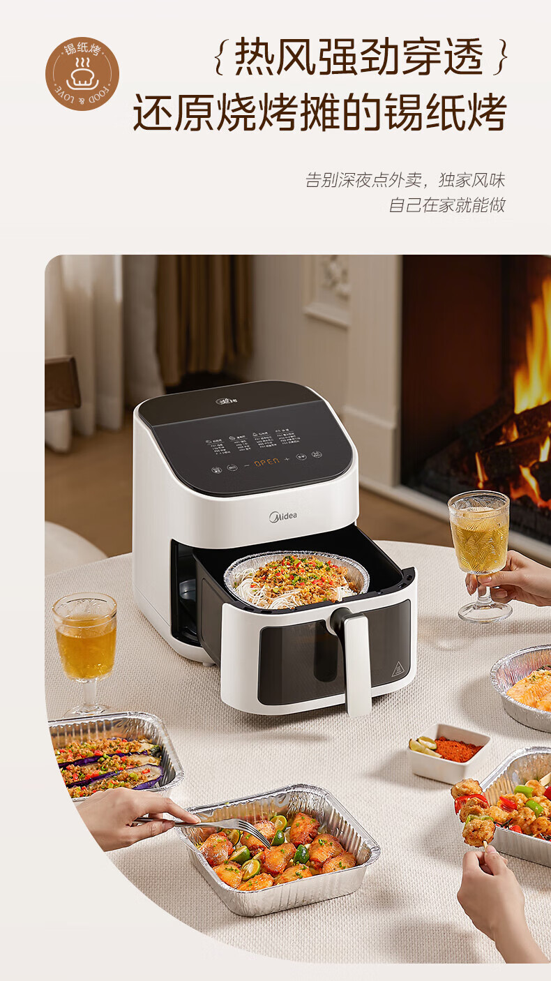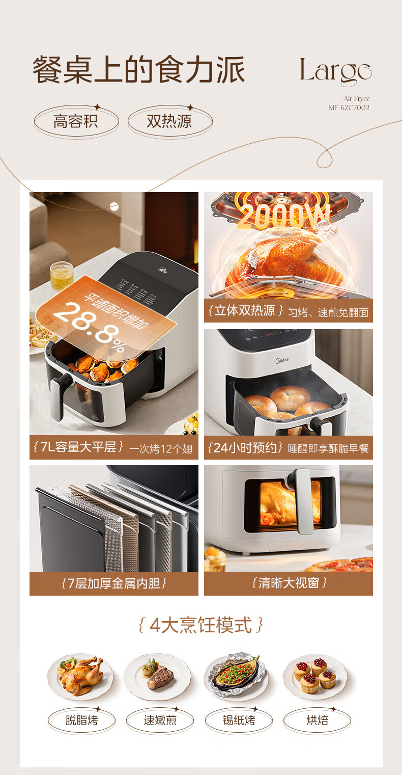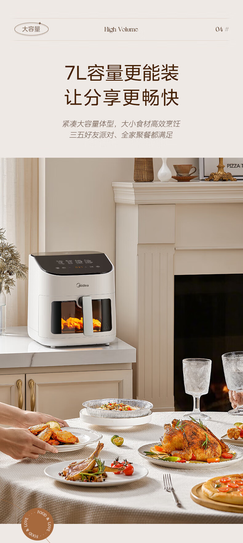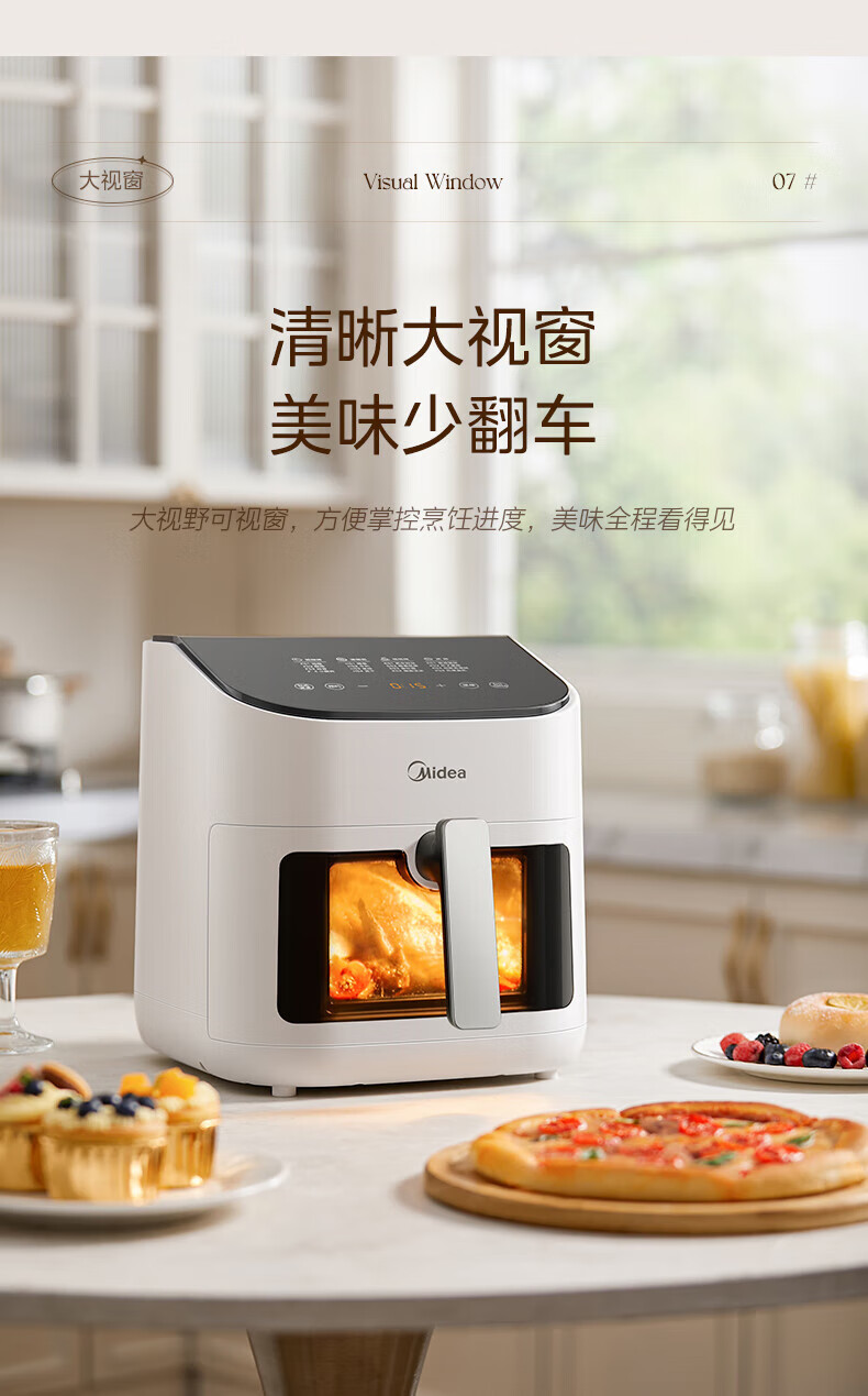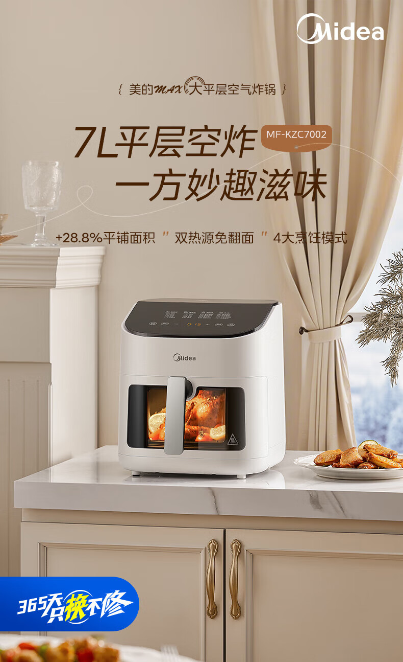 美的(Midea)空气炸锅家用 25年新款 实用大容量 电子菜单 双热源 不用翻面透明可视窗口烤箱一体机7L 免翻面 KZC7002【平层空炸】 7L
