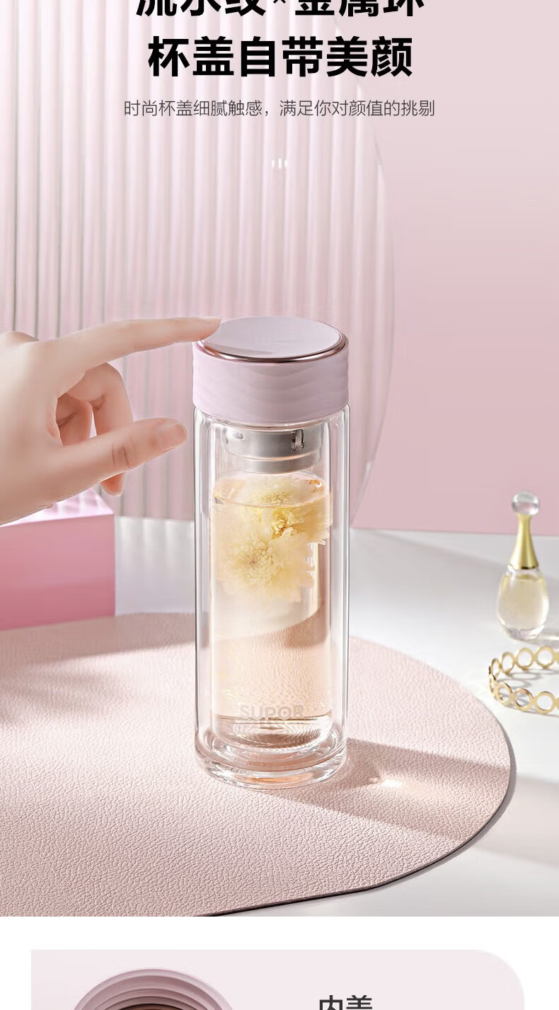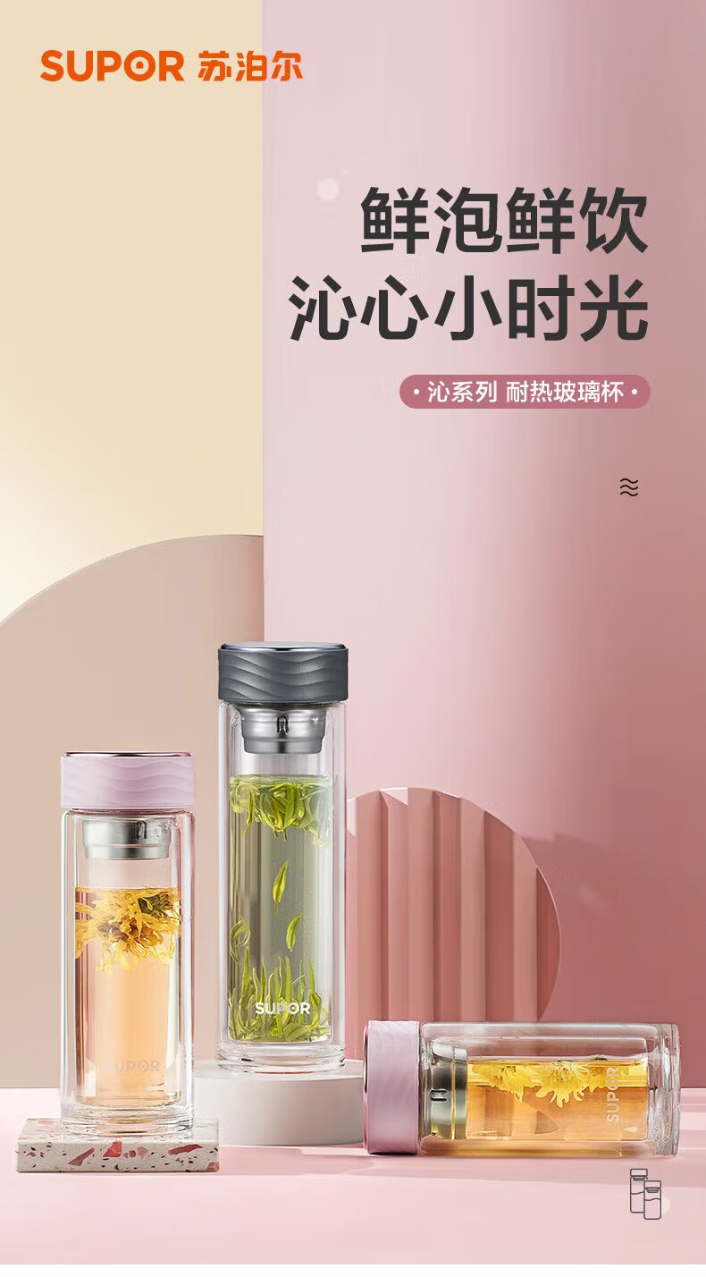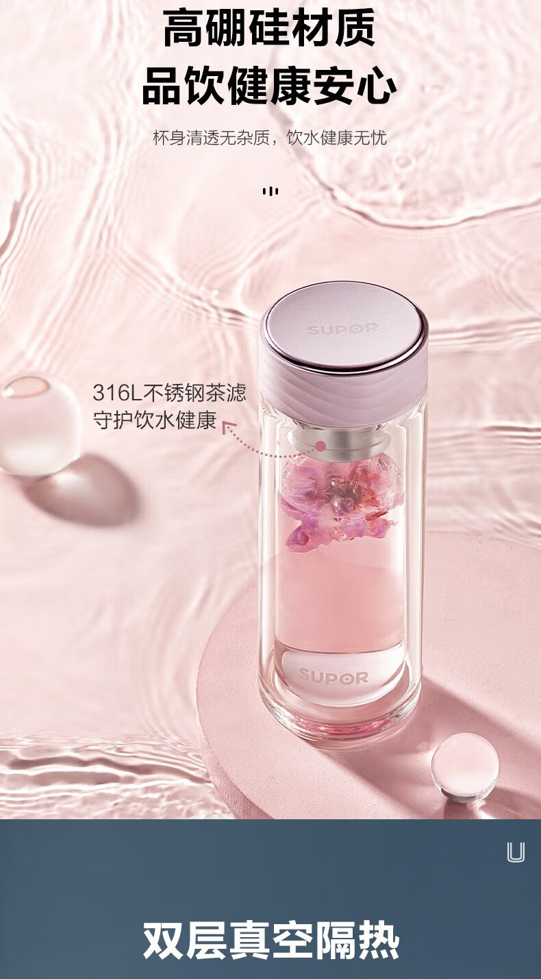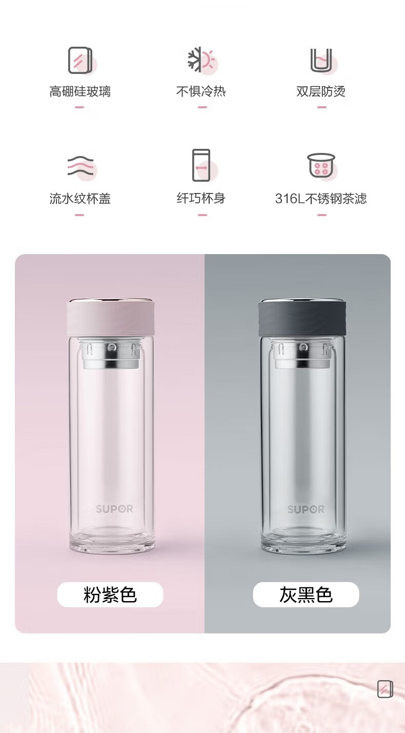 苏泊尔(SUPOR)双层玻璃杯耐高温女高颜值茶水分离泡茶大容量水杯新款2026 粉紫【316茶漏+杯刷】230ml