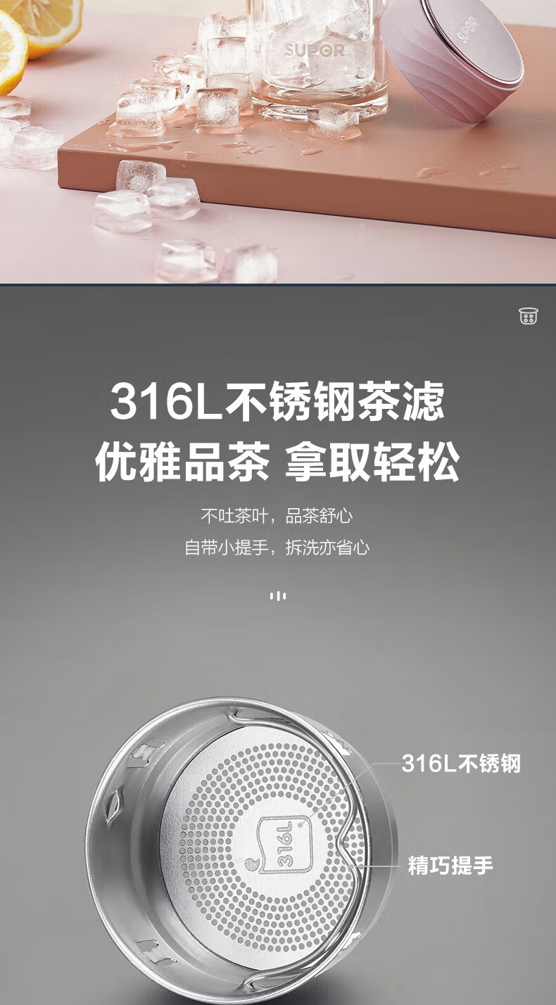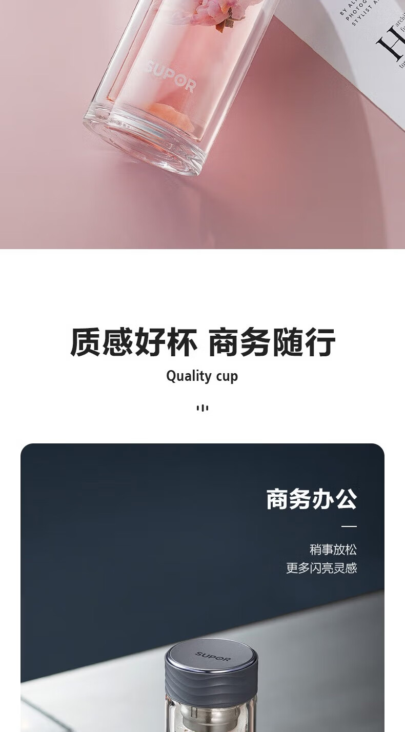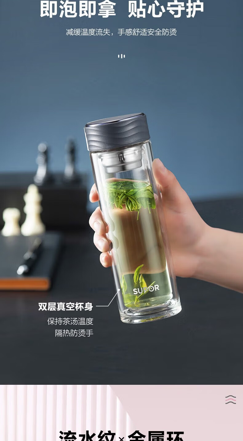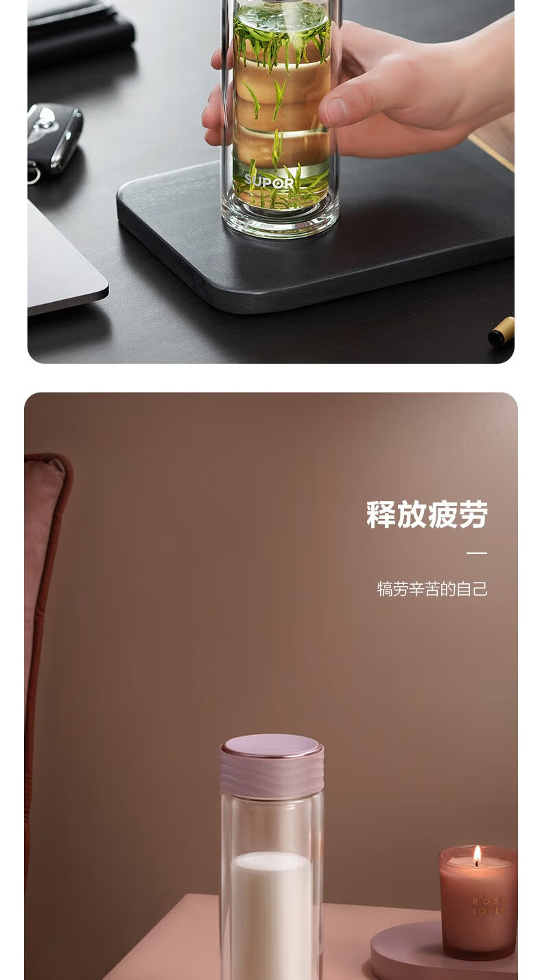 苏泊尔(SUPOR)双层玻璃杯耐高温女高颜值茶水分离泡茶大容量水杯新款2026 粉紫【316茶漏+杯刷】230ml