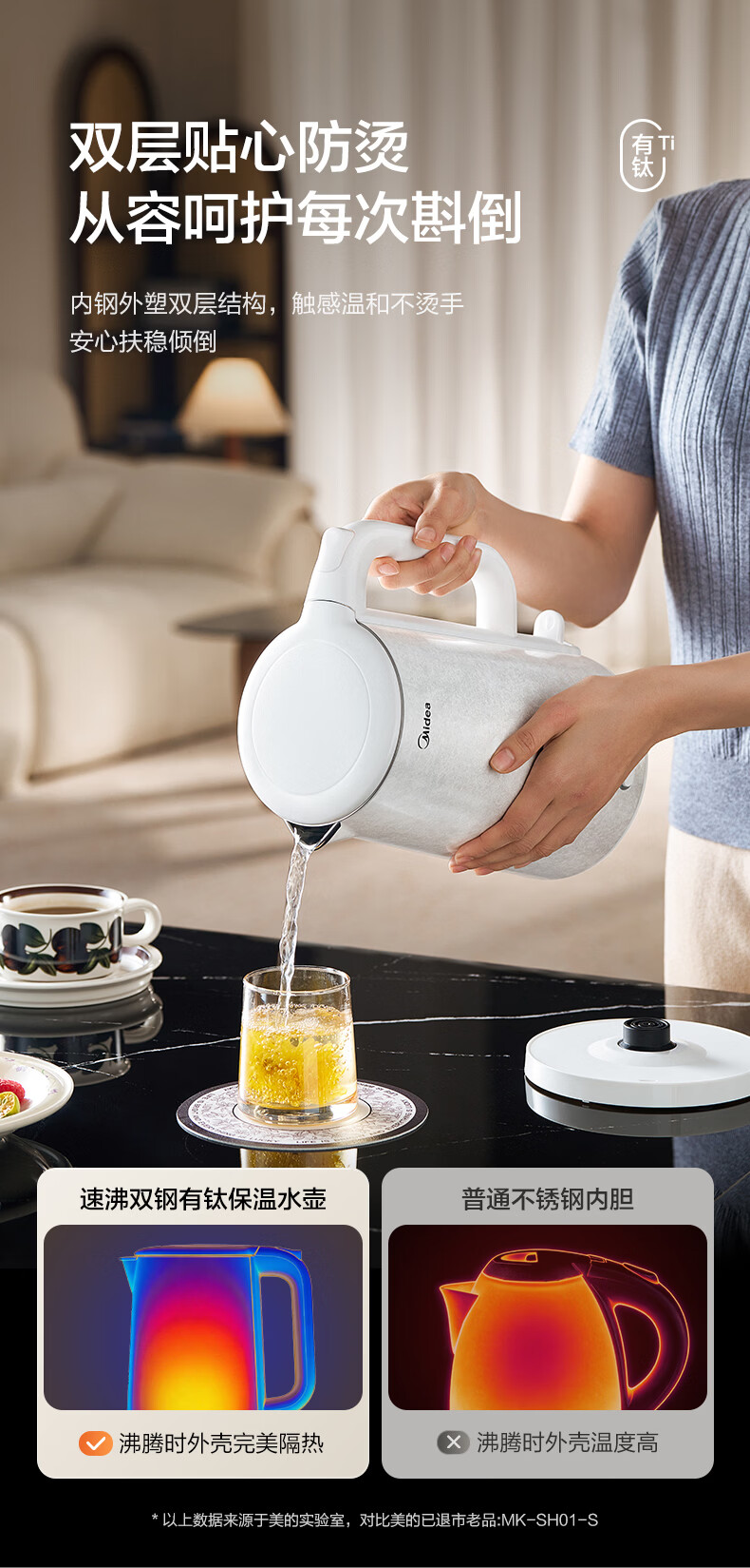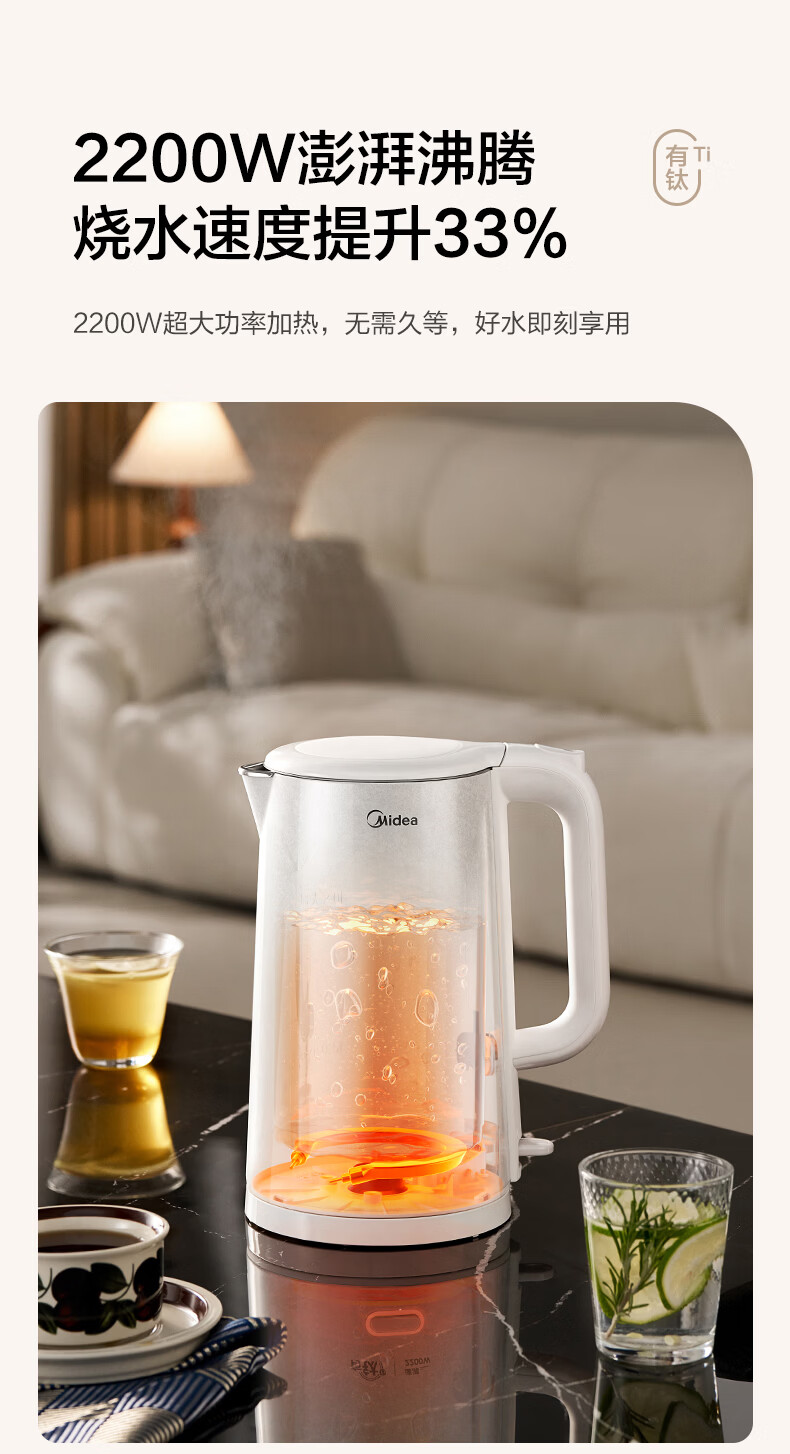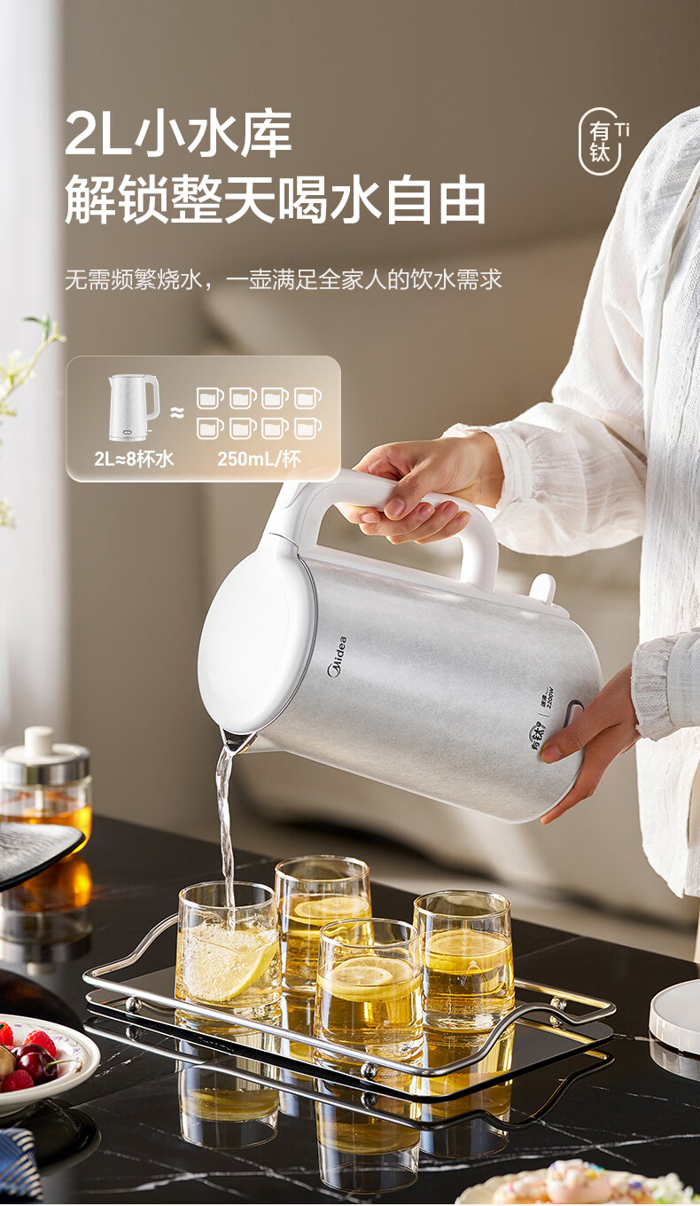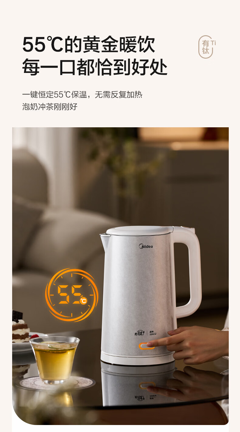 美的(Midea)电热水壶有钛材质2200W大功率恒温烧水壶自动断电保温一体2L大容量316L母婴不锈钢无缝一体内胆 2L 【有钛重磅升级】-大功率大容量好材质