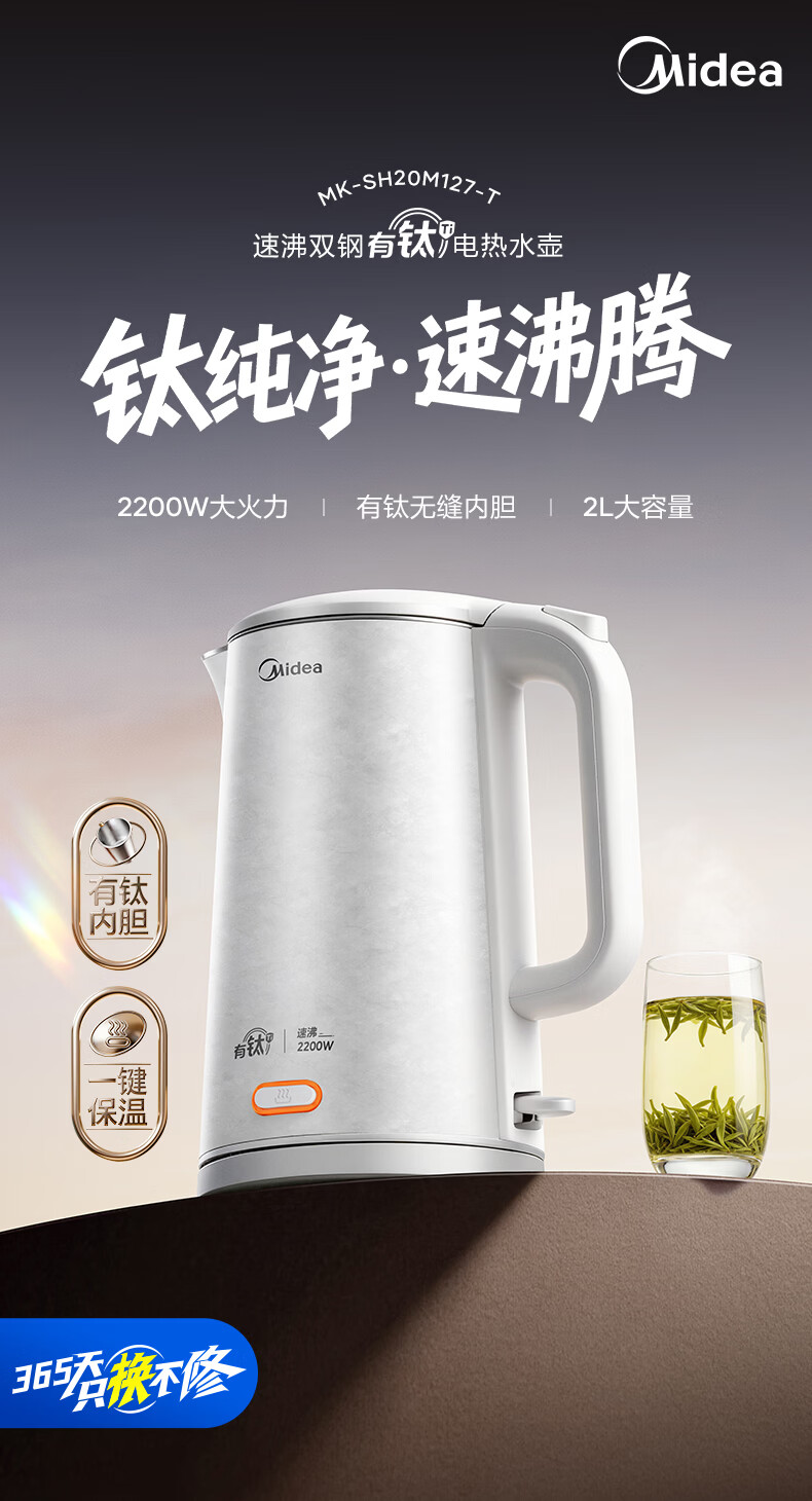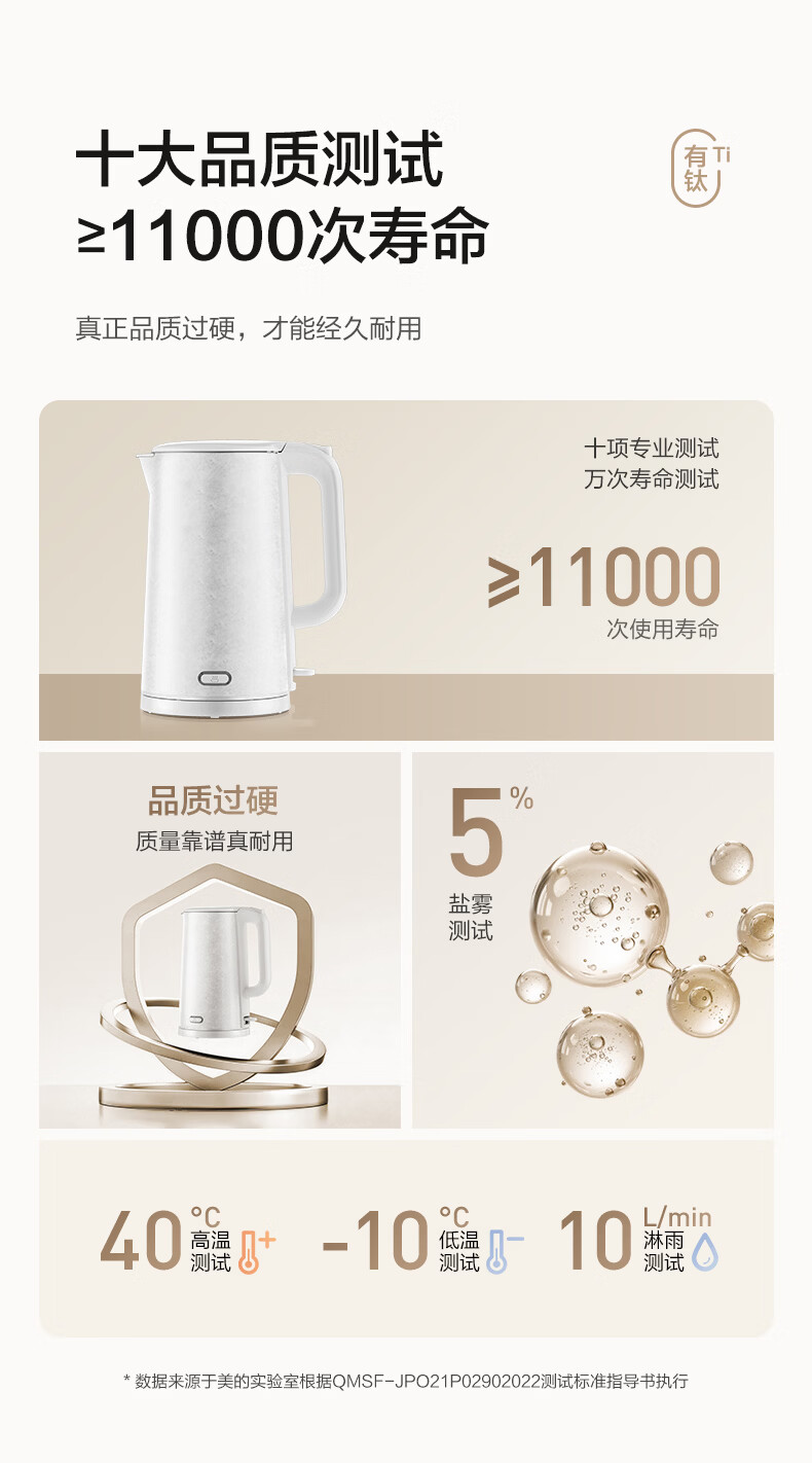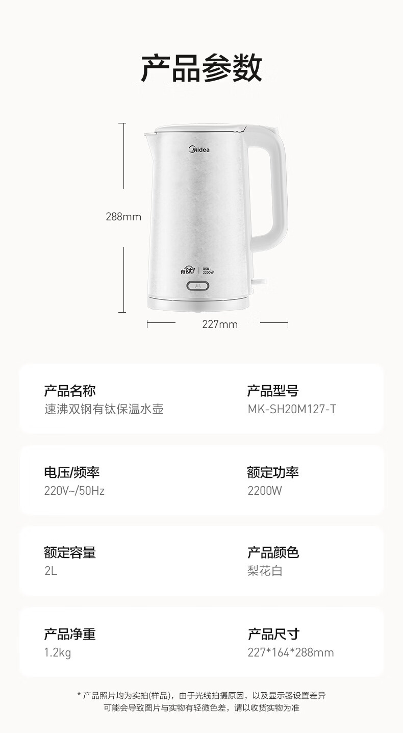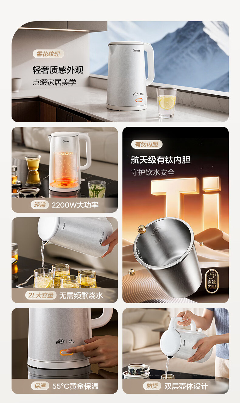 美的(Midea)电热水壶有钛材质2200W大功率恒温烧水壶自动断电保温一体2L大容量316L母婴不锈钢无缝一体内胆 2L 【有钛重磅升级】-大功率大容量好材质