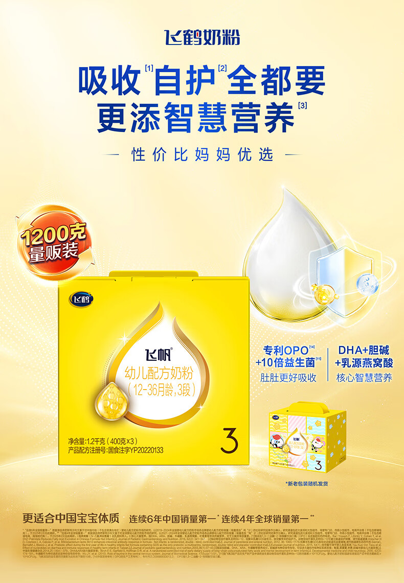 飞鹤飞帆OPO促吸收幼儿配方奶粉3段(12-36月龄)1200克 DHA好脑力奶粉