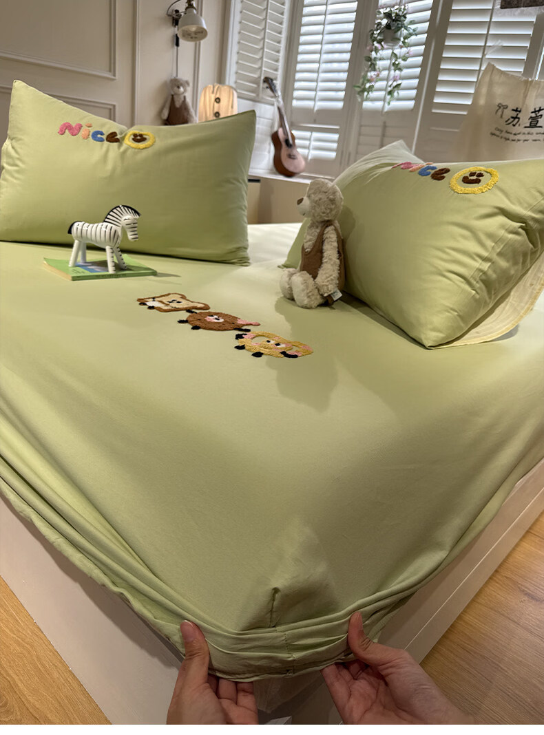 苏萱ins清新绿纯棉毛巾绣床笠罩单件席梦思床垫保护罩全包床套三件套 奶油粉 床笠单件-180x220cm