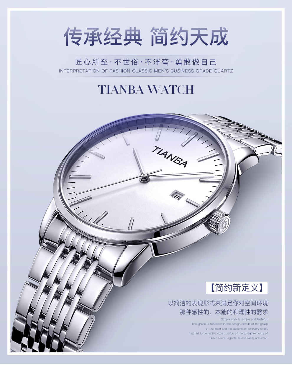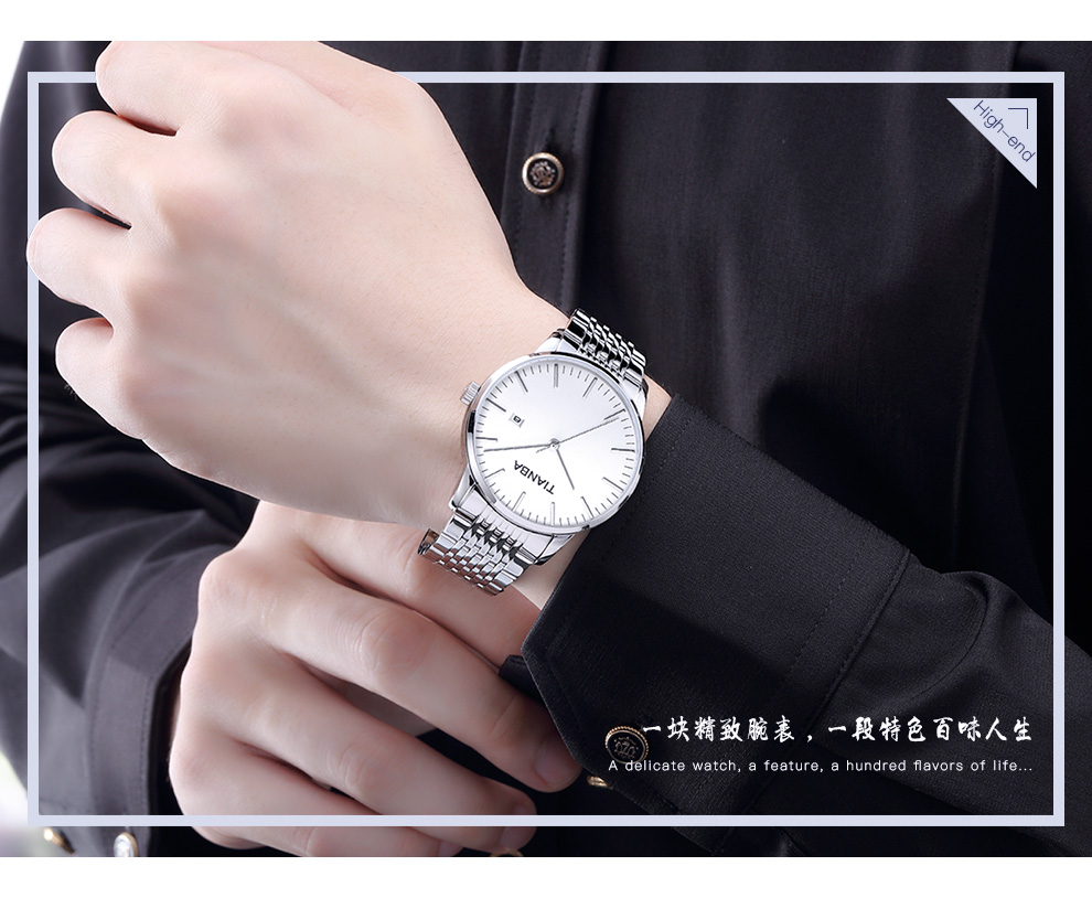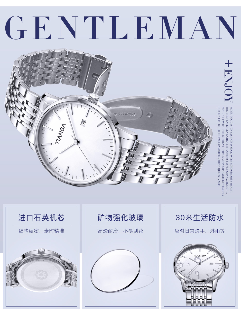 天霸手表男简约商务超薄男表钢带皮带石英表日历情侣手表3037 白盘钢带(男款)