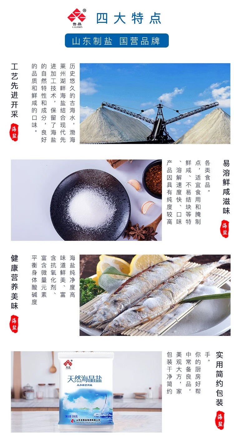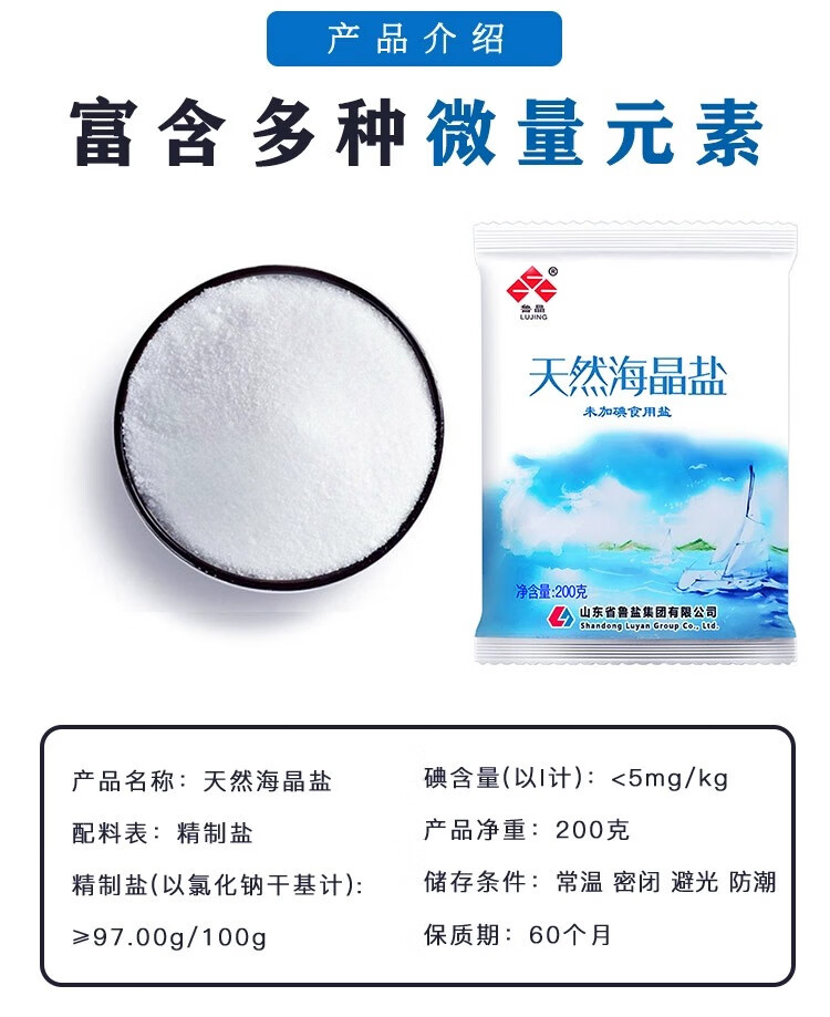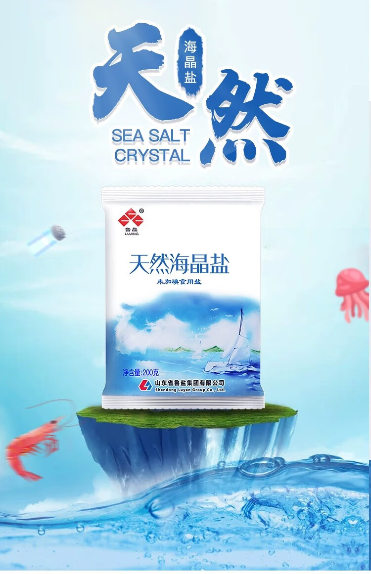 鲁晶天然海晶盐无碘精制盐调味品200g/袋未加碘盐巴炒菜食盐炖汤 【活动】200g*4包