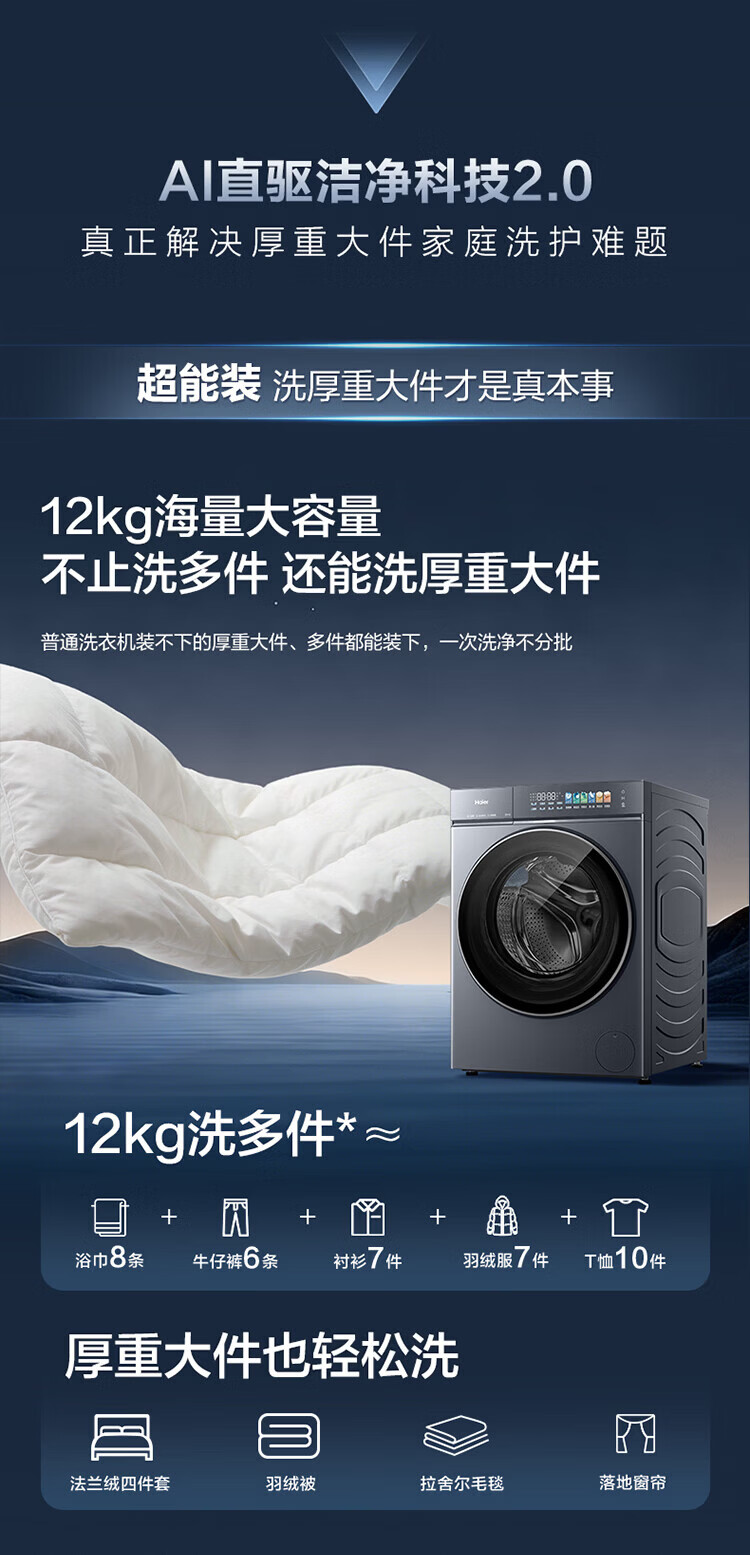 海尔(Haier)云溪5.0 D1 全自动滚筒洗衣机12KG 家用大容量全家筒 AI直驱洁净双效除菌 BLE7AD1U1 全家筒12KG滚筒 单洗