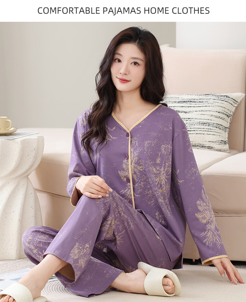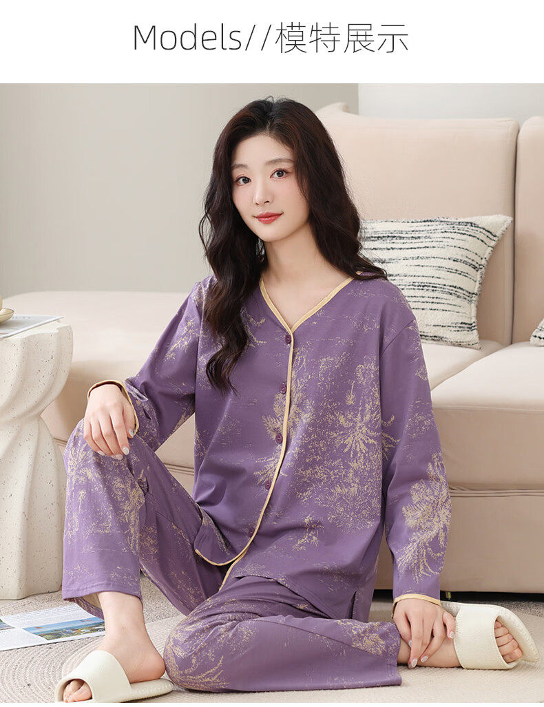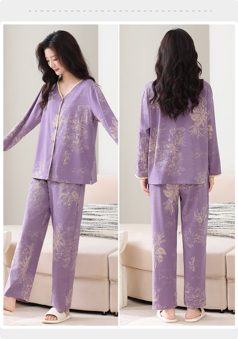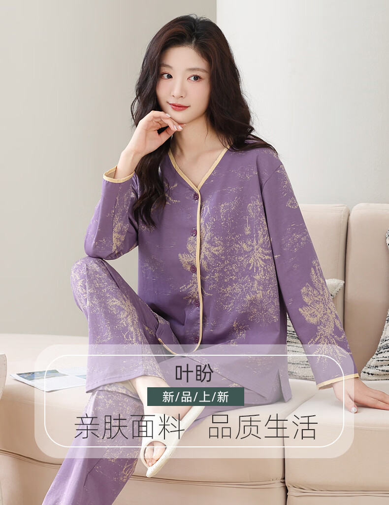 叶盼(yepan)【柔软】莱卡纯棉睡衣女春秋季和服领长袖宽松大码女士家居服套装 7612-紫色 M (160) :建议80-100斤穿着