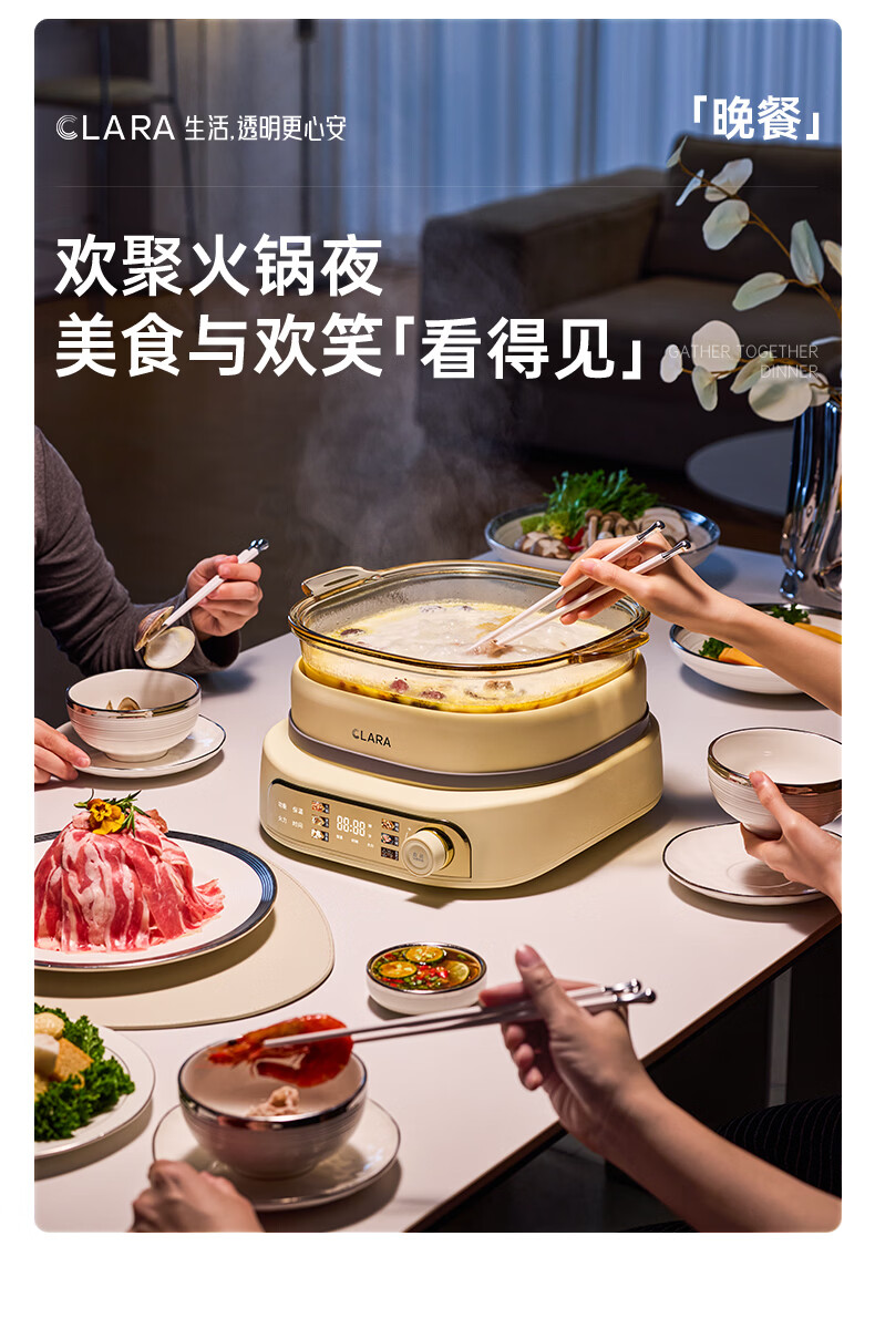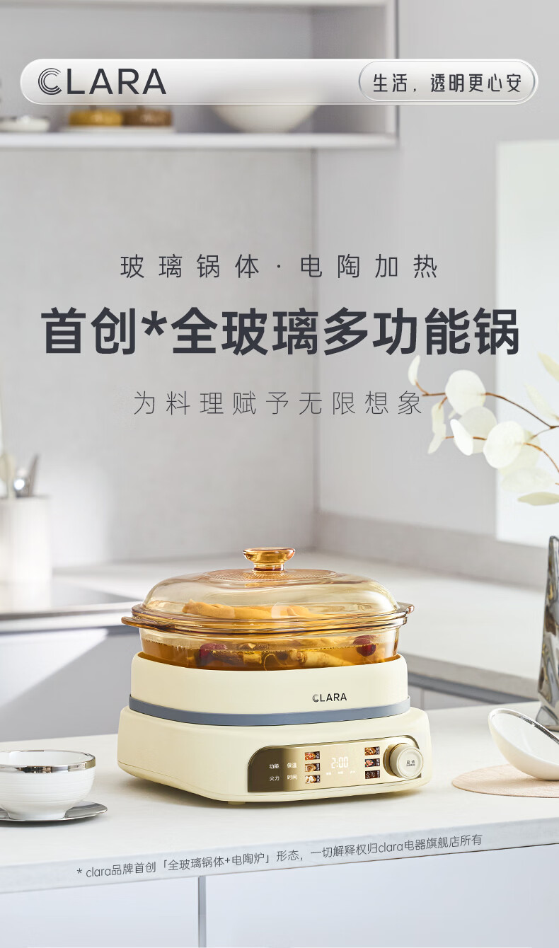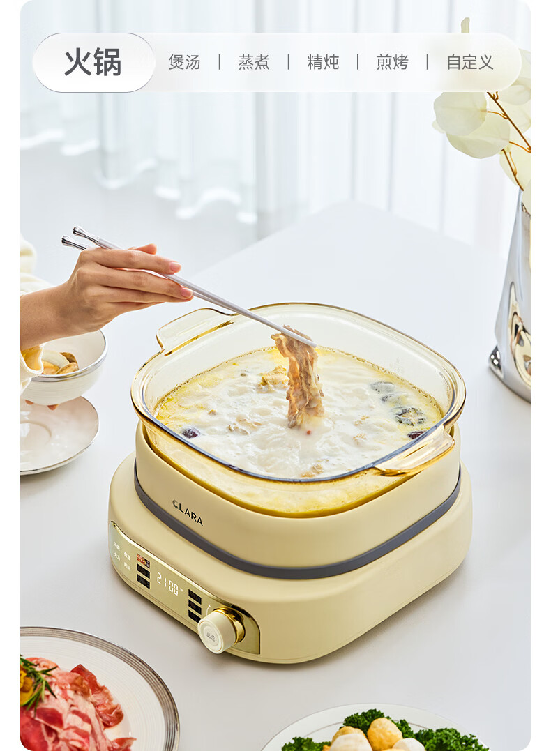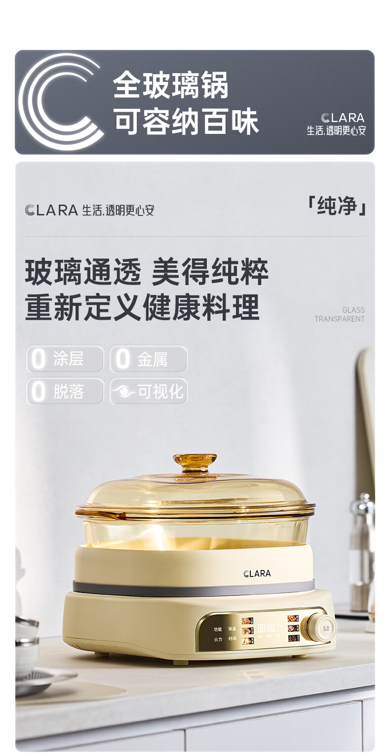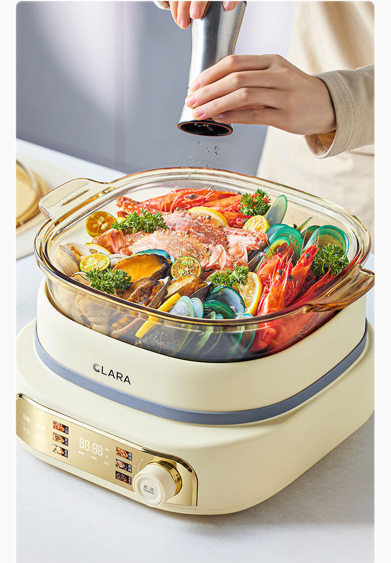 CLARA可莱全玻璃多功能料理锅涮烤锅煎烤肉火锅电蒸煮锅0涂层分体式电热锅4-6人电煮锅乔迁好礼新婚礼