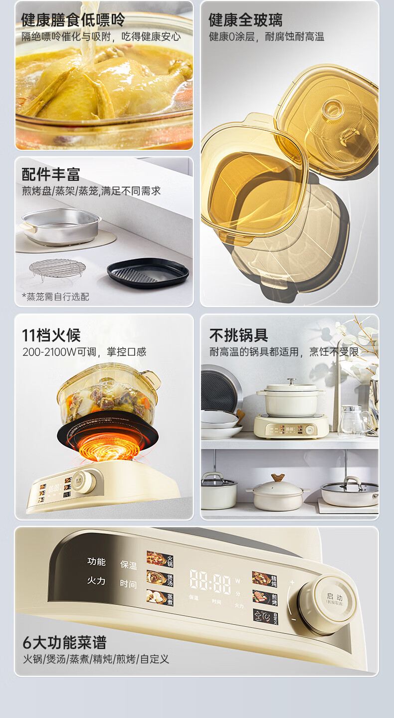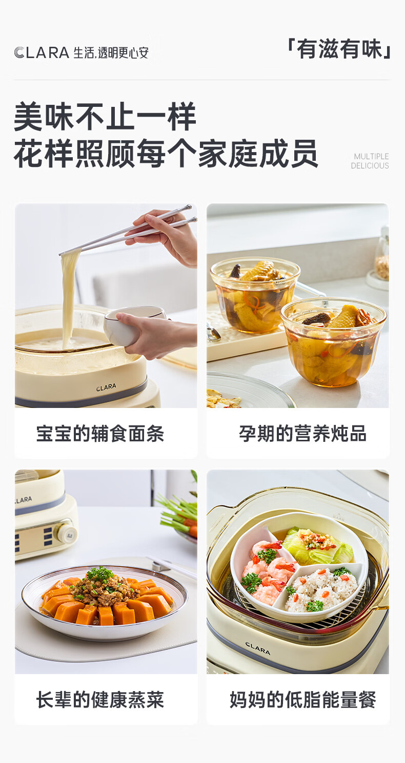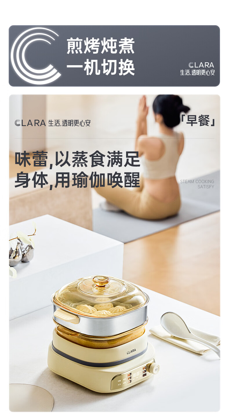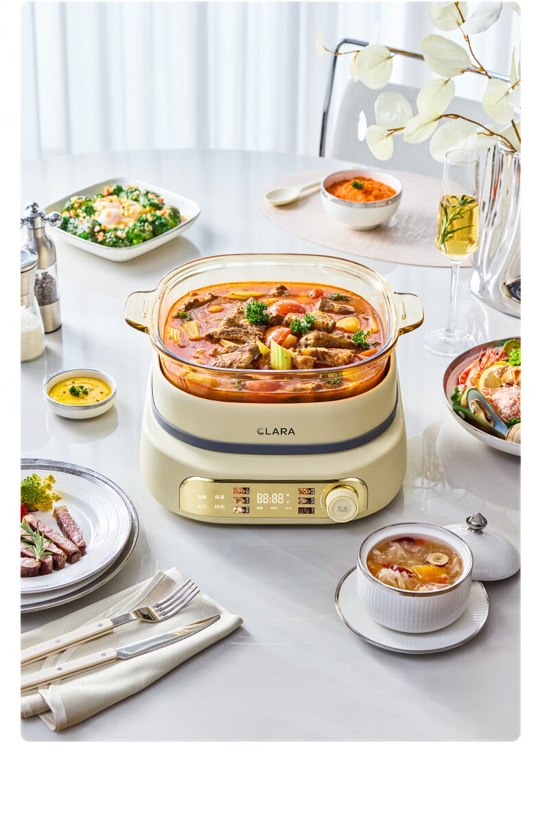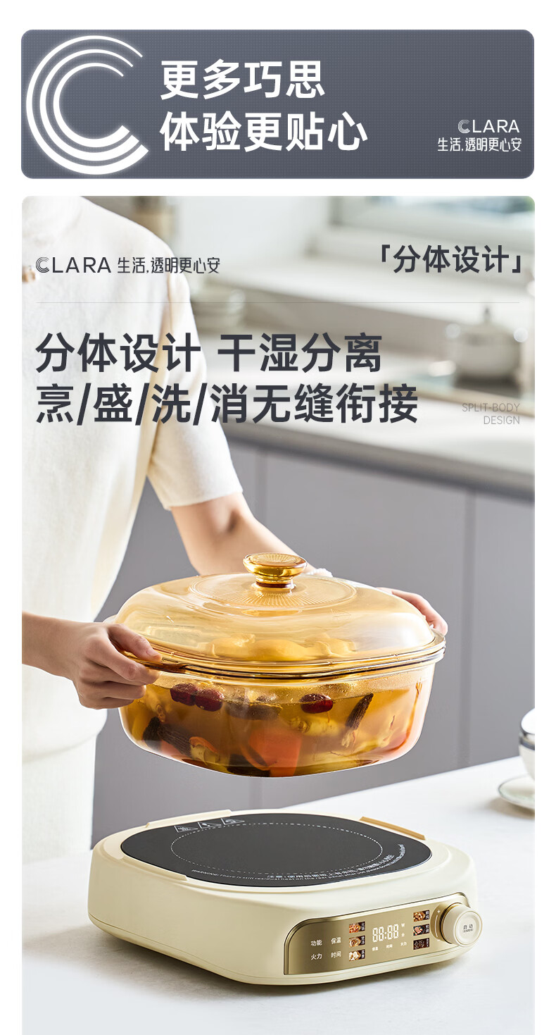 CLARA可莱全玻璃多功能料理锅涮烤锅煎烤肉火锅电蒸煮锅0涂层分体式电热锅4-6人电煮锅乔迁好礼新婚礼
