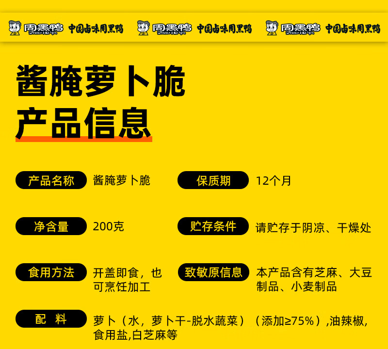 周黑鸭麻辣香脆萝卜咸菜下饭菜 拌饭拌面酱腌菜嘎嘣脆萝卜干200g