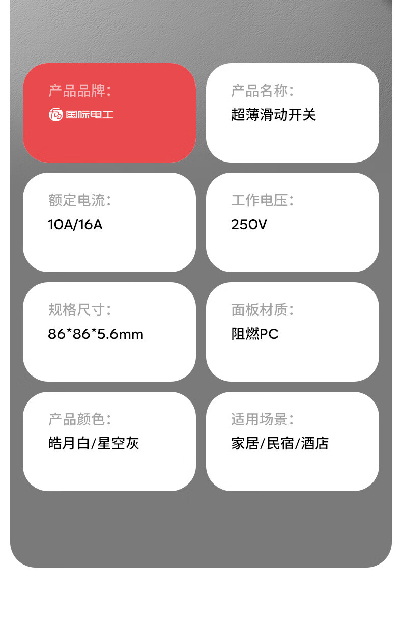 国际电工滑动式开关插座面板肤感灰色86型暗装墙壁电源插座家用双控带开关 一开单控【高端滑动款】