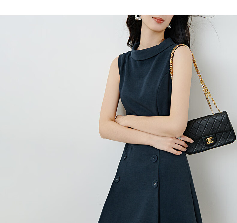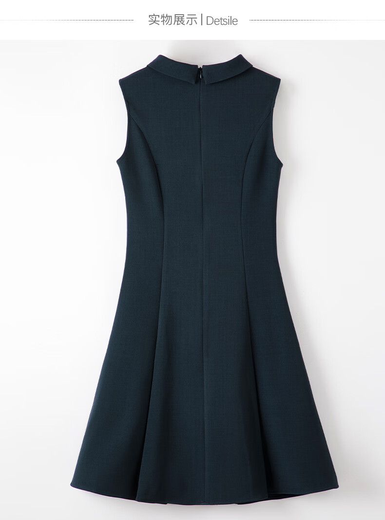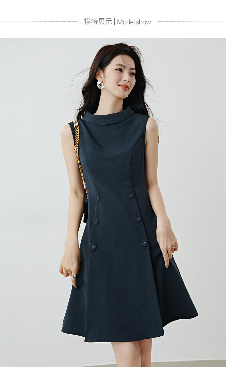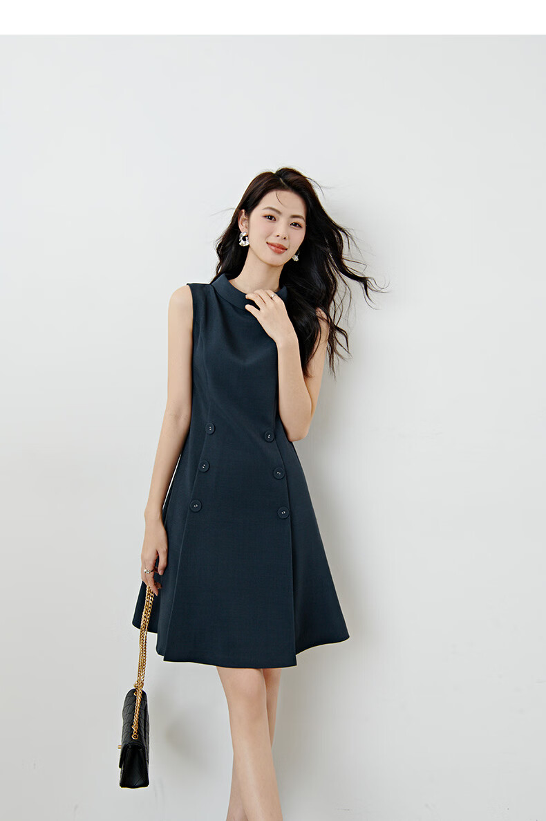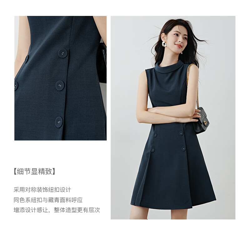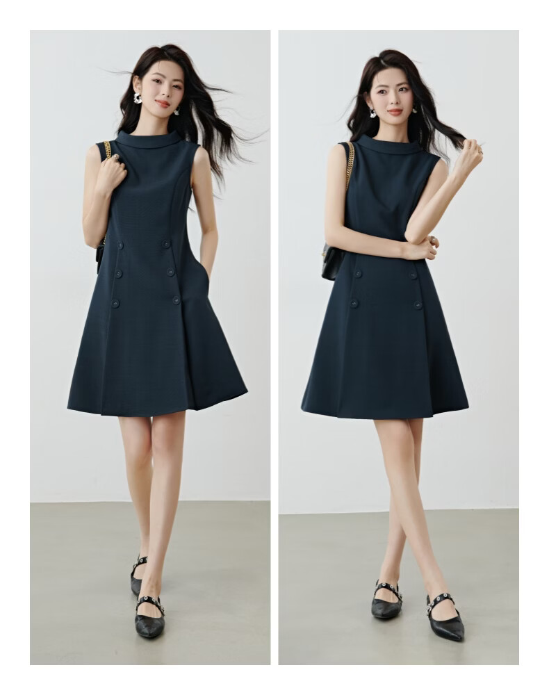 晚白2026年春款气质立体兜兜领双排扣行政蓝小个子显高无袖连衣裙 深蓝色 M