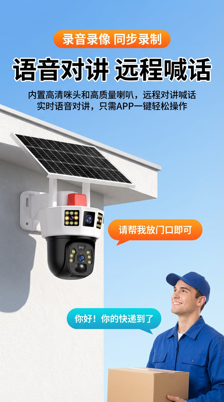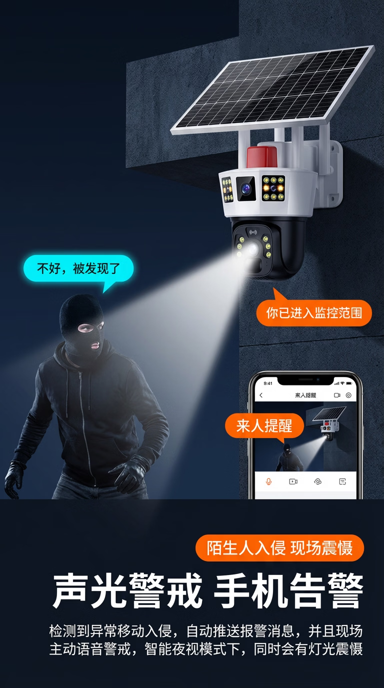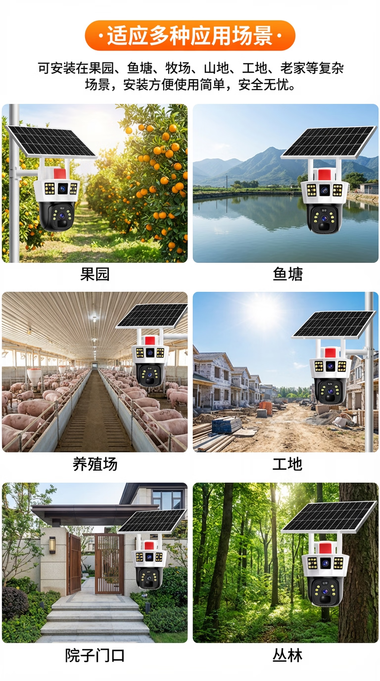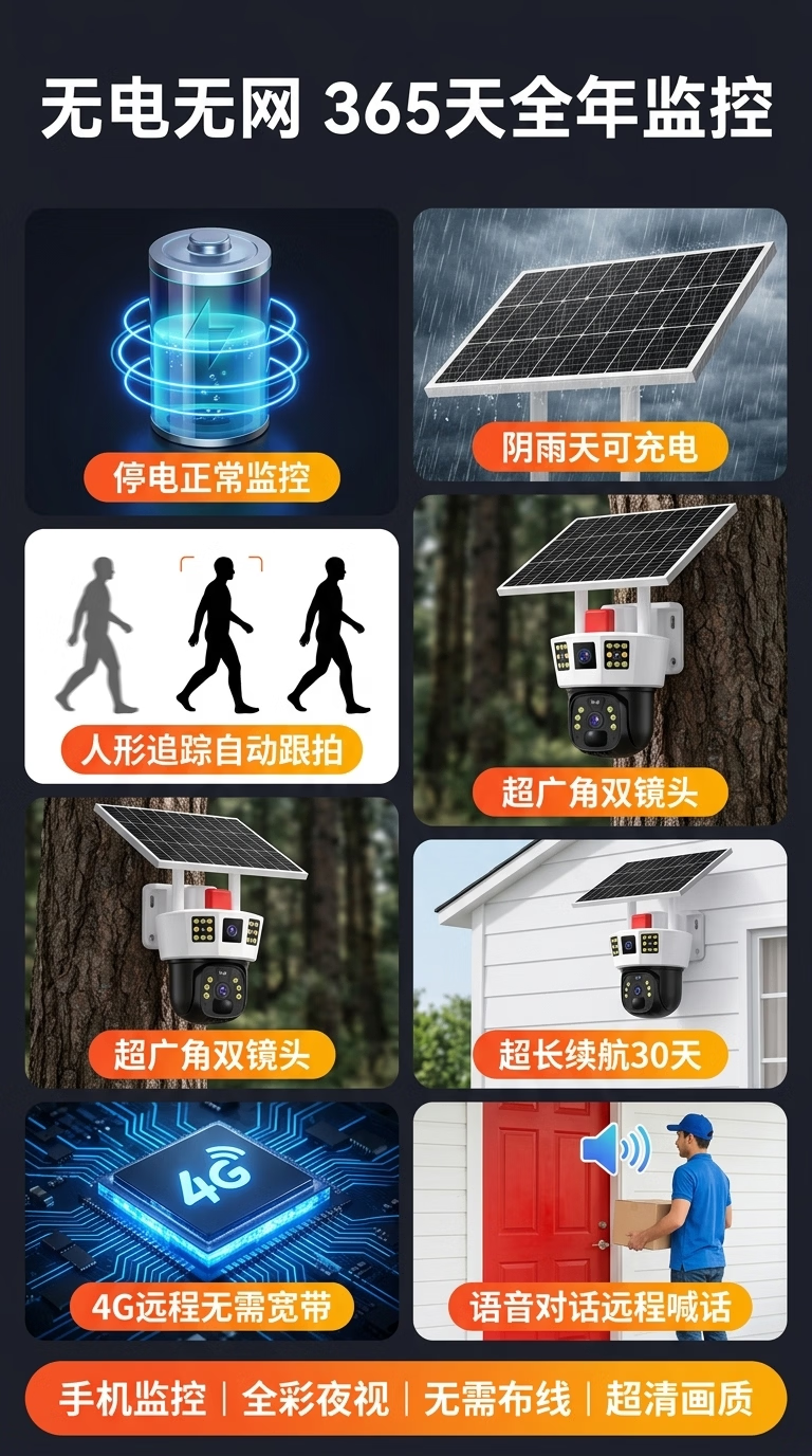 康视方4G5G太阳能监控无电无网户外AOV三画面旋转终身免流量高清摄像头家用360度无死角带夜视全景室外 5G三画面双太阳能板【终身免流量】 超高清+终身免流+30天循环回放+手机远程双向语音