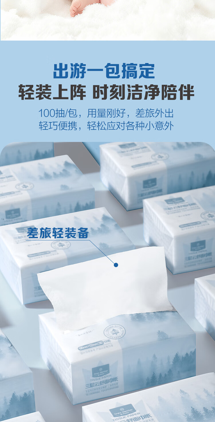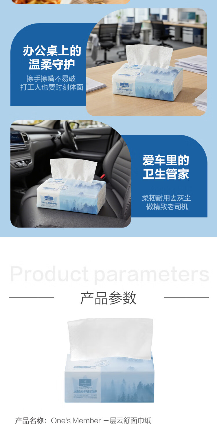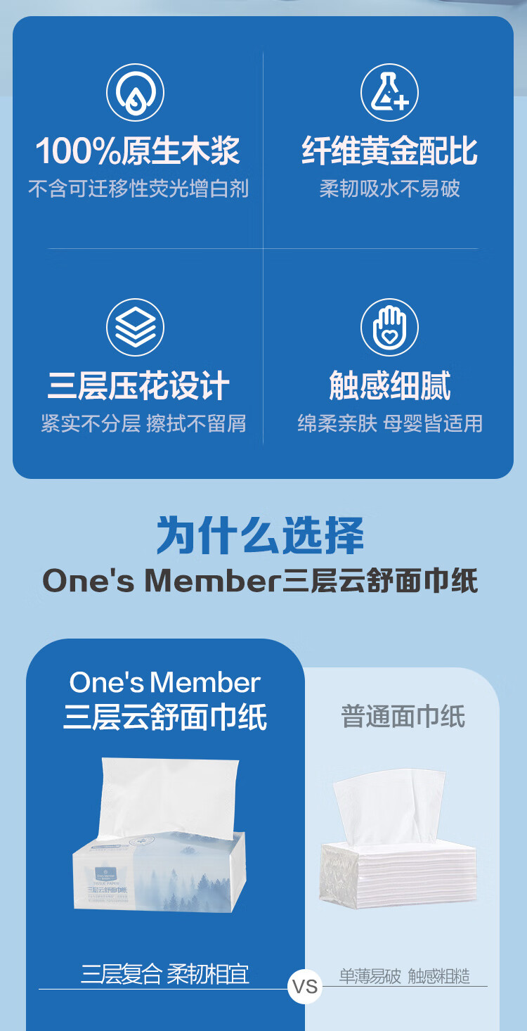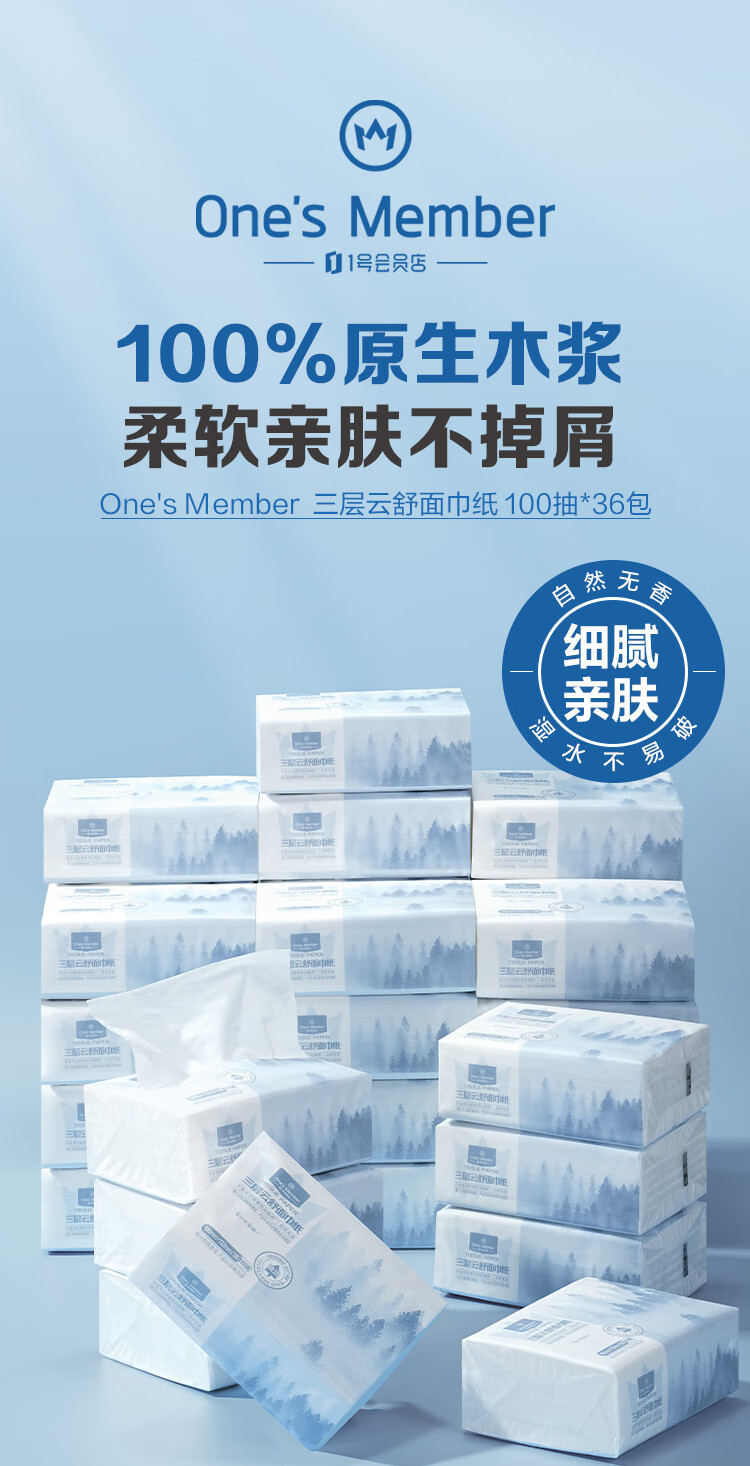 1号会员店(One's Member)三层云舒面巾纸 100抽*36包 原生木浆纸巾抽纸餐巾纸擦手纸抽