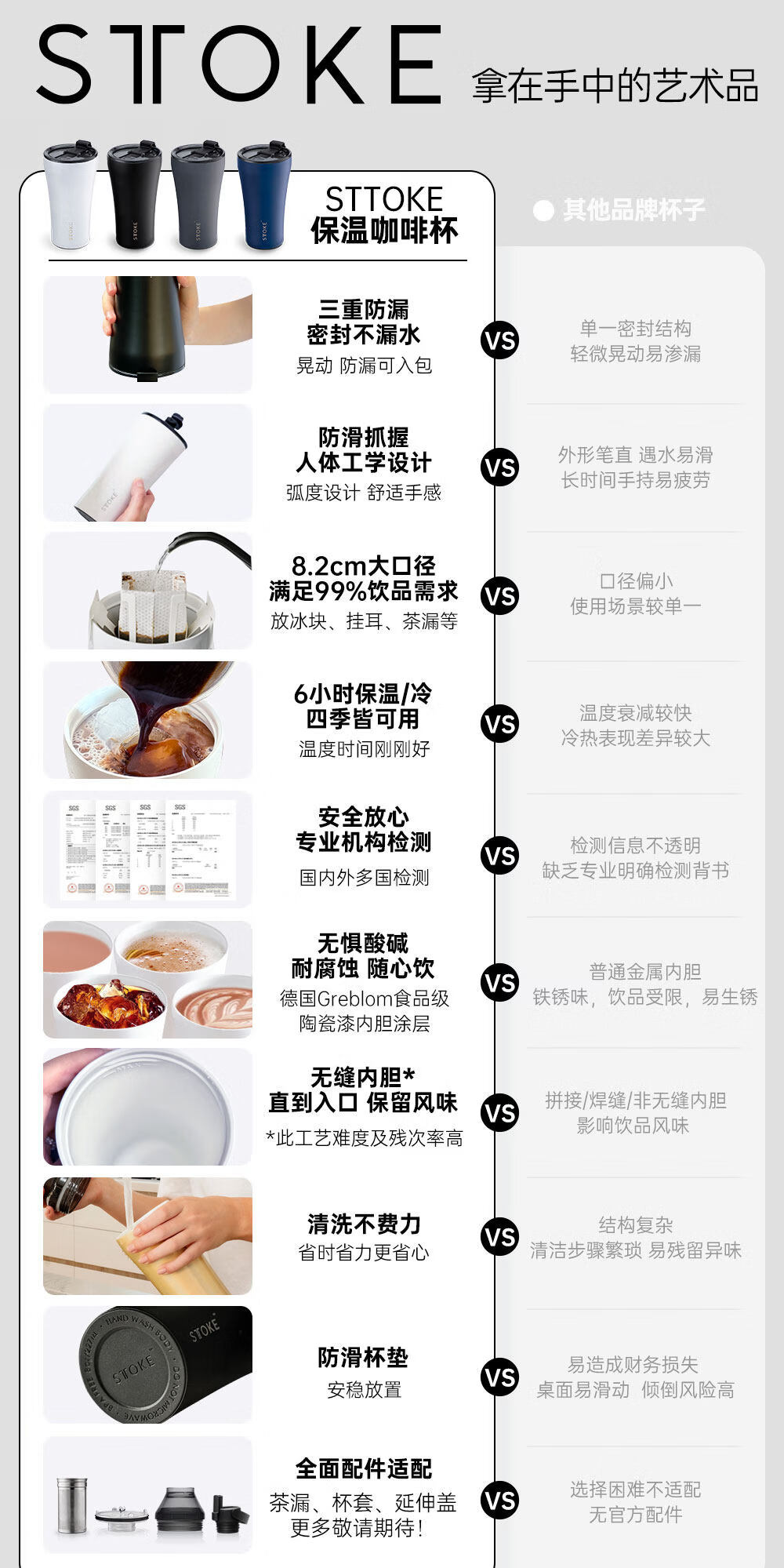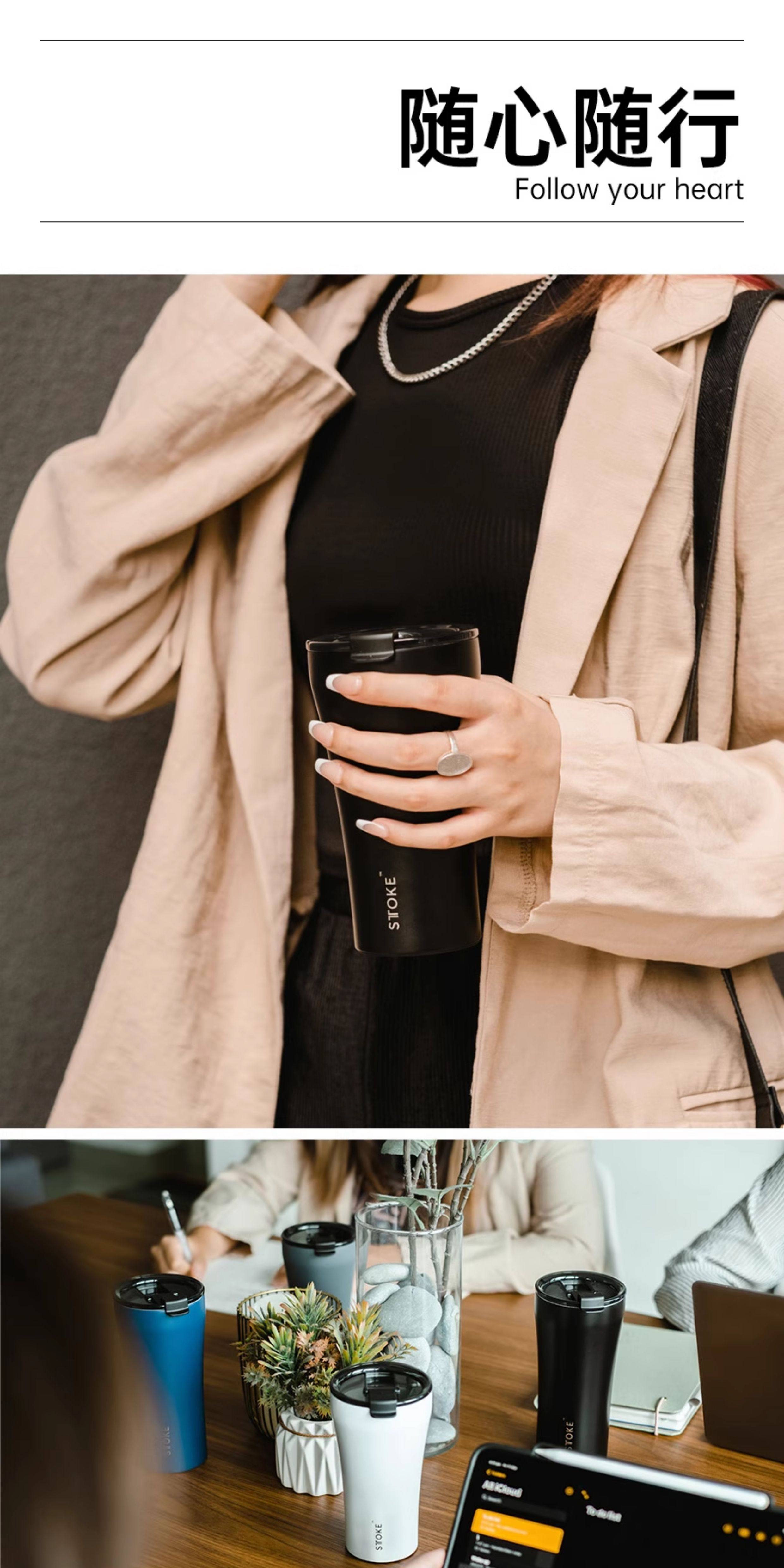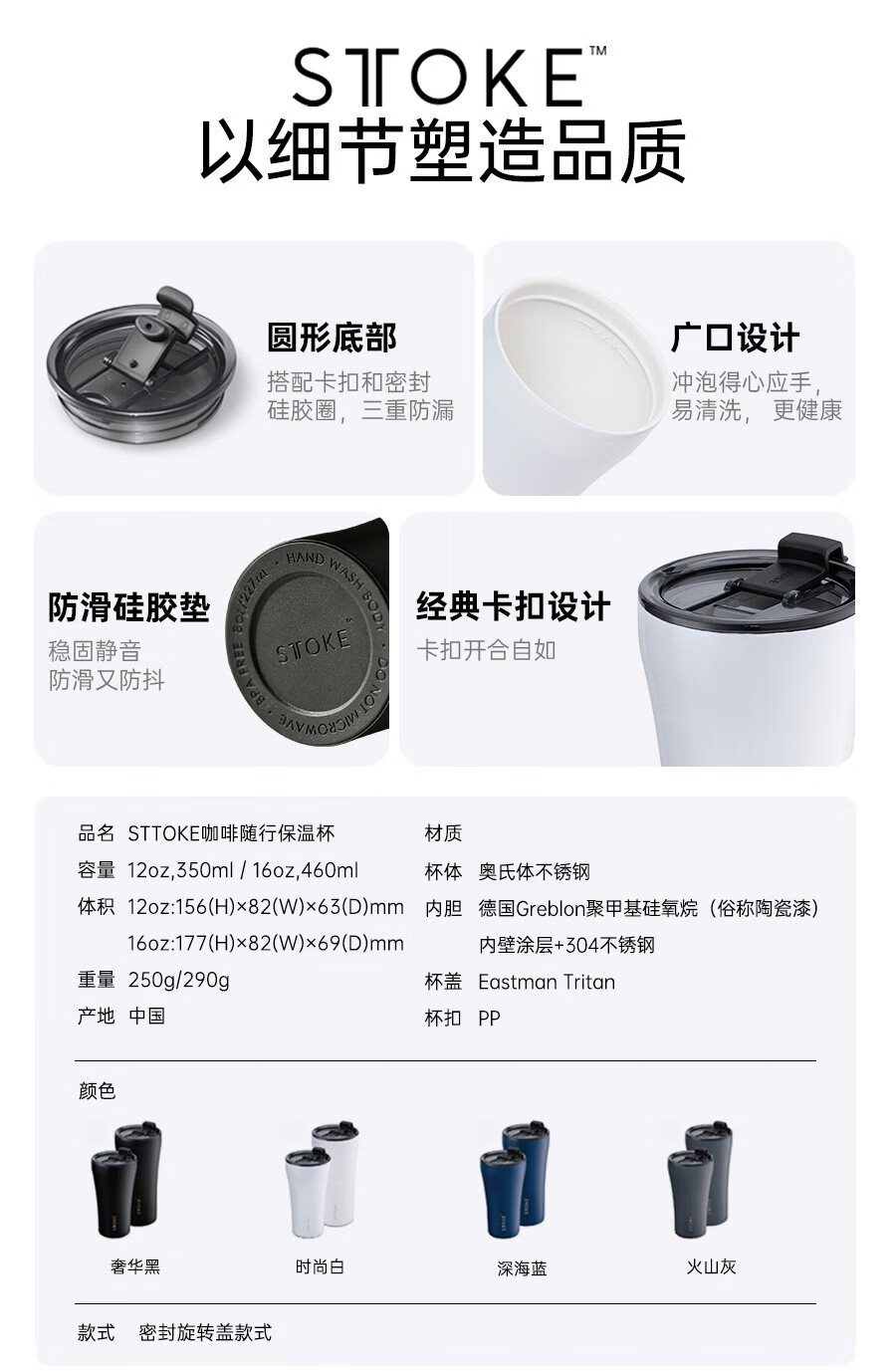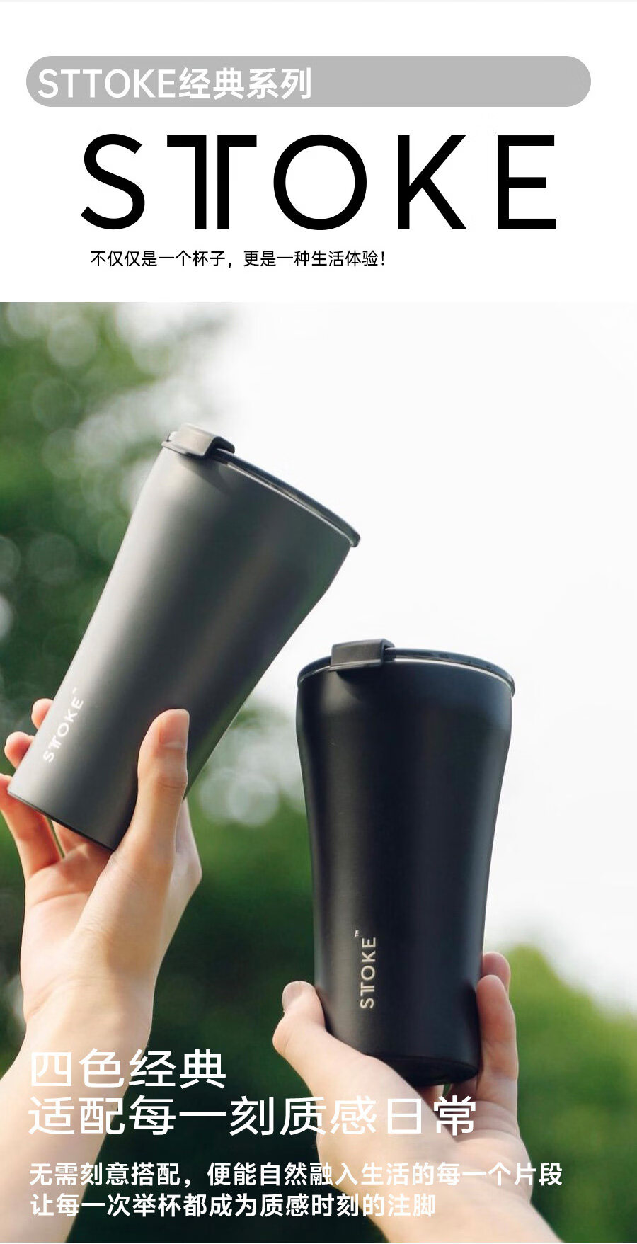 慕咖STTOKE经典款咖啡杯精致陶瓷内胆保温杯便携实用水杯TT杯节日礼物 奢华黑460ml【延伸盖组合】