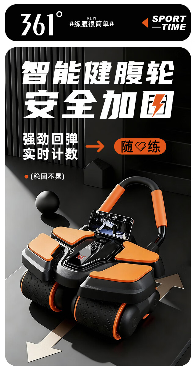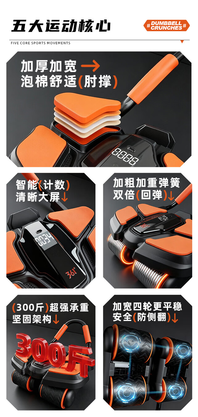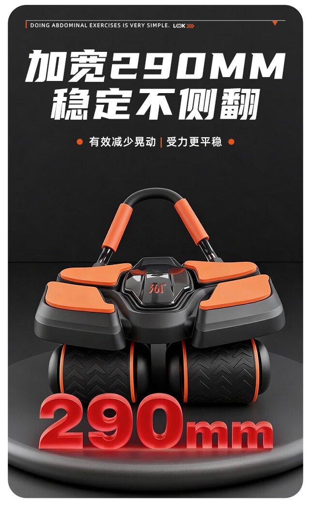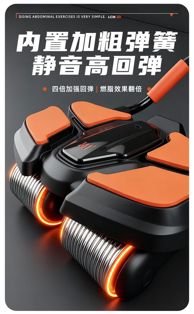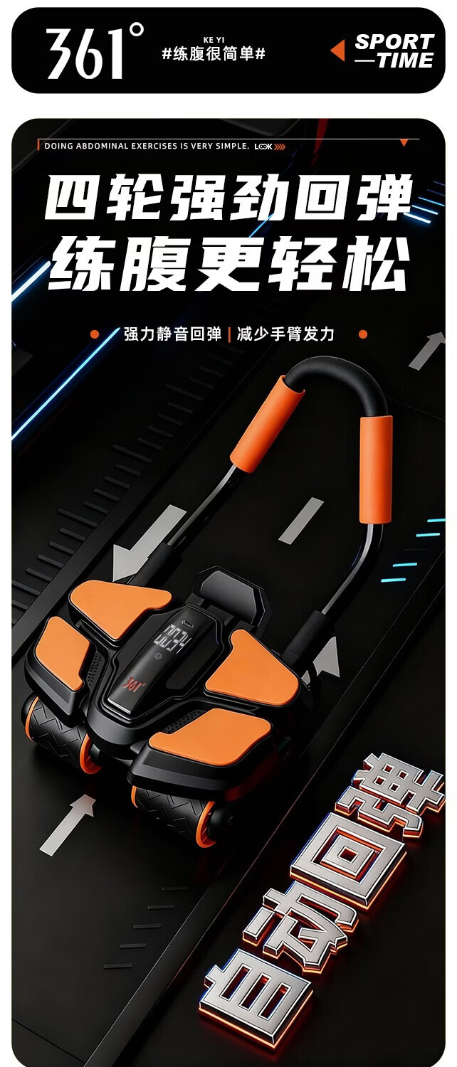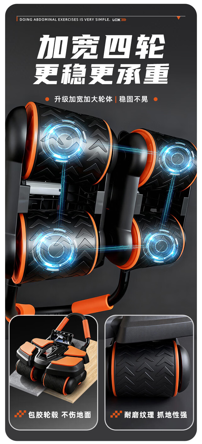 361°健腹轮自动回弹肘撑四轮健身运动器材腹肌训练器瘦肚子收腹练腹肌 特大橙黑色【智能数显+自动回弹】(送跪垫)