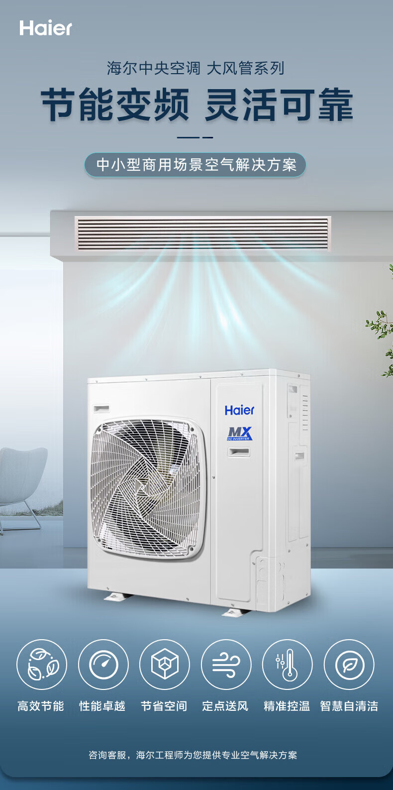 海尔风管机一拖一大6匹中央空调大风量节能变频中央空调商用空调二级能效大双风扇