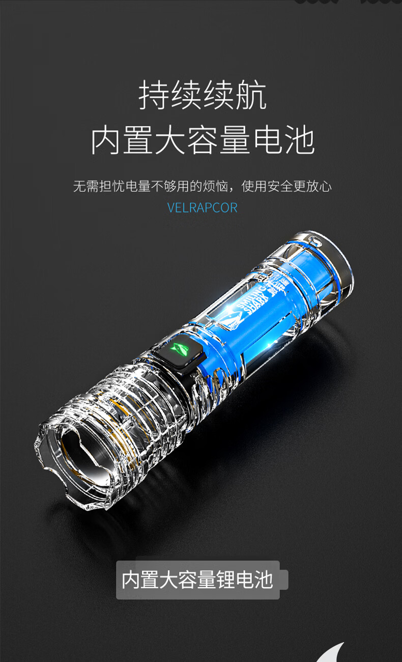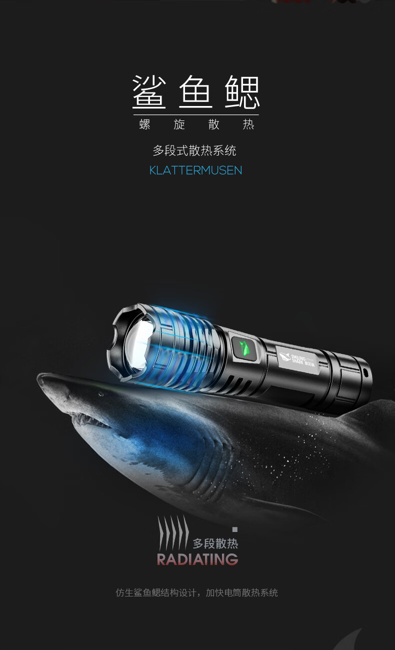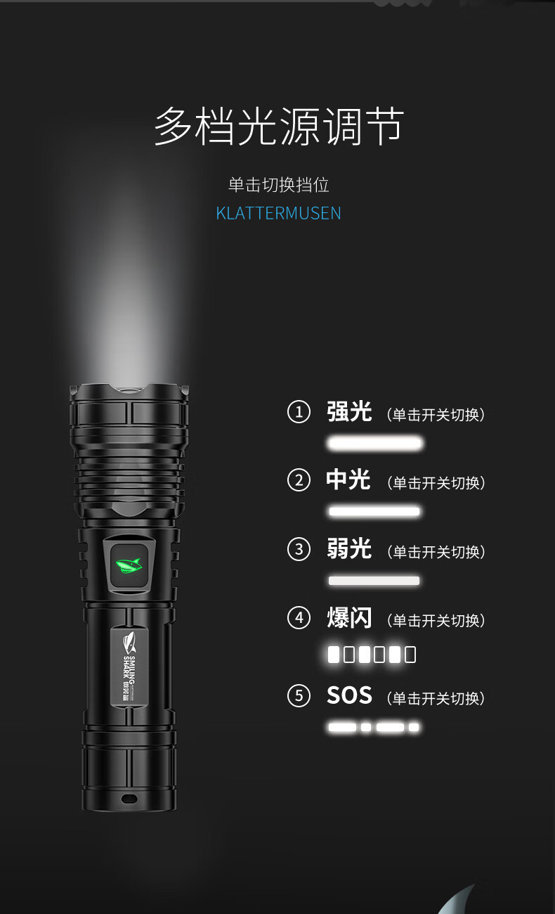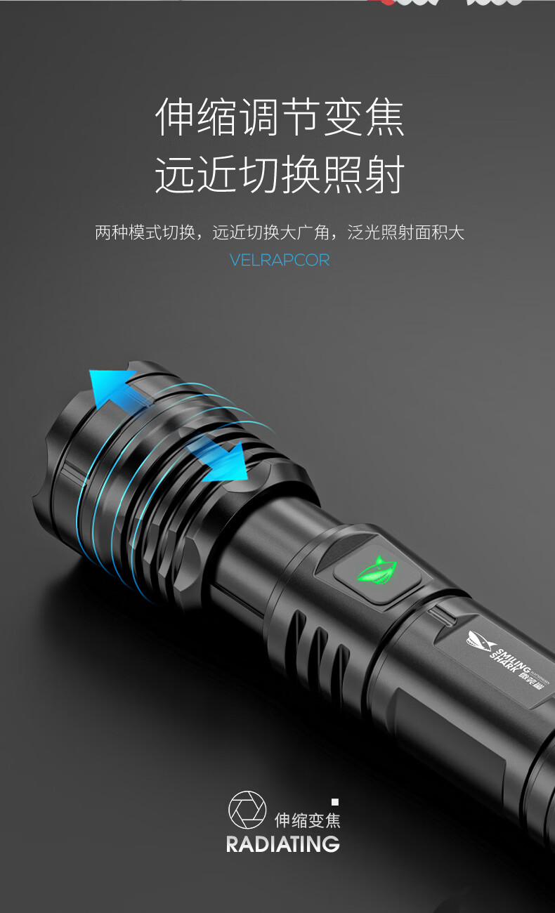 微笑鲨手电筒强光超亮可充电户外变焦远射长续航led家用小型便携照明灯 可伸缩调焦【高亮灯芯】小巧轻便
