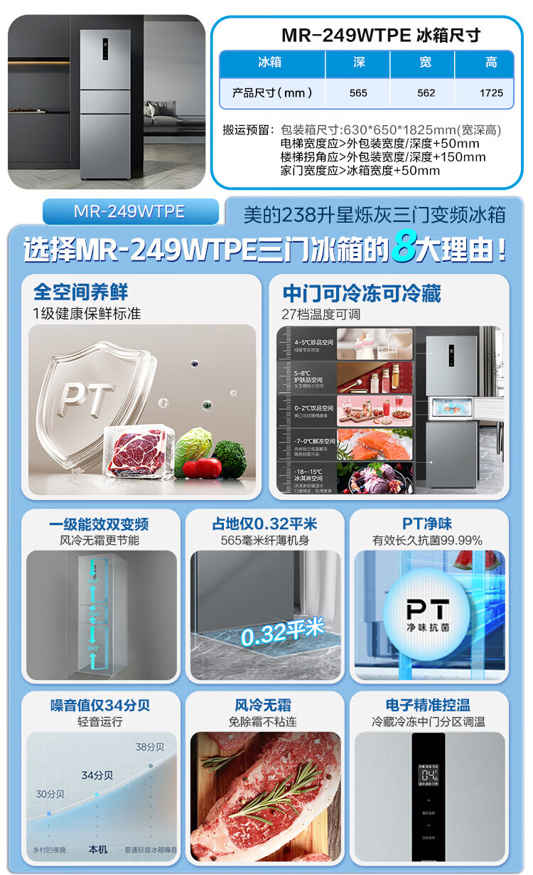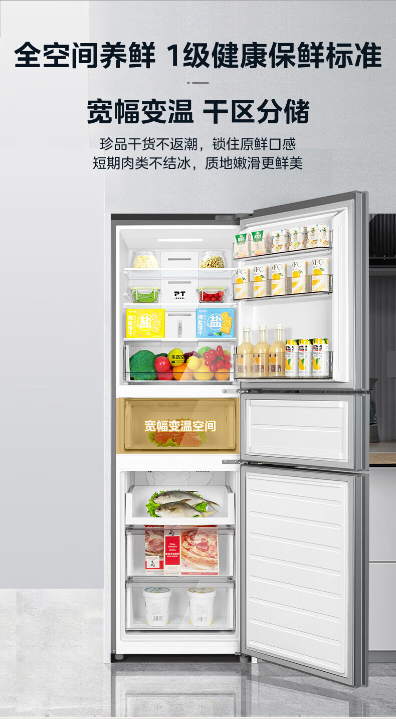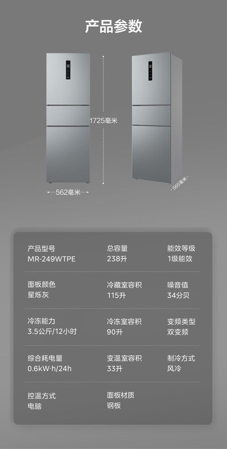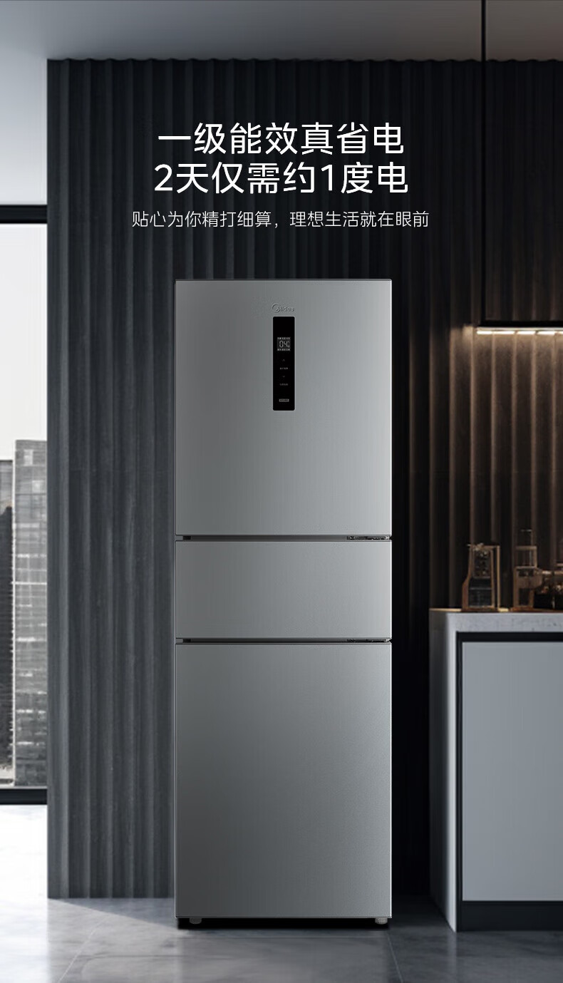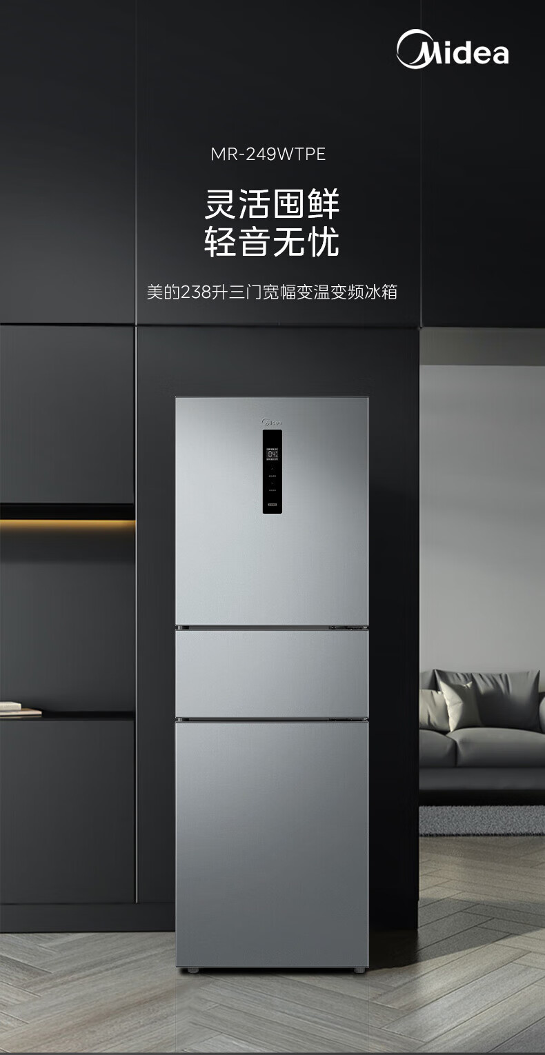 美的(Midea)249三门多门冰箱变频一级能效风冷无霜中门变温大冷冻空间节能低噪租房小型MR-249WTPE国家补贴