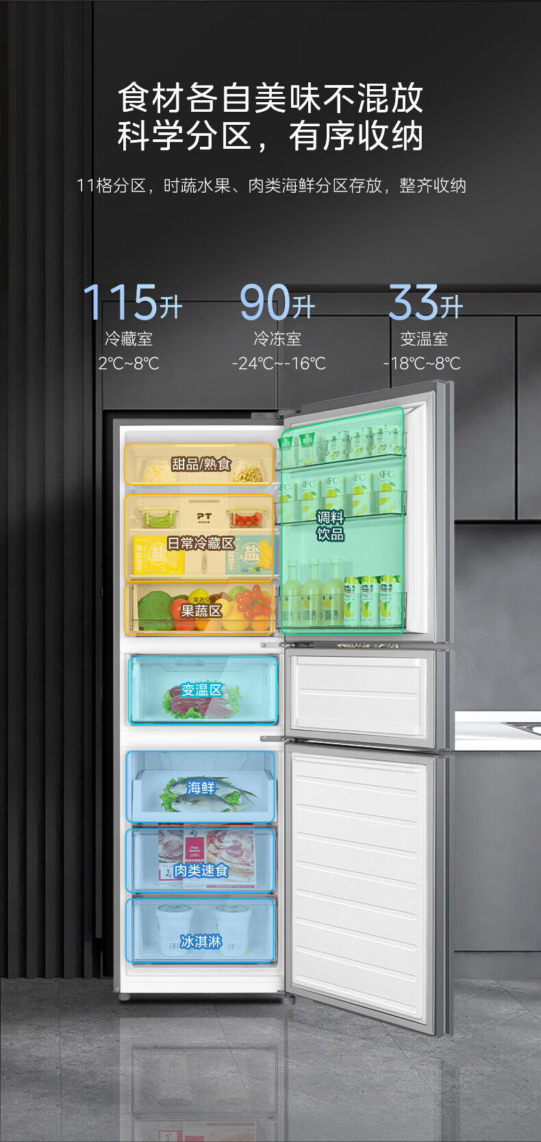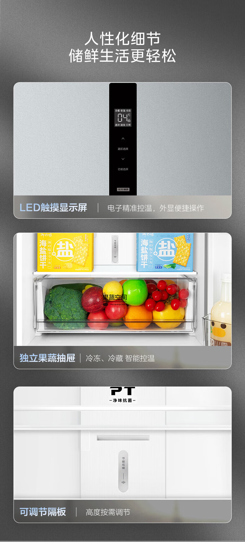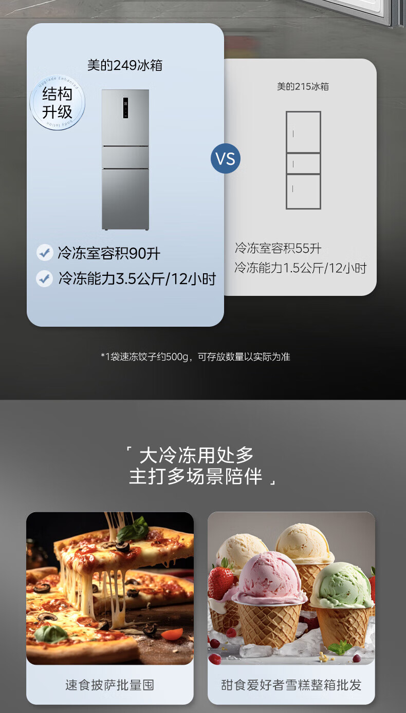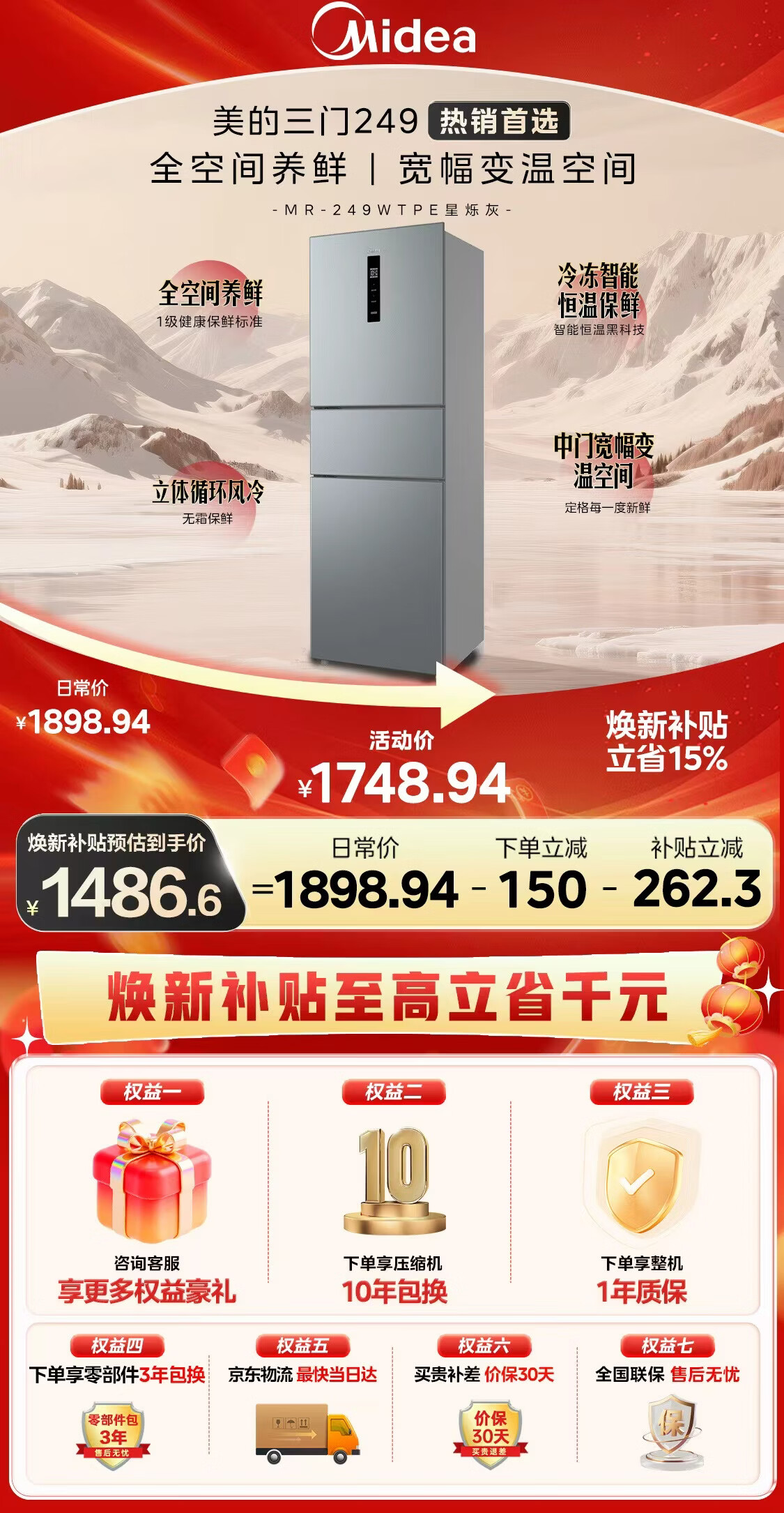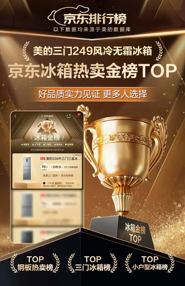 美的(Midea)249三门多门冰箱变频一级能效风冷无霜中门变温大冷冻空间节能低噪租房小型MR-249WTPE国家补贴