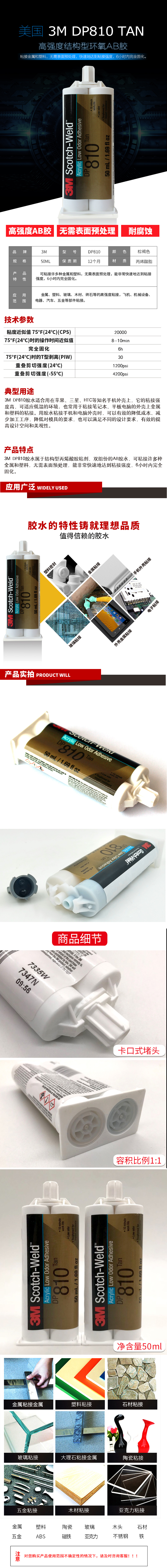 3M DP810胶水快速固化高抗冲击性强力金属玻璃亚克力木材陶瓷丙烯酸ab胶结构胶 50ml/1支