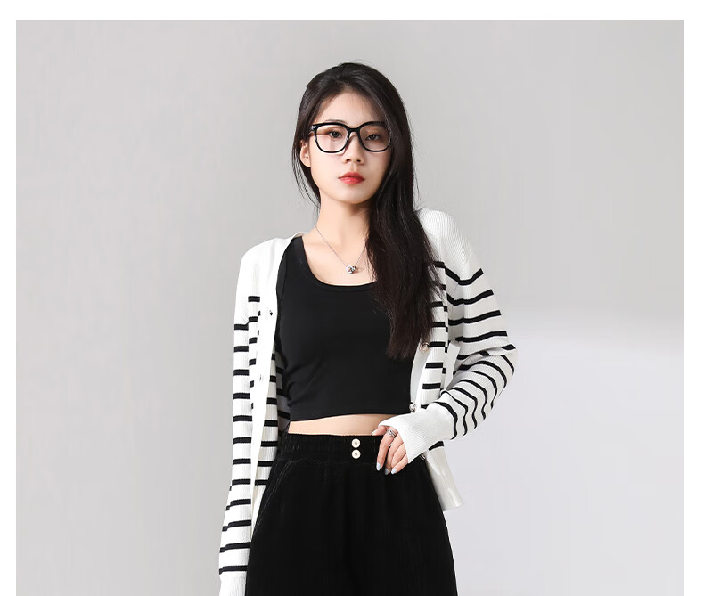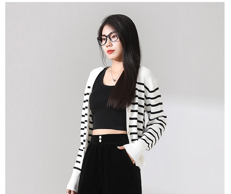 恒源祥条纹针织开衫女V领休闲加厚春季新款复古提花衫针织毛衣外套女 藏青色 M 【建议90-105斤】