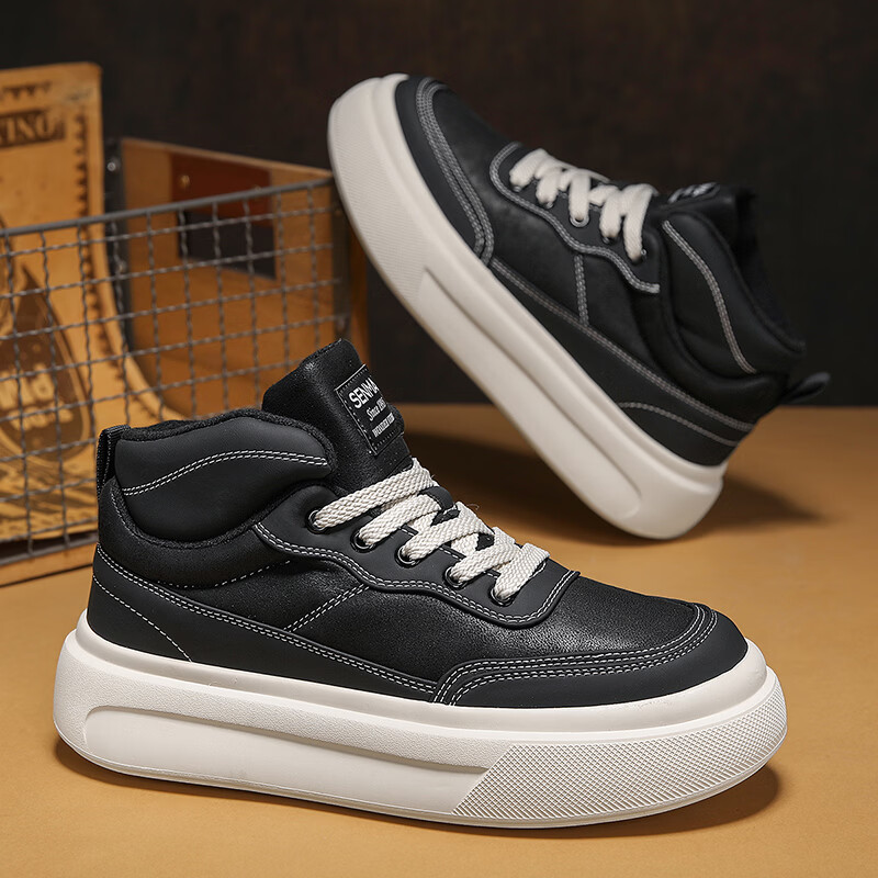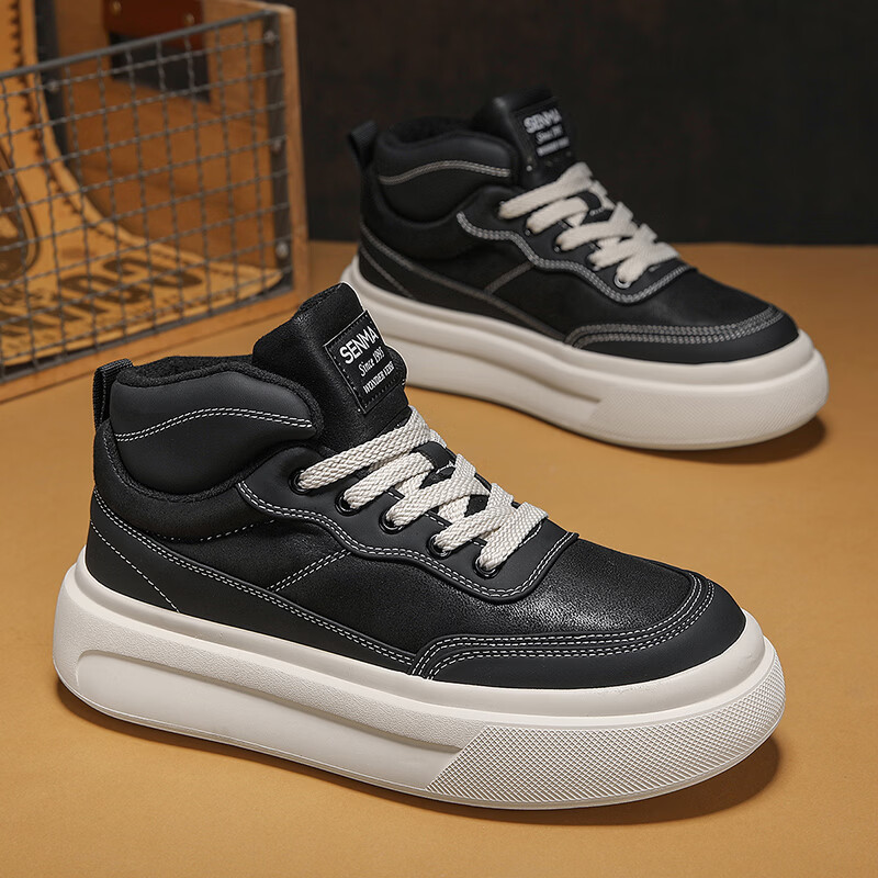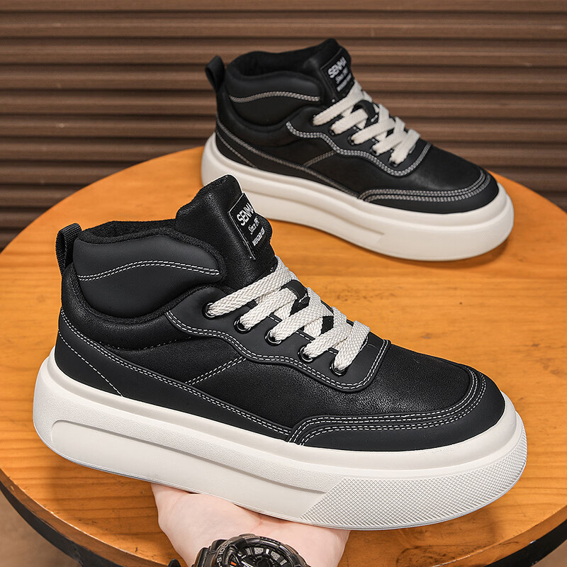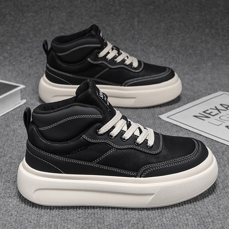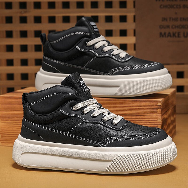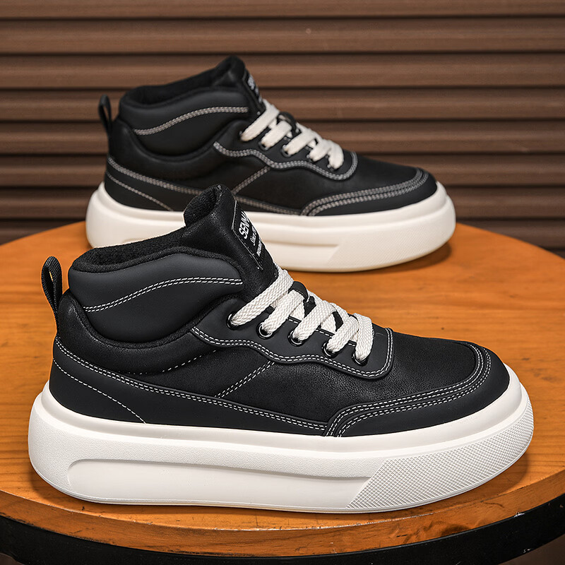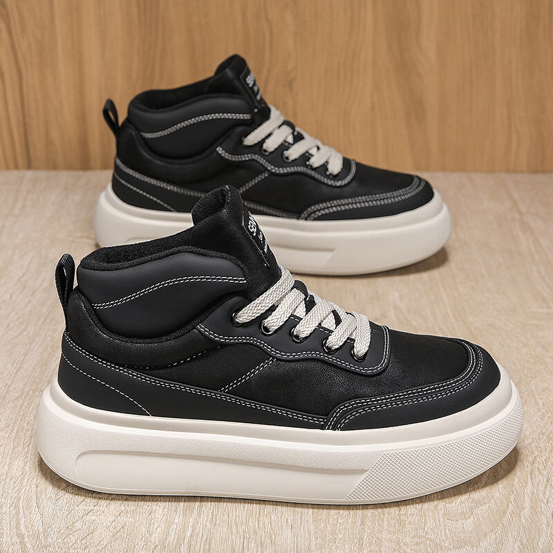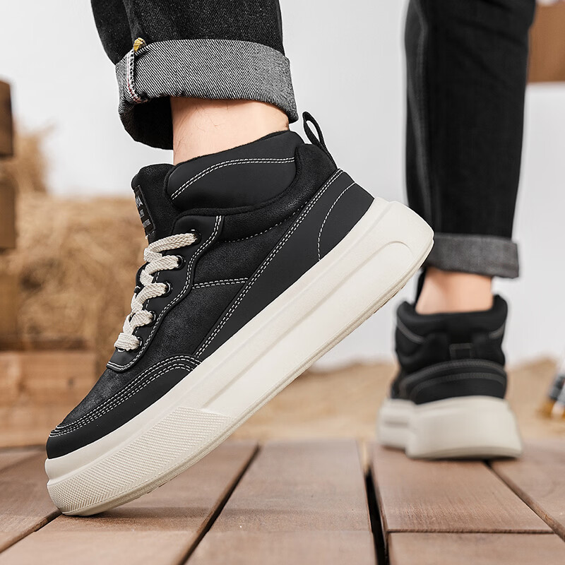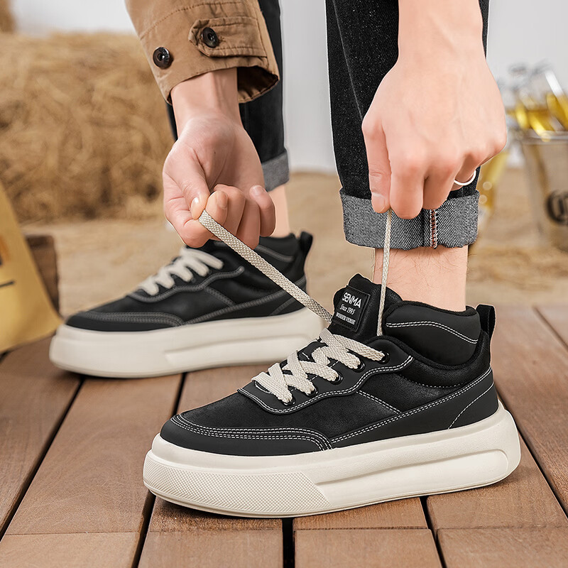 森馬高帮男鞋2026新款冬季加绒保暖棉鞋休闲运动板鞋男士厚底增高棉靴 黑色【基础款】 39 标准码数/现货秒发