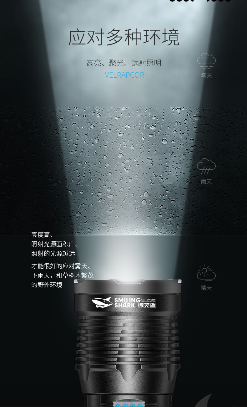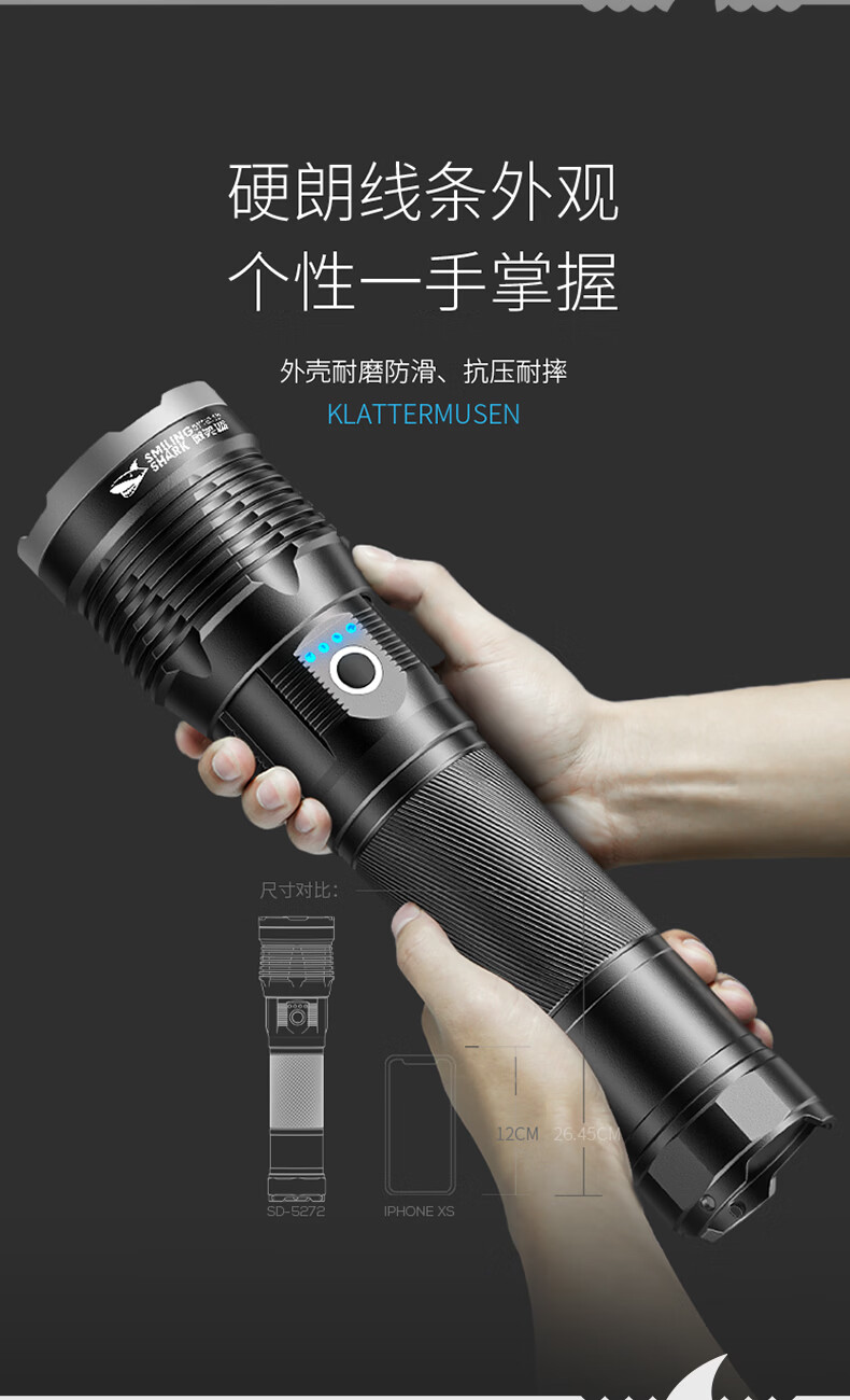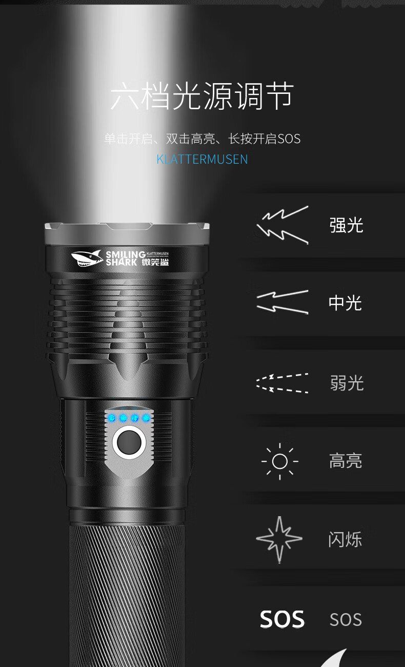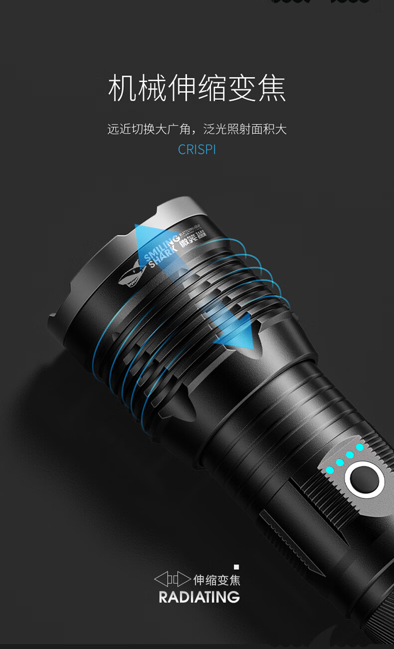 微笑鲨强光手电筒超亮变焦远射户外可充电超长续航大功率便携应急照明灯 爆亮远射【铝合金外壳】伸缩调焦