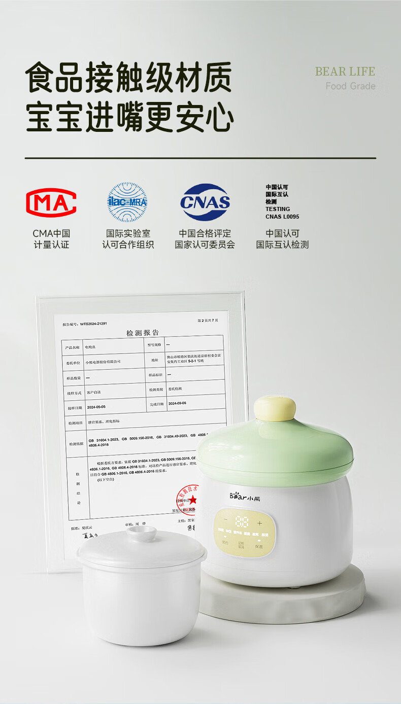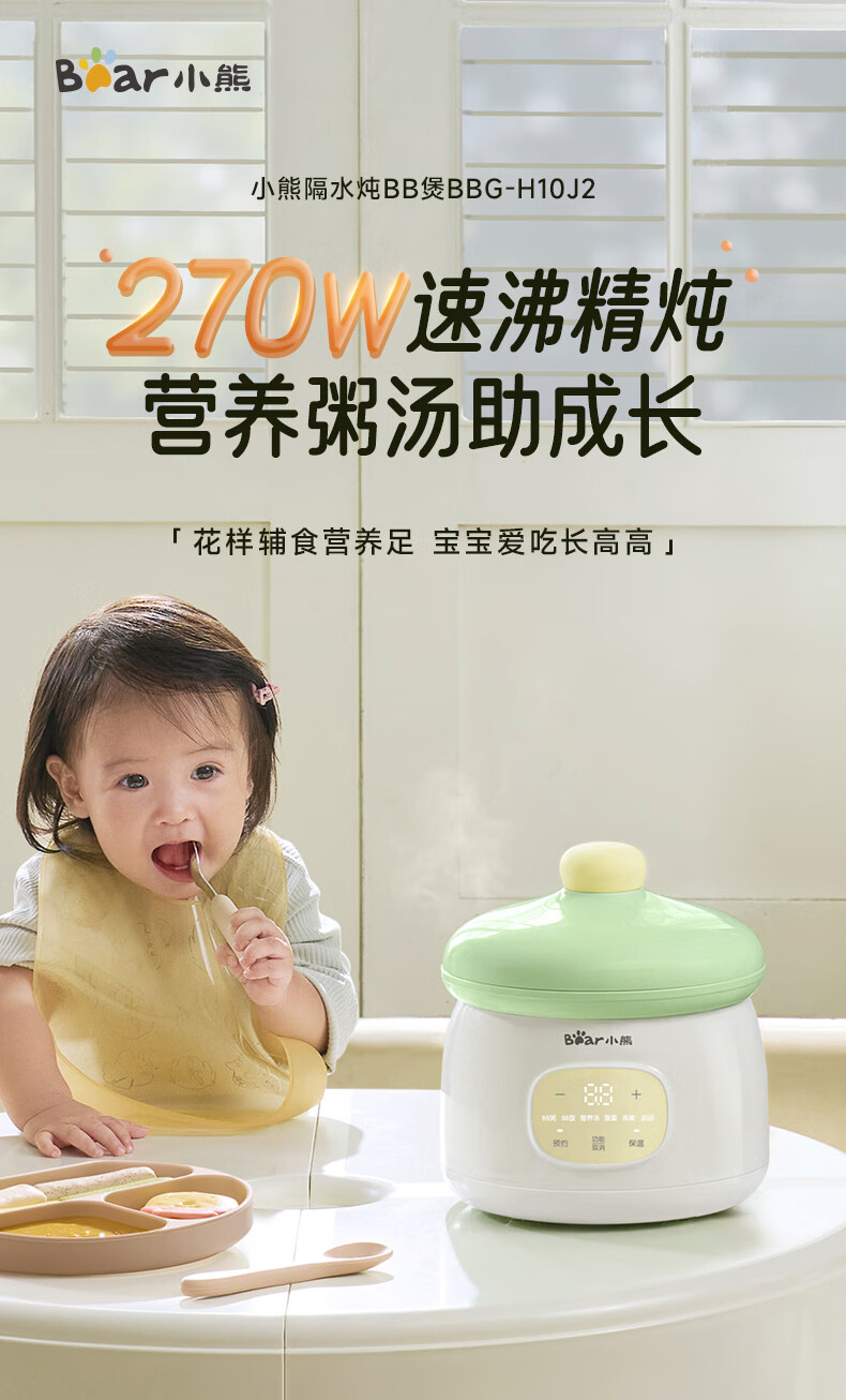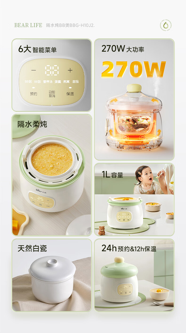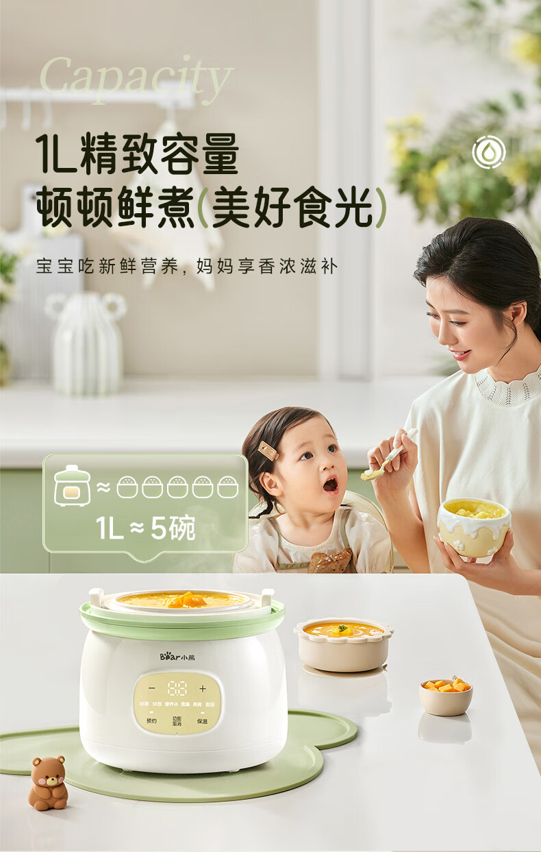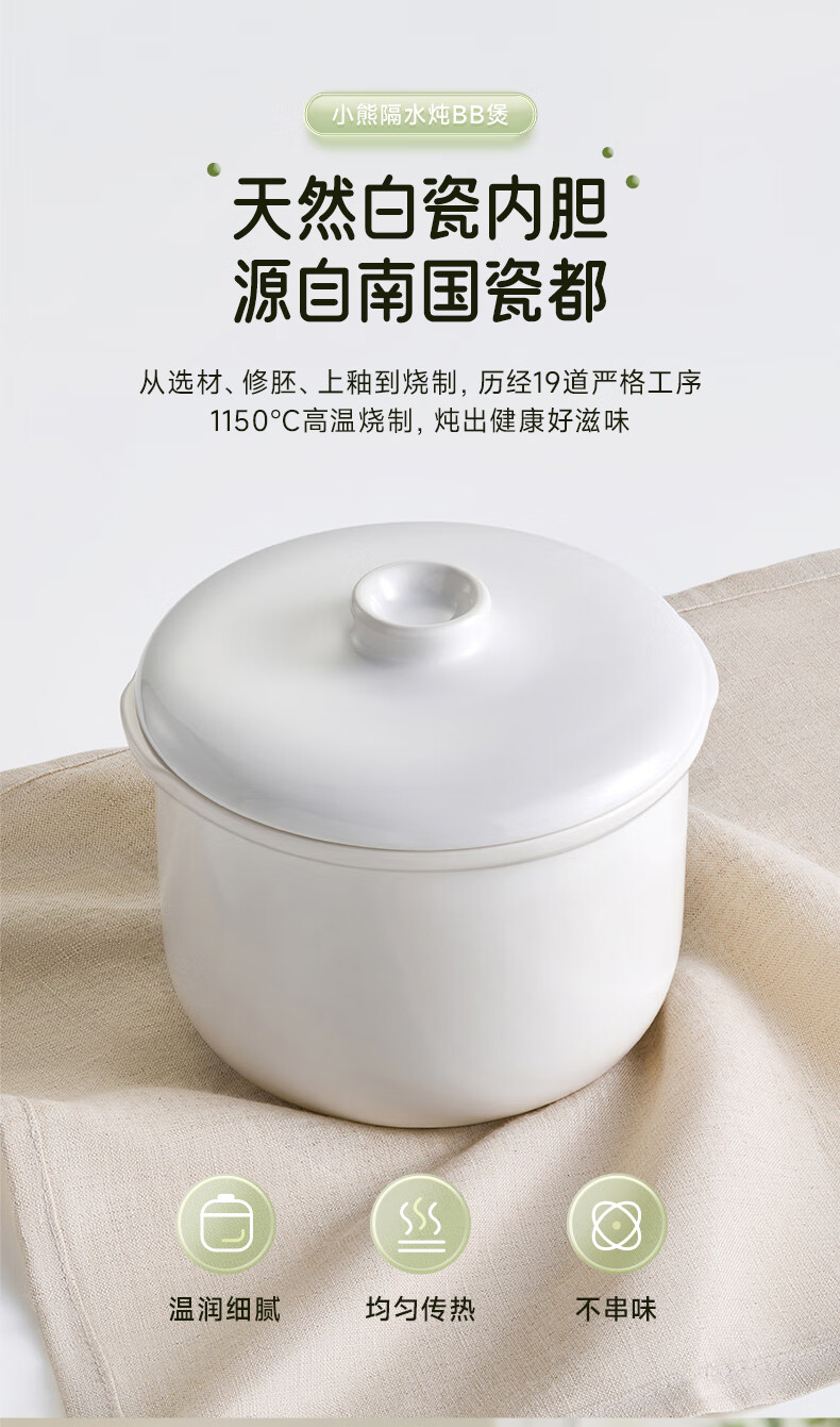 小熊(Bear)辅食锅婴儿辅食机bb煲 宝宝煮粥隔水电炖盅天然陶瓷1L BBG-H10J2