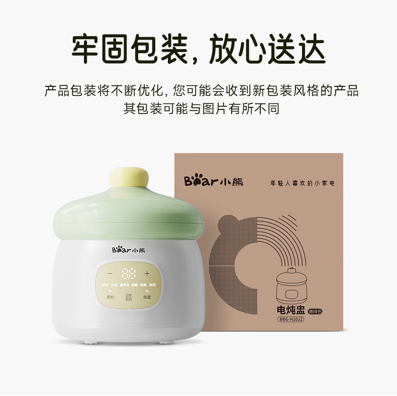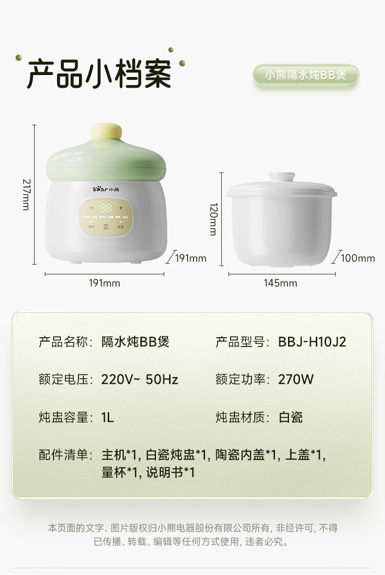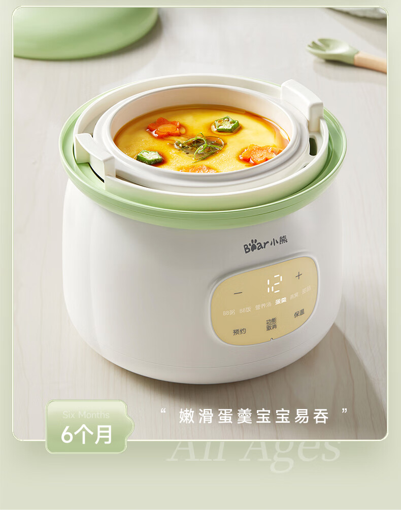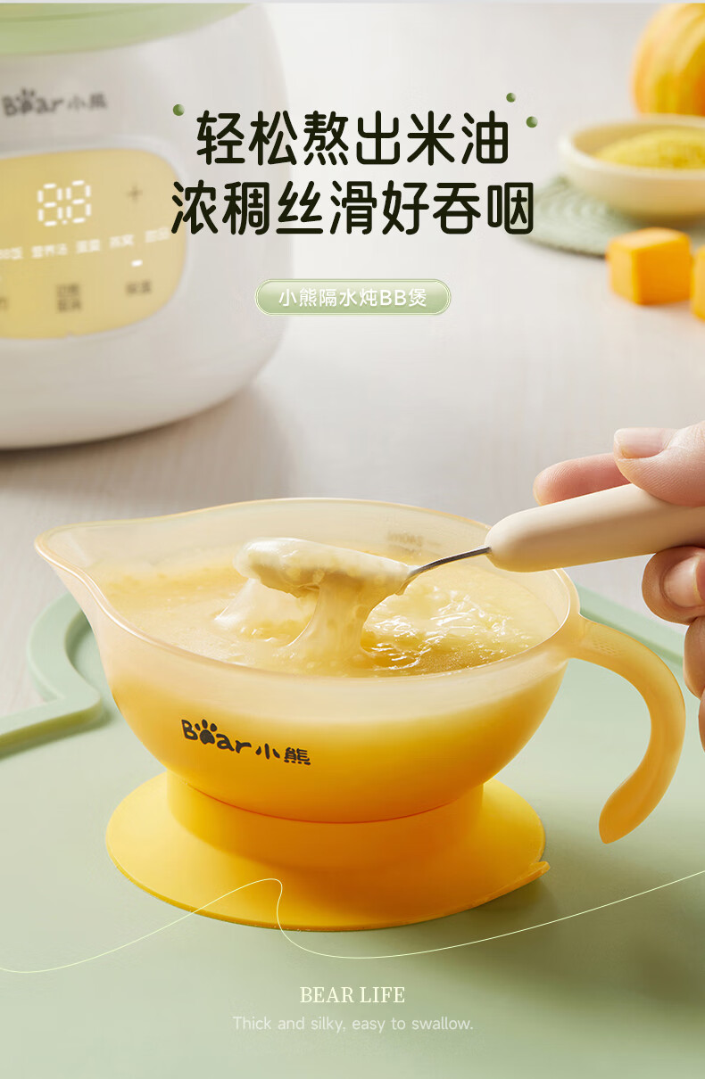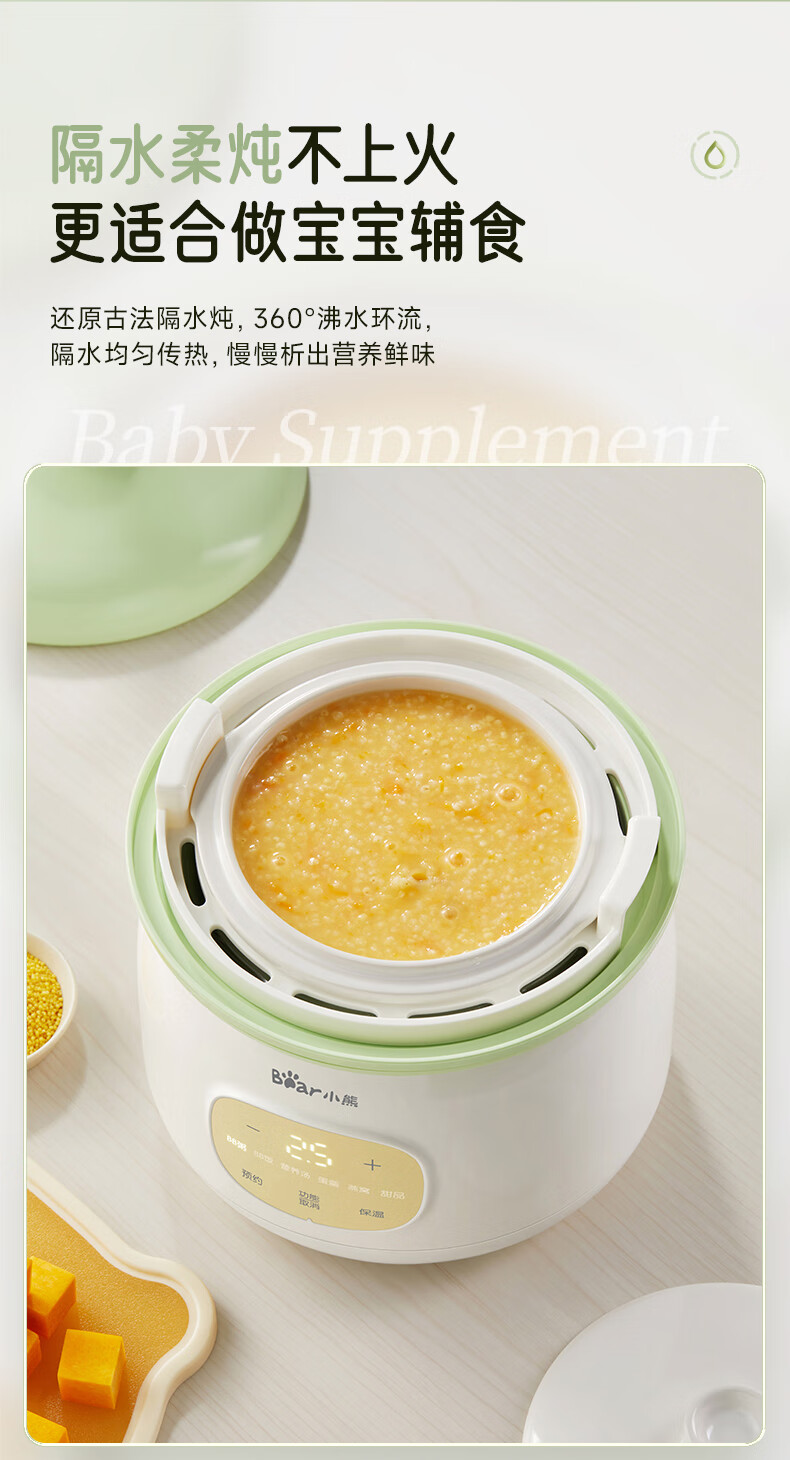 小熊(Bear)辅食锅婴儿辅食机bb煲 宝宝煮粥隔水电炖盅天然陶瓷1L BBG-H10J2