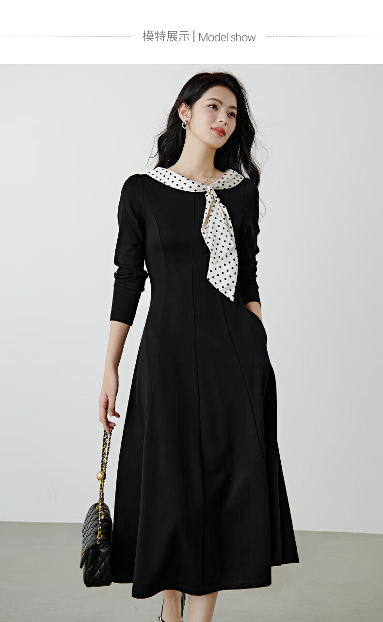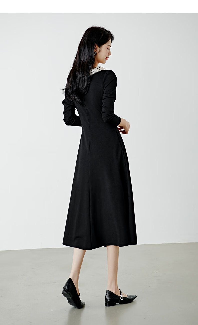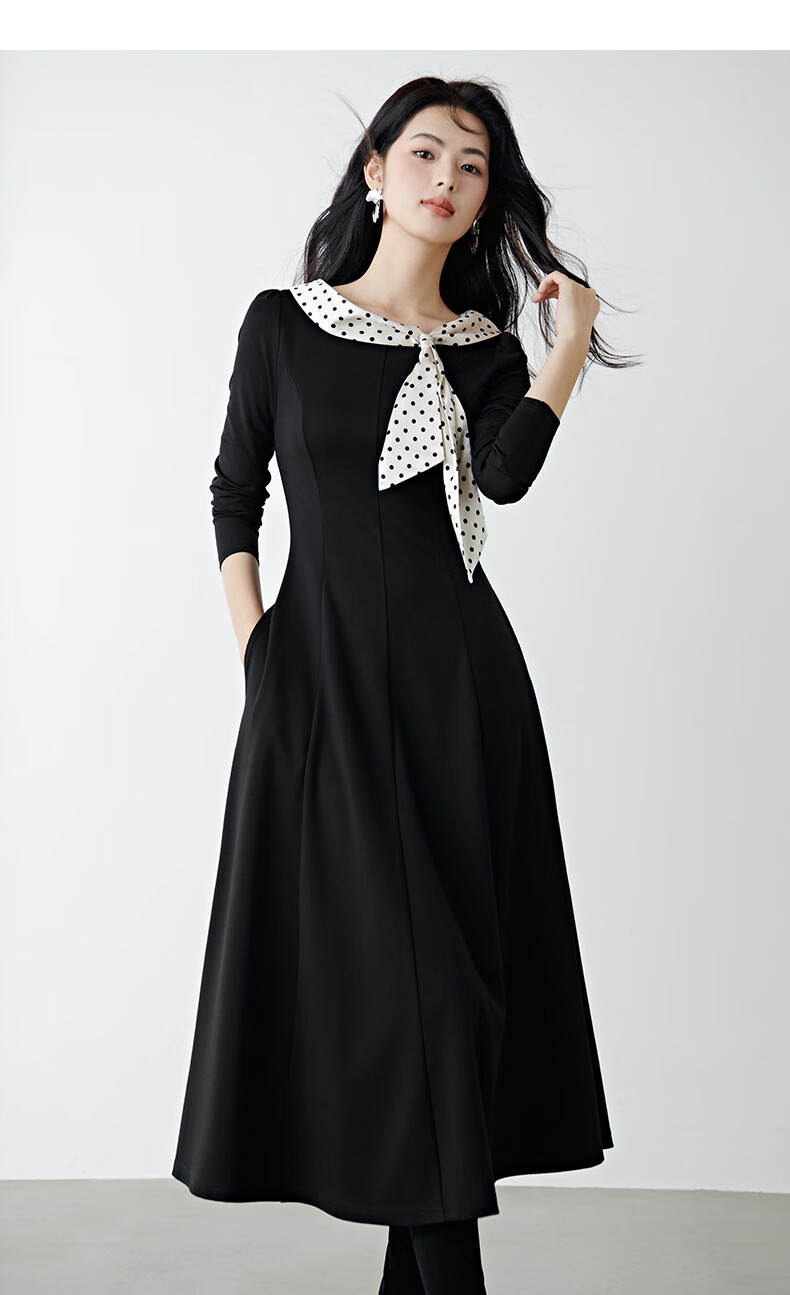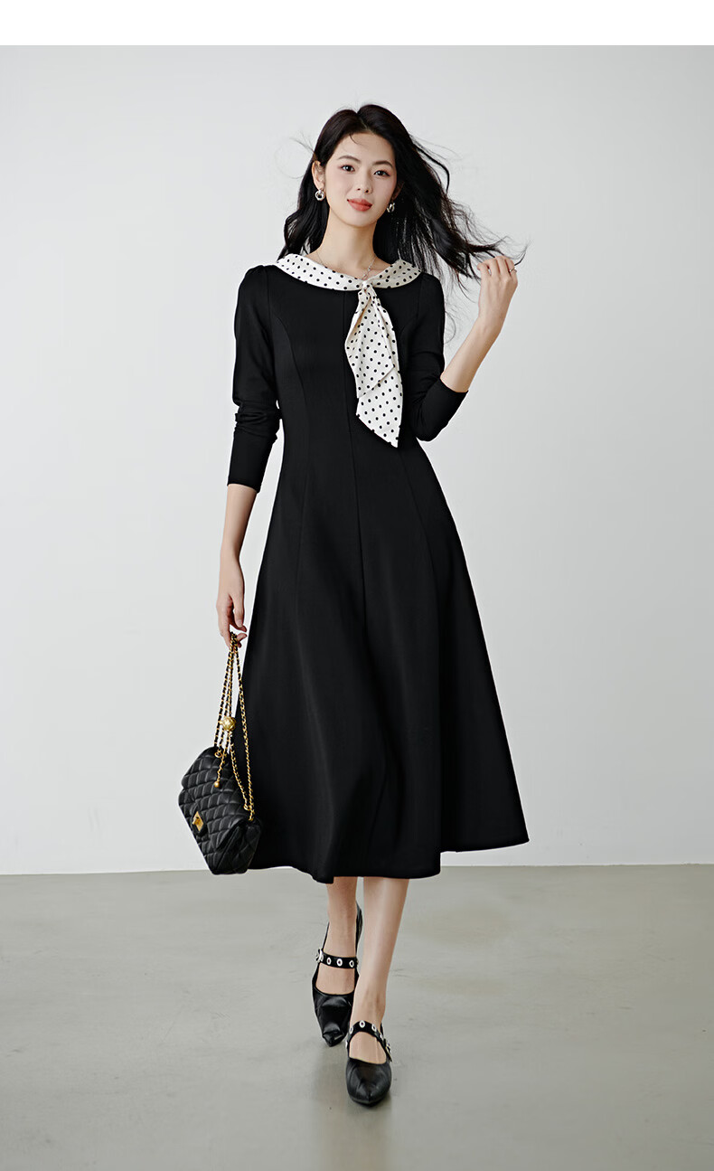 晚白2026年春款时尚波点法式拼接裙子修身显瘦弹力舒适通勤连衣裙 黑色 M