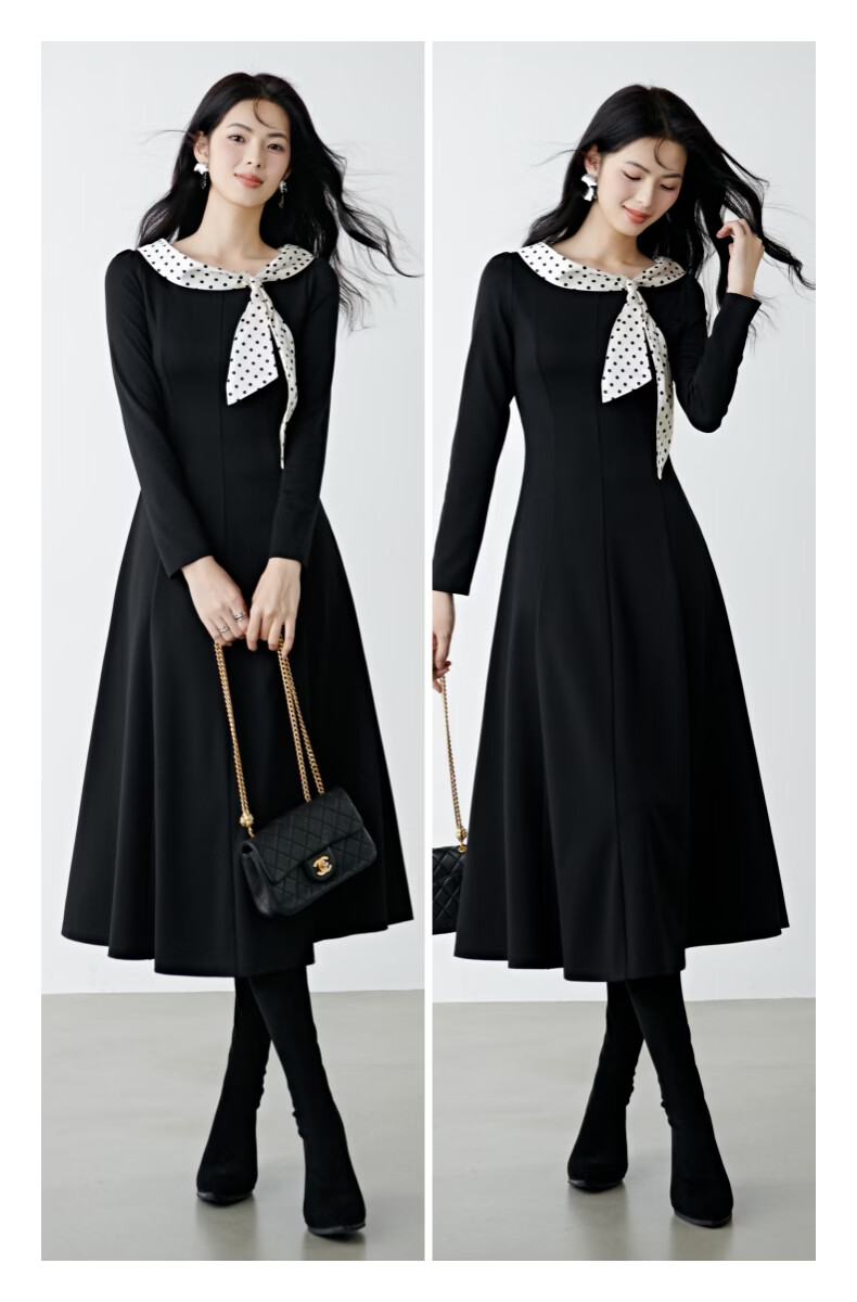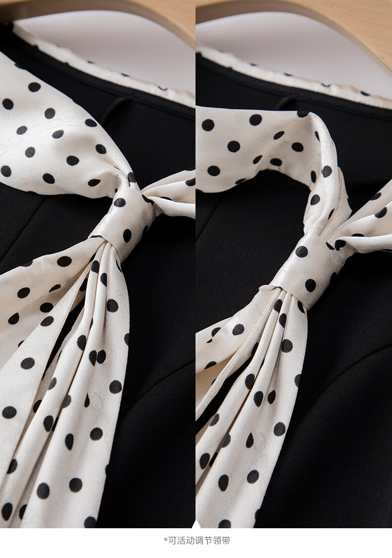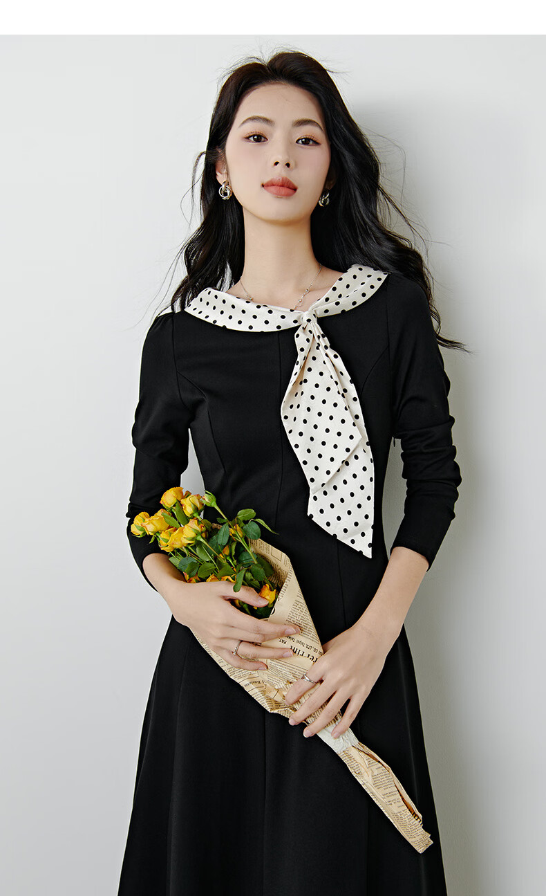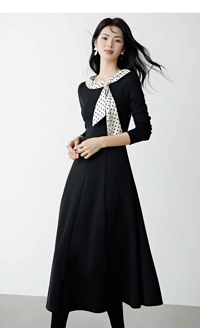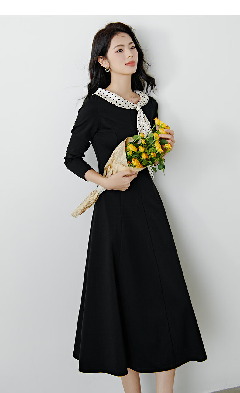 晚白2026年春款时尚波点法式拼接裙子修身显瘦弹力舒适通勤连衣裙 黑色 M