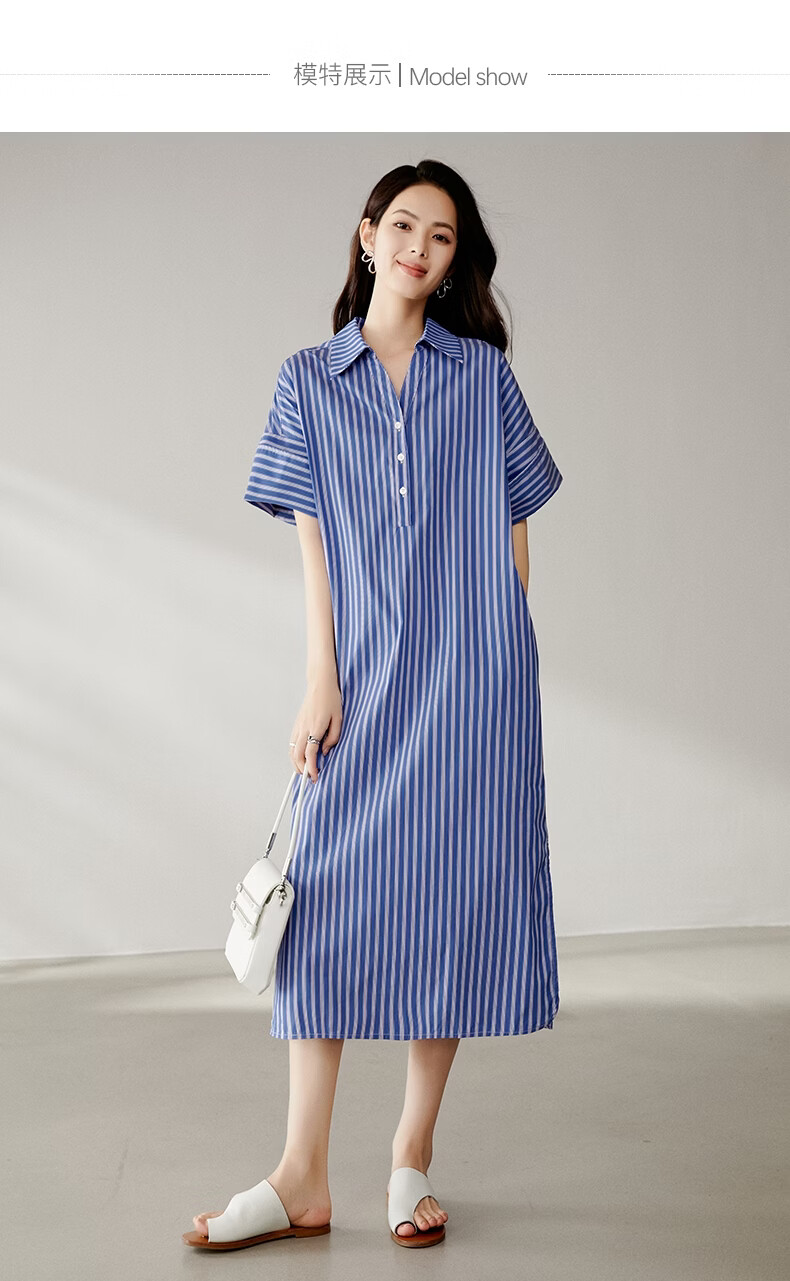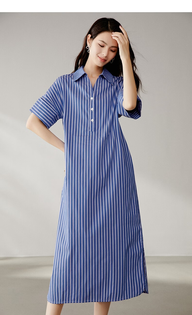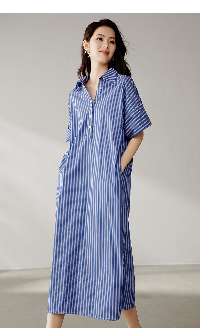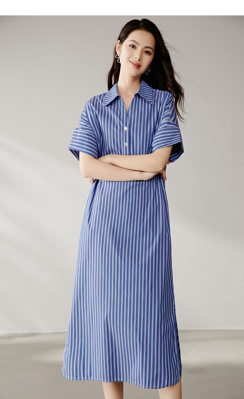 晚白【新品】2026年春款经典蓝白条纹衬衫裙宽松显瘦大码短袖连衣裙 蓝色 S
