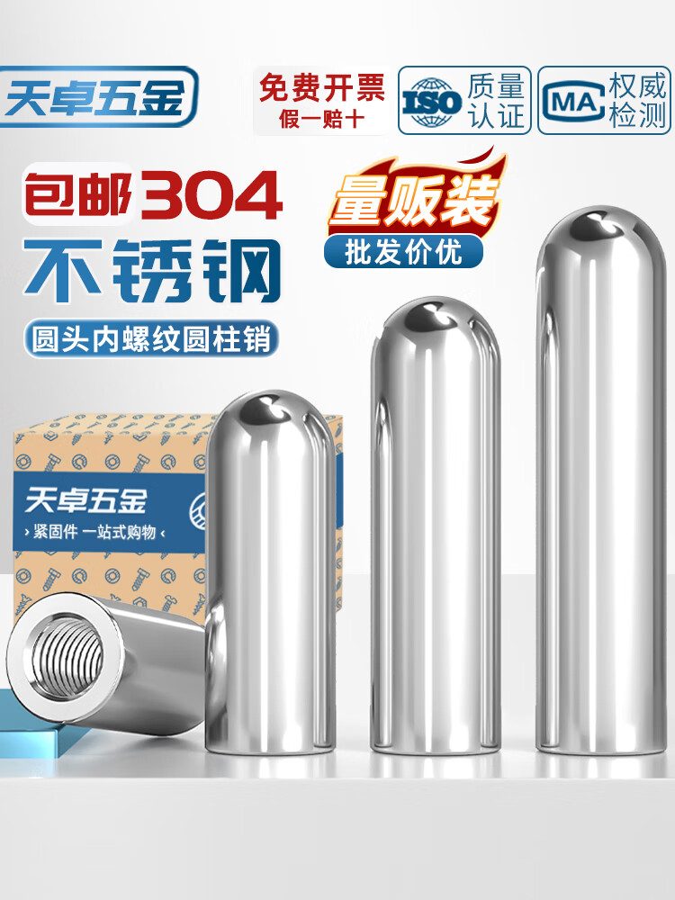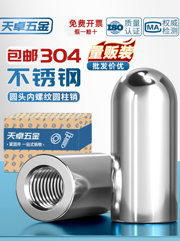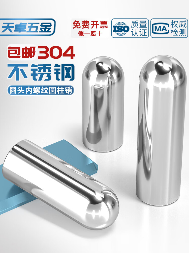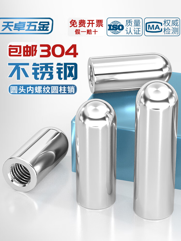 天卓五金304不锈钢内螺纹圆头圆柱销空心销内牙带孔销子定位销M4M5M6M8M10 Φ6*10*M3-10个