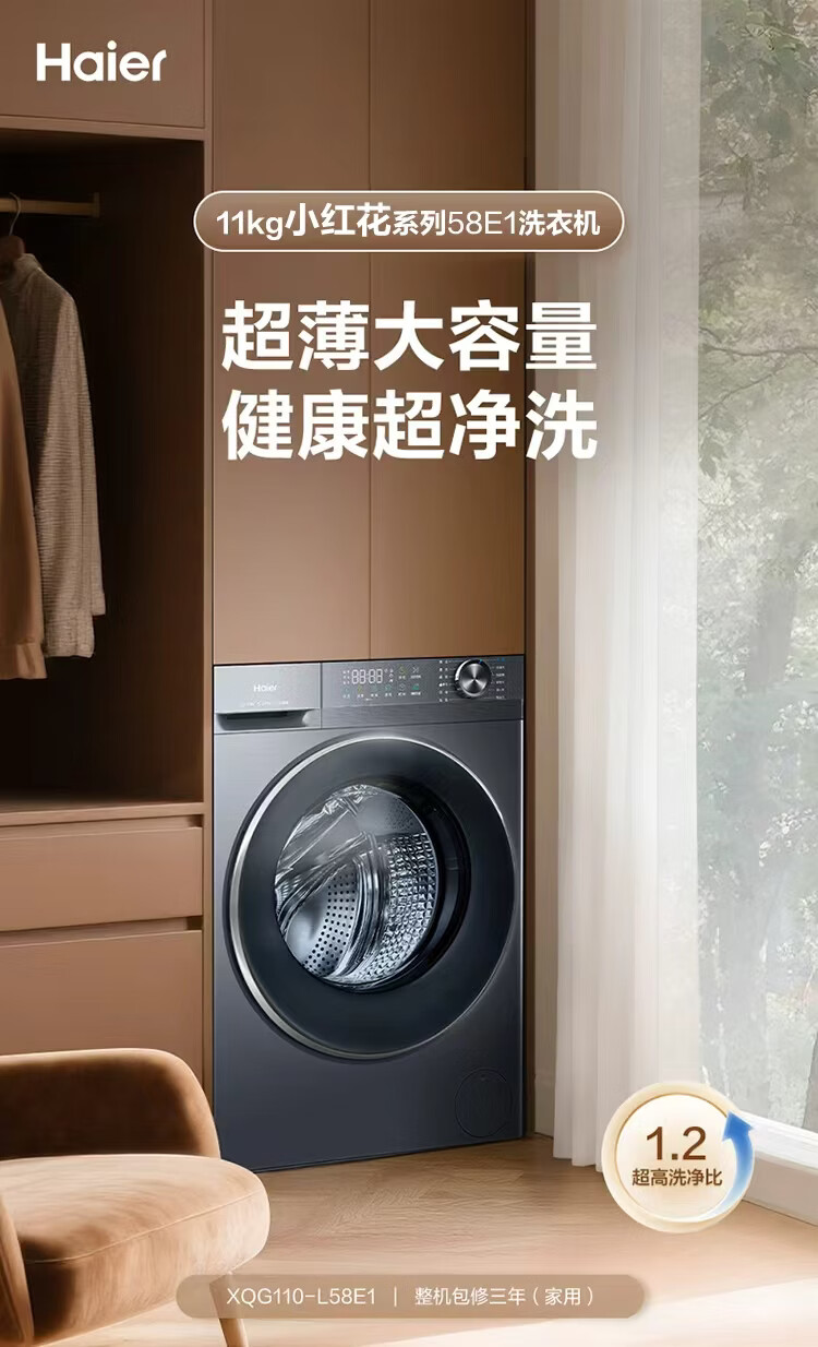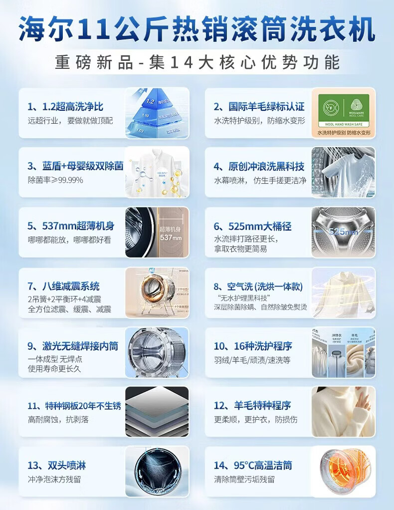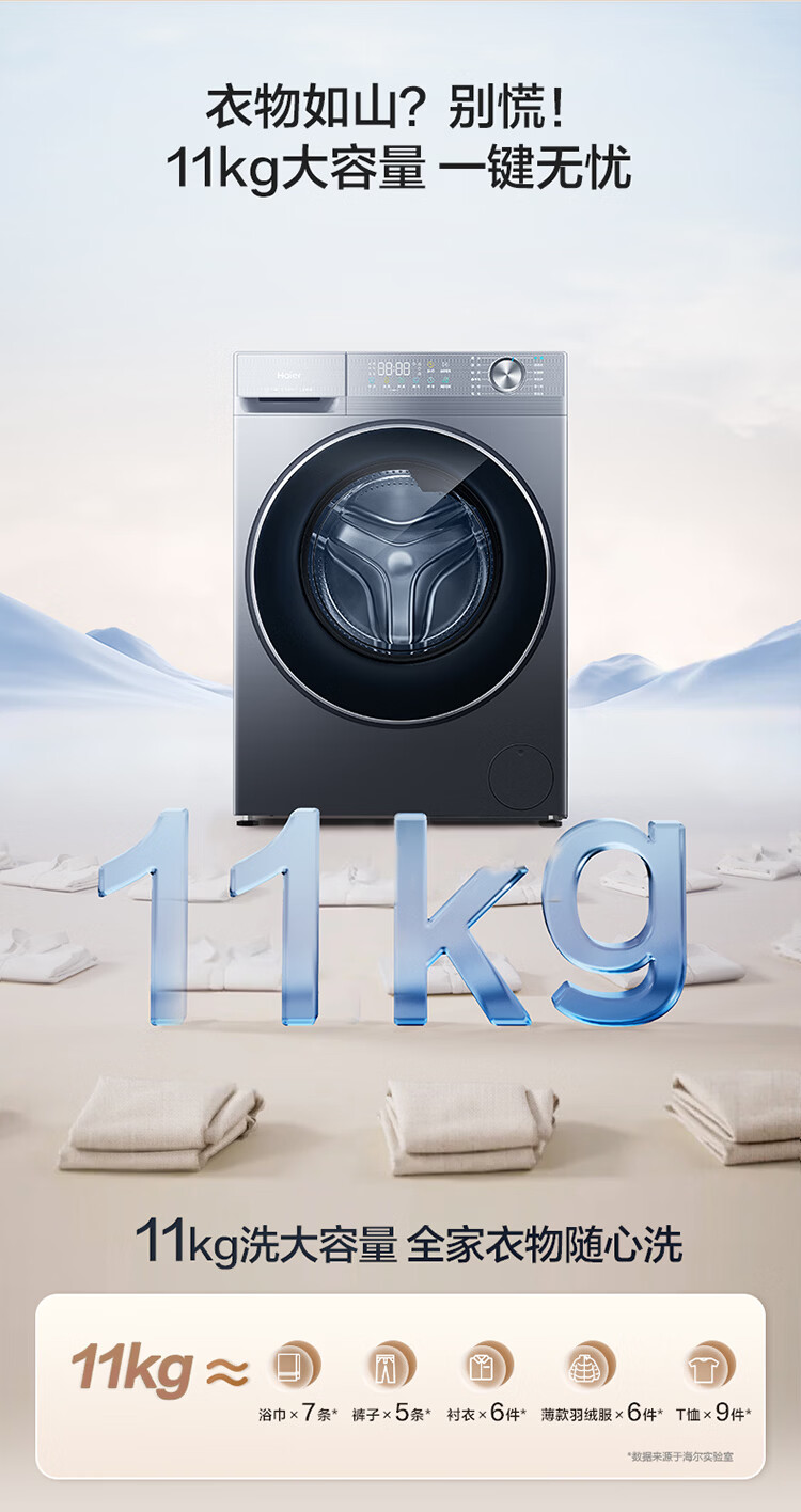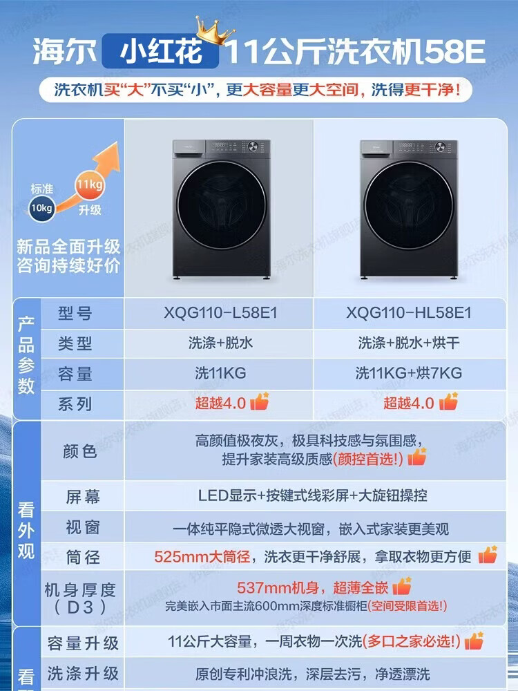 海尔洗衣机滚筒58E1洗脱/洗烘一体11公斤525大桶径冲浪洗一级能效变频全自动蓝盾除菌国家补贴以旧换新 【58E】11kg 滚筒 冲浪洗科技+双除菌+羊毛绿标