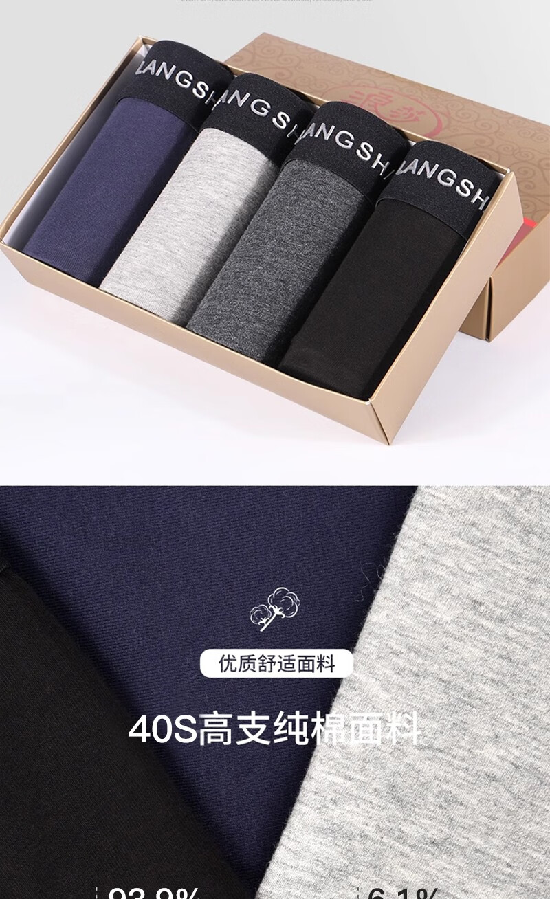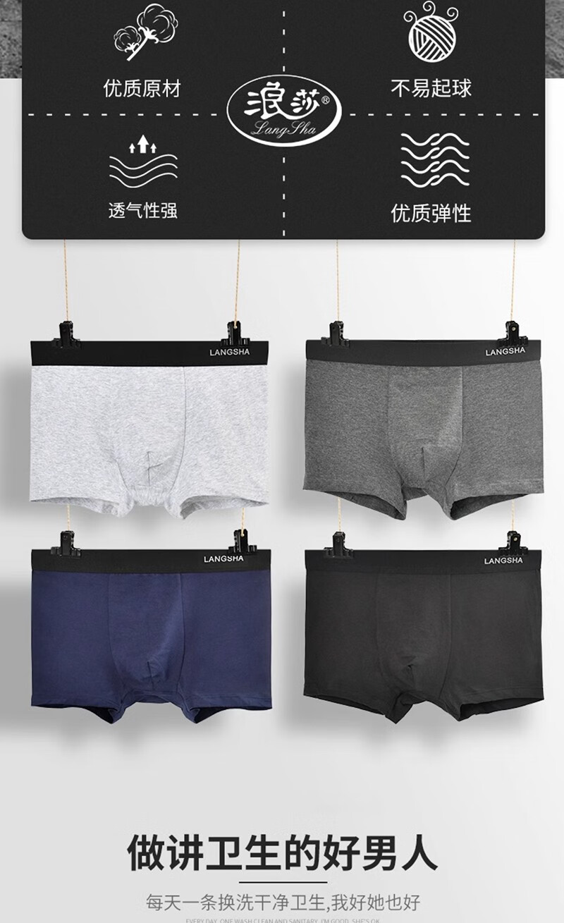 浪莎男士内裤男平角裤7A抑菌透气吸汗加大肥佬裤中腰四角裤4条盒装 AAAAAAA级抗菌-四色各一 3XL 151斤-170斤