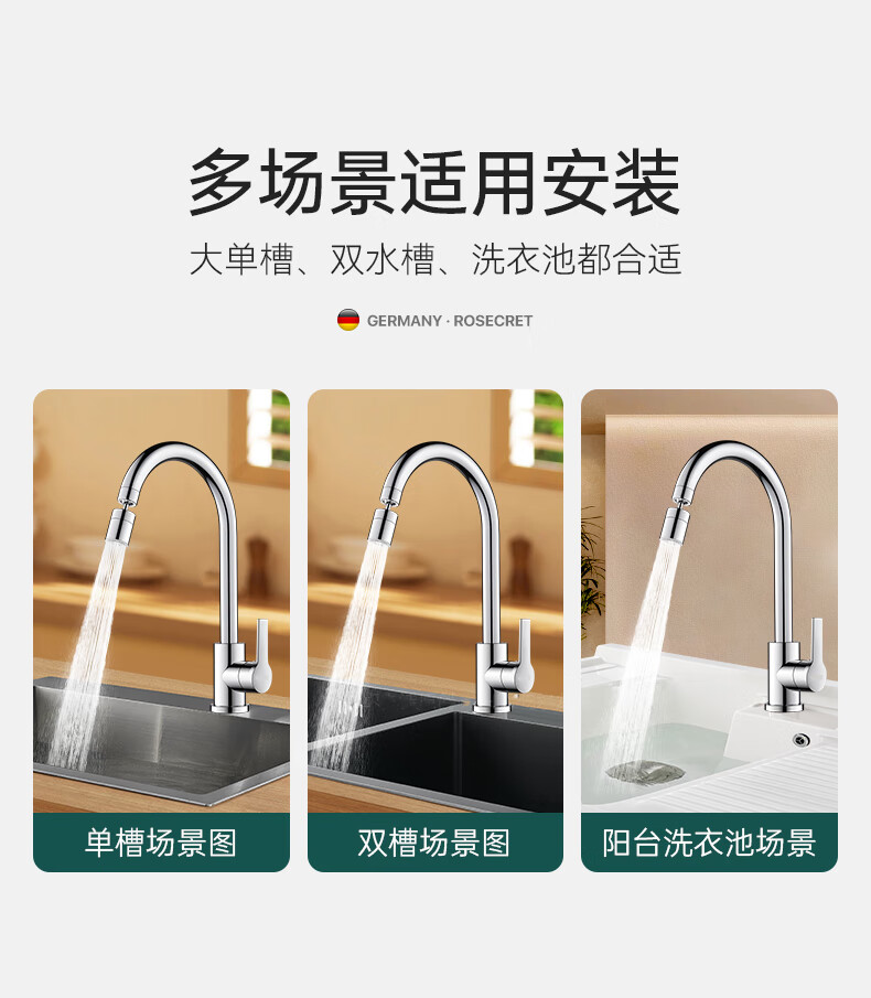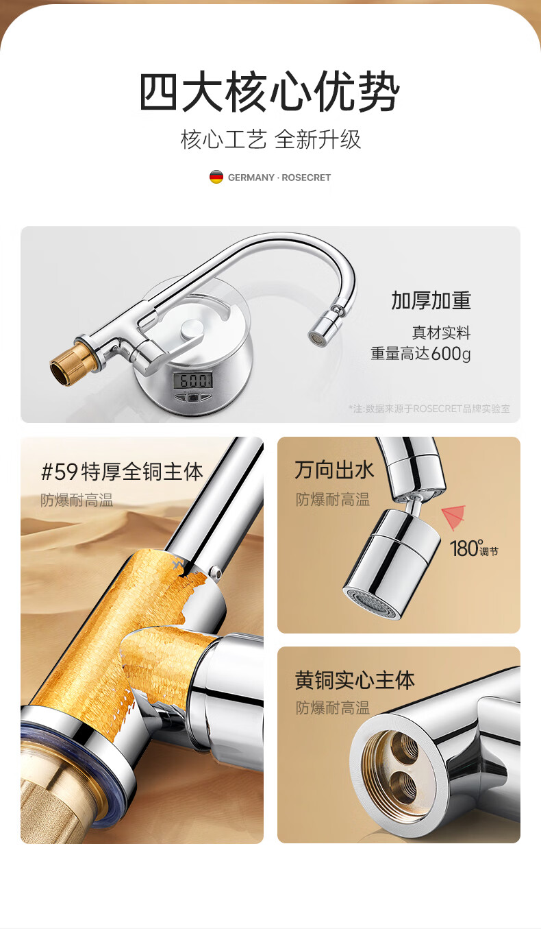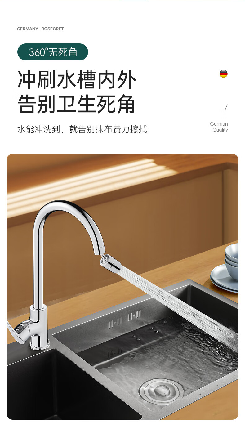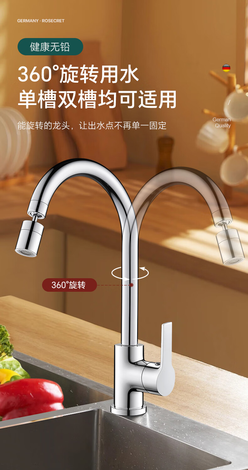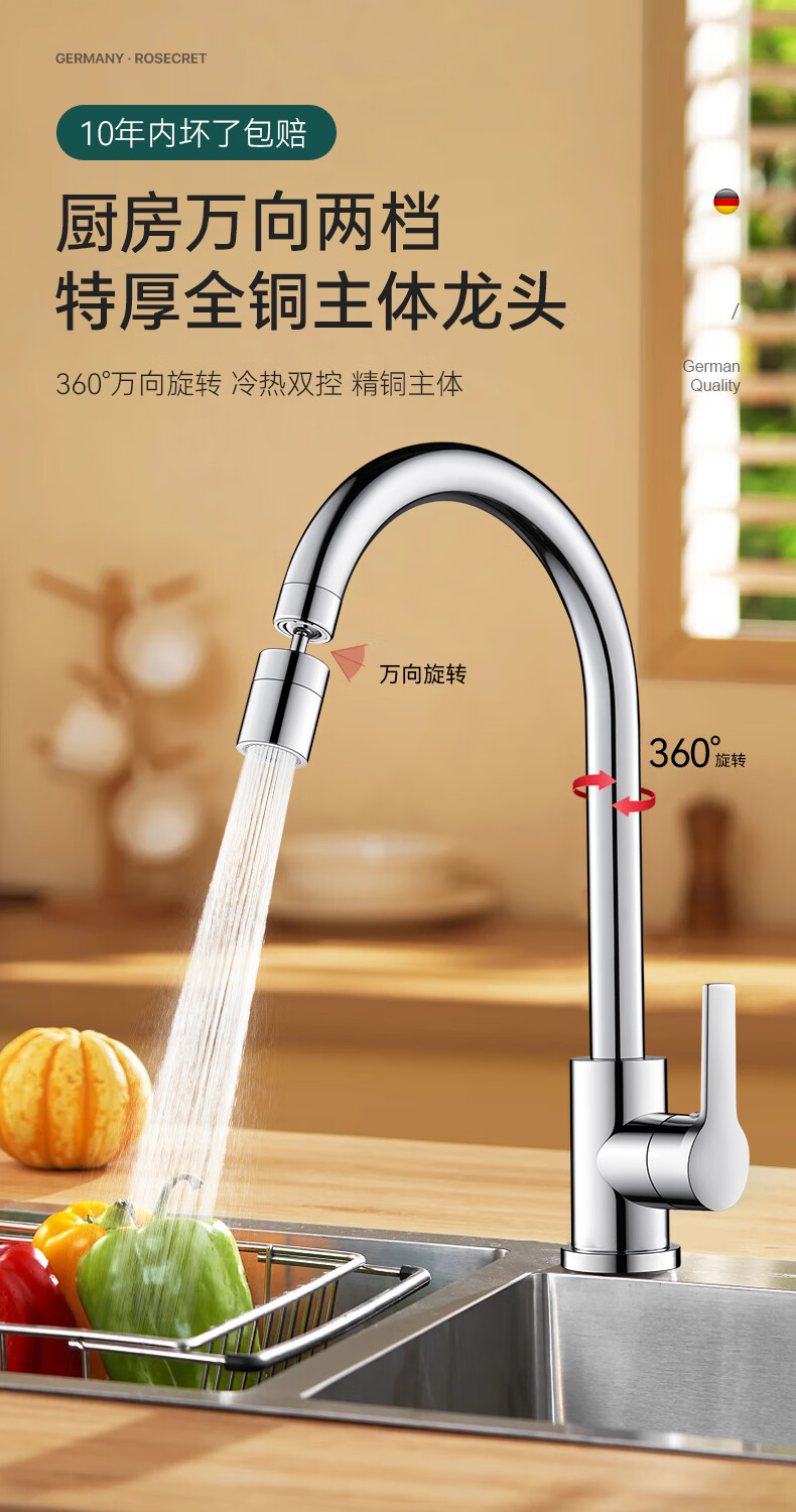 Rosecret【德国】全铜主体厨房水龙头高抛冷热水器二合一万向洗菜盆水龙头 厨房水槽双温龙头【两档亮银色】 万向增压防溅丨配80cm冷热进水管*2