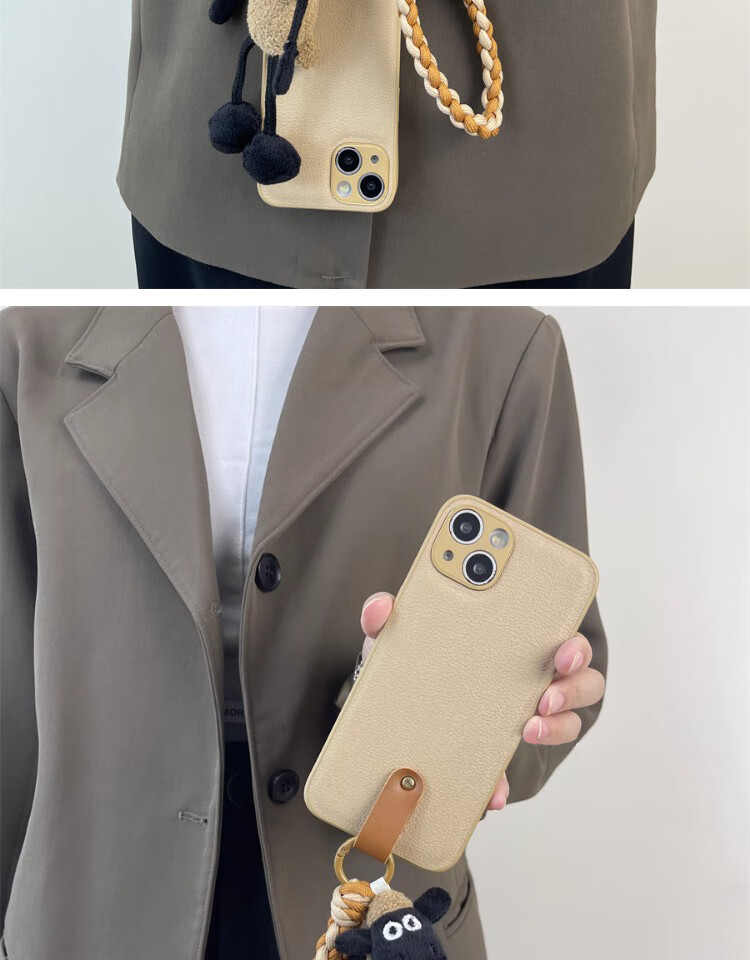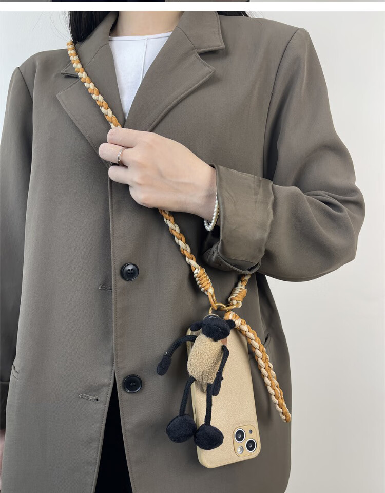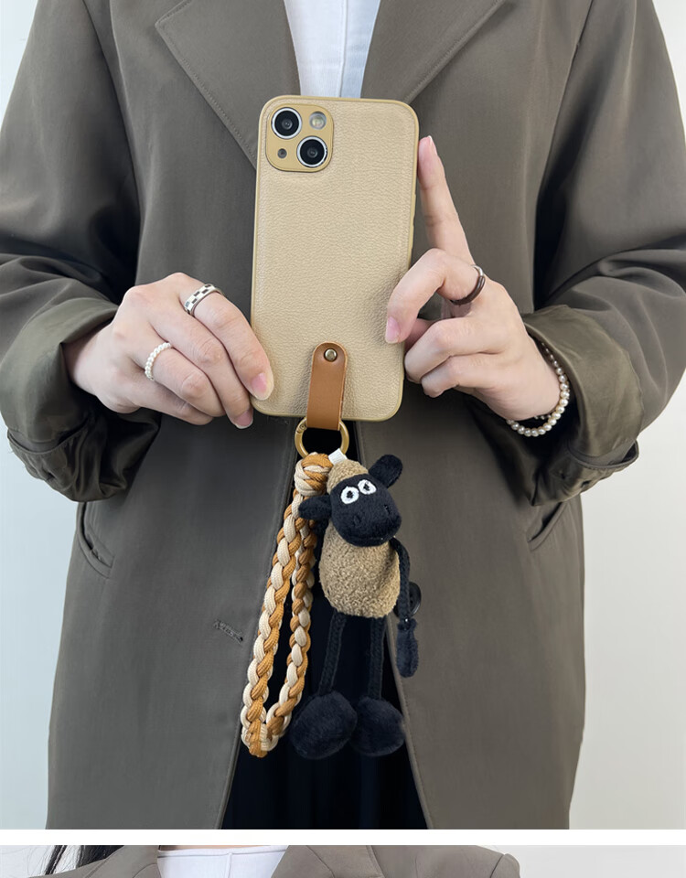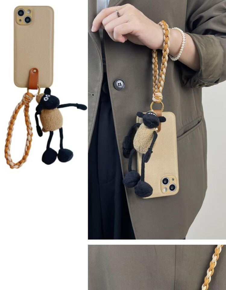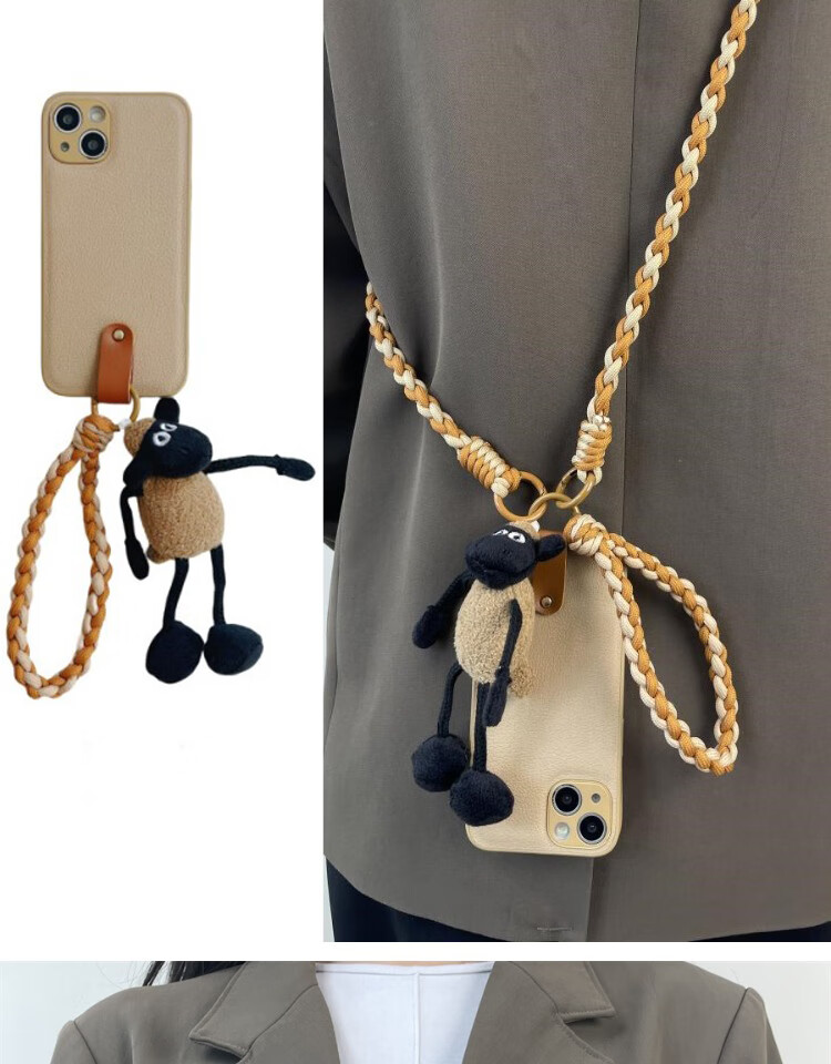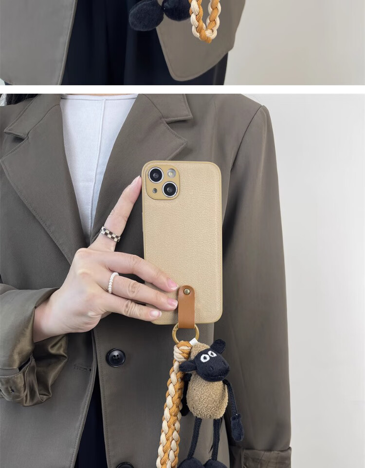 八脚兽毛绒小羊公仔挂件适用苹果17promax手机壳iphone16promax创意17秋冬15pro斜挎14防丢13PM手提侧背 卡其皮纹壳+毛绒小羊公仔+棕色手绳+斜挎长绳 iPhone 13 Promax