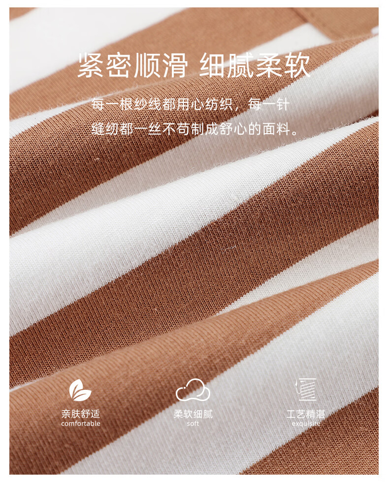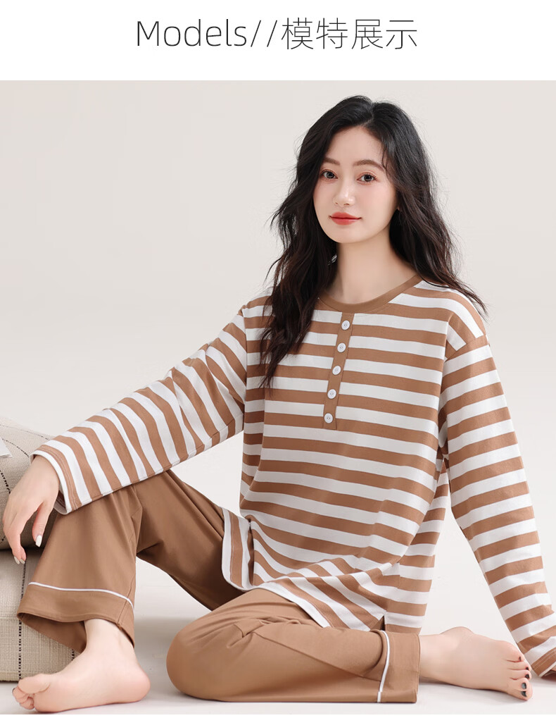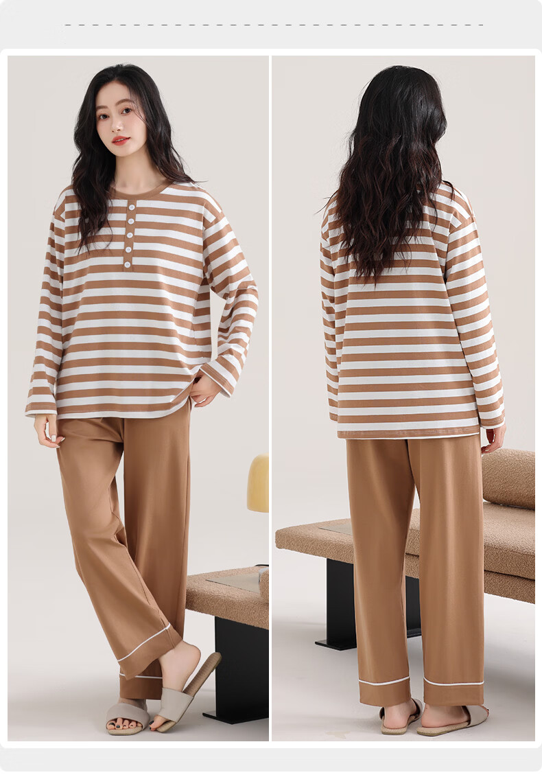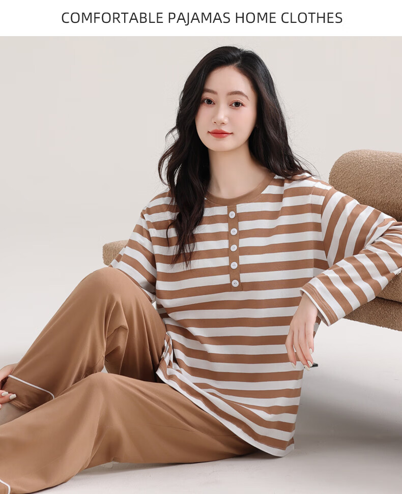 叶盼(yepan)睡衣女春秋季纯棉长袖套头薄款宽松大码休闲女款可外穿家居服套装 86020-棕白 M (160) :建议90-110斤穿着