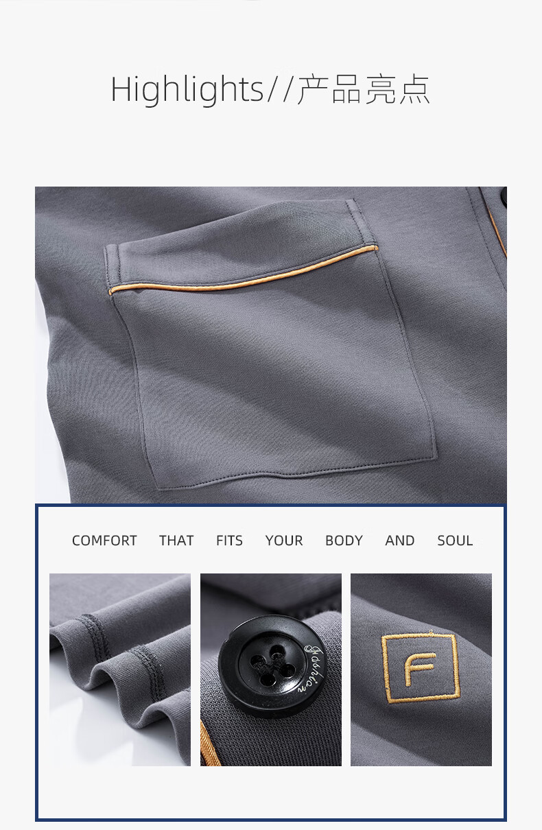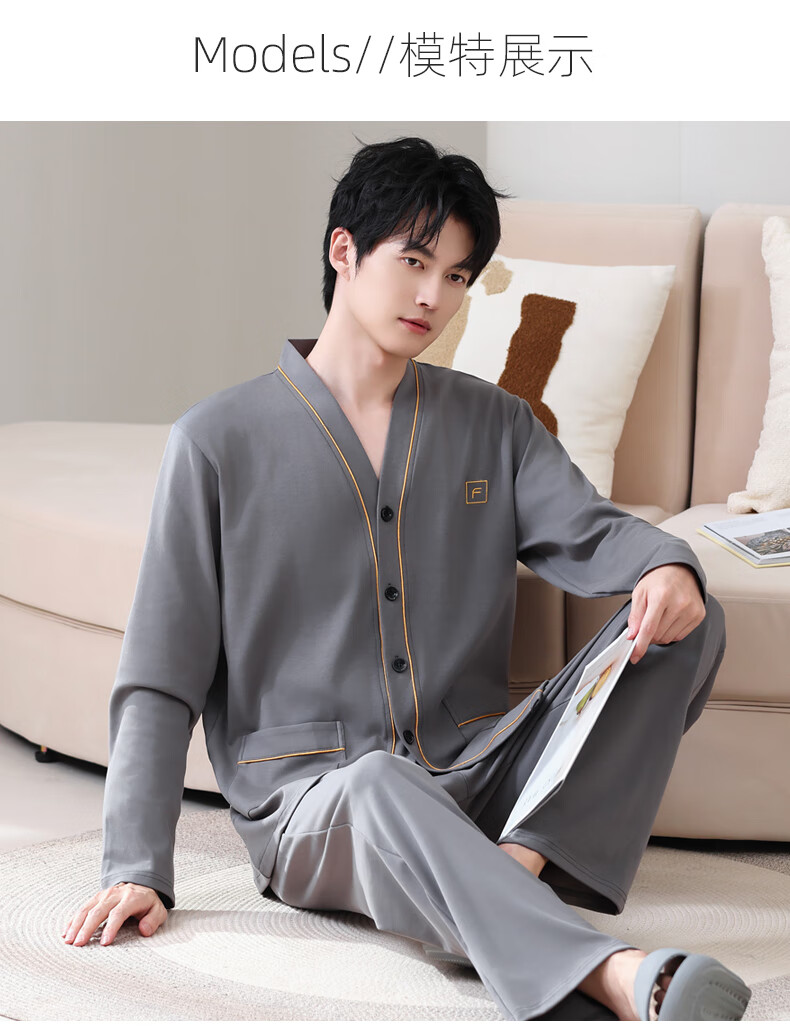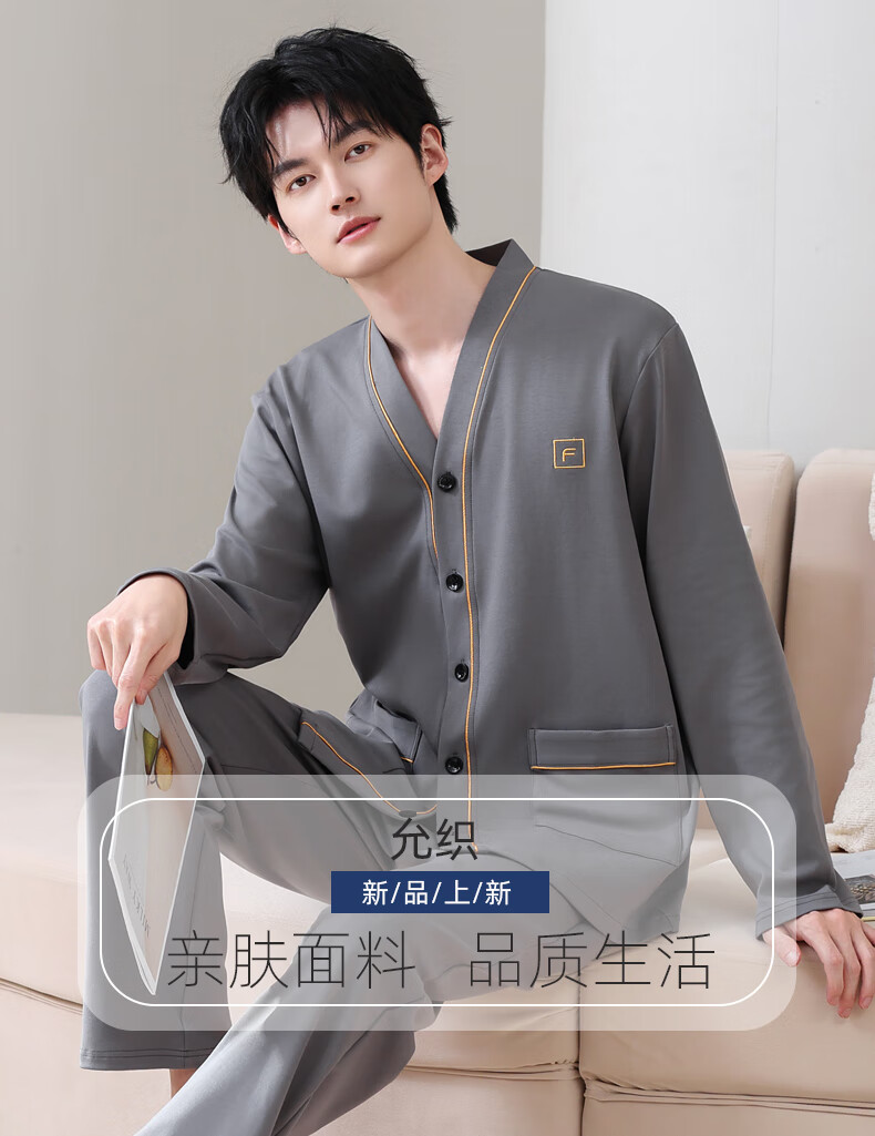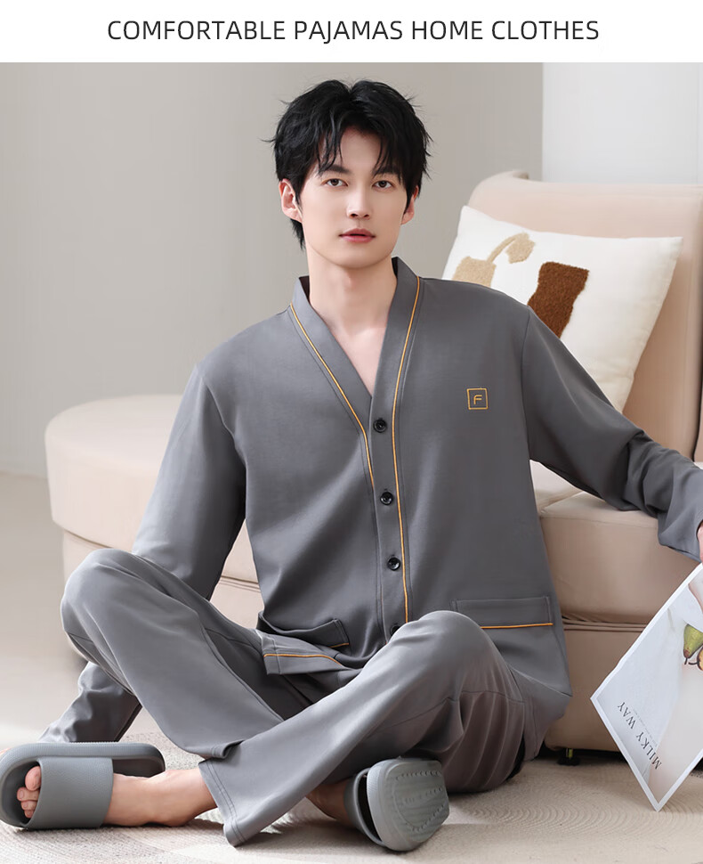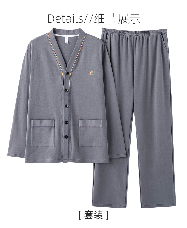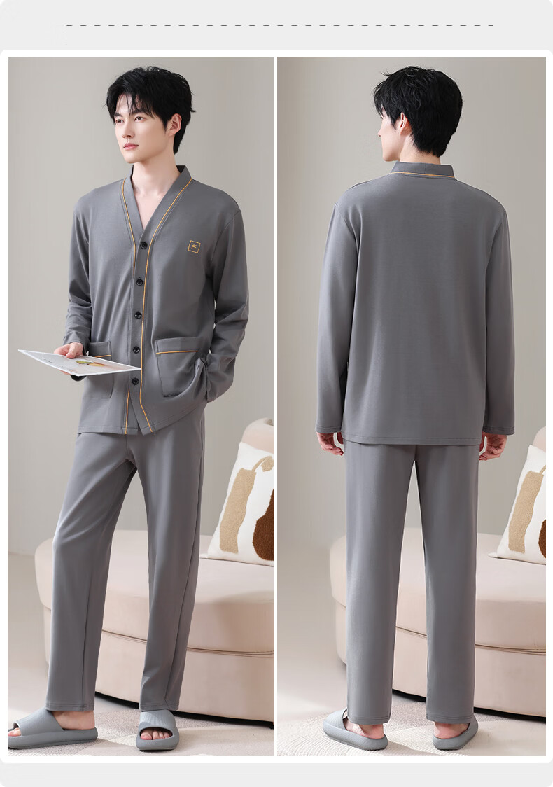 允织莱卡棉睡衣男士秋季纯棉长袖长裤开衫大码家居服春秋薄款翻领套装 8504-灰色 L (170) :建议100-135斤穿着
